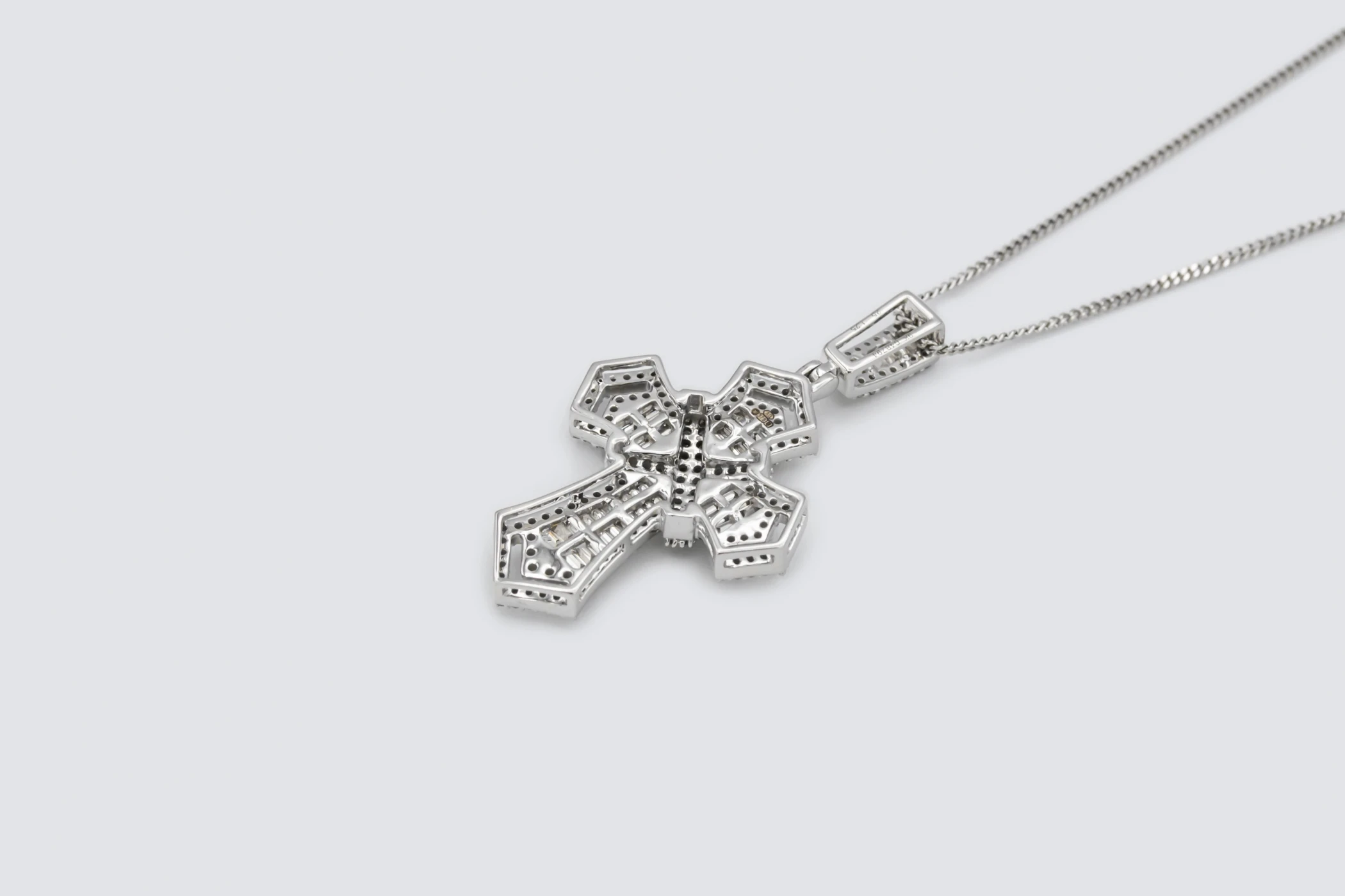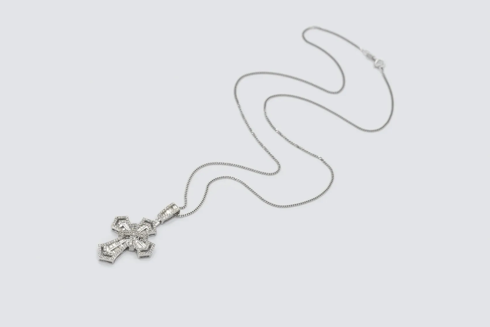 Refined and radiant, this 9ct white gold diamond cross pendant necklace embodies timeless style and exceptional craftsmanship. Adorned with 1.25 carats of natural brilliant and baguette-cut diamonds, each stone is prong set to capture and reflect light with dazzling precision.