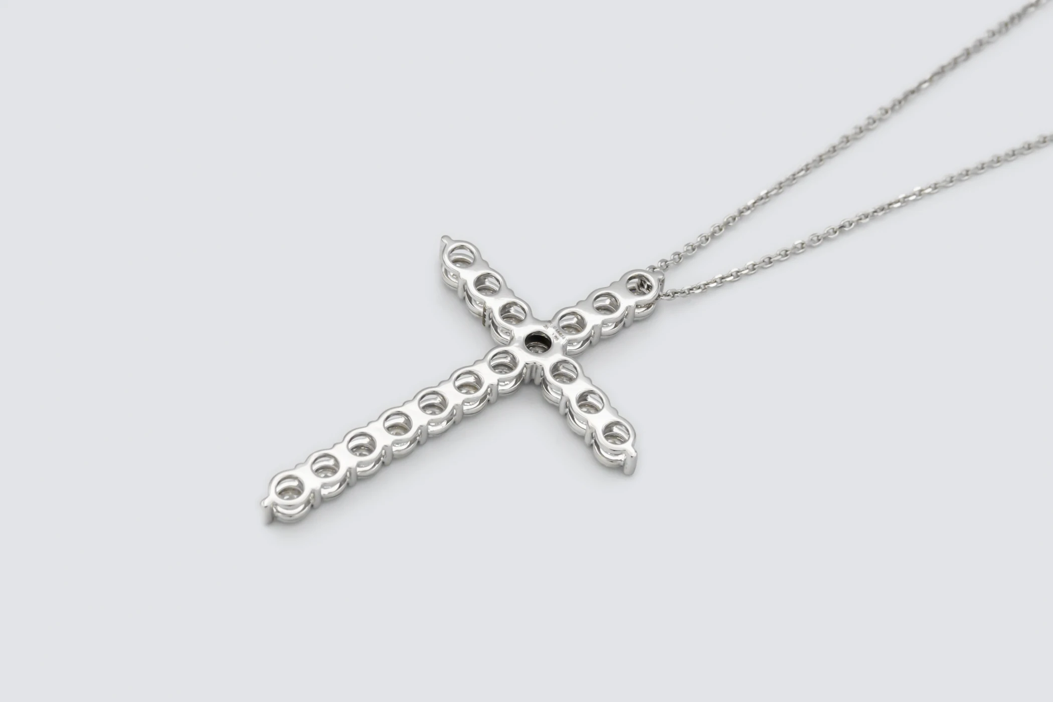 Radiant and commanding, this 9ct white gold diamond cross pendant necklace showcases the perfect balance of luxury and craftsmanship. Set with 3.09 carats of natural brilliant-cut diamonds in a refined illusion setting, each stone has been carefully positioned to create a seamless surface of dazzling brilliance.