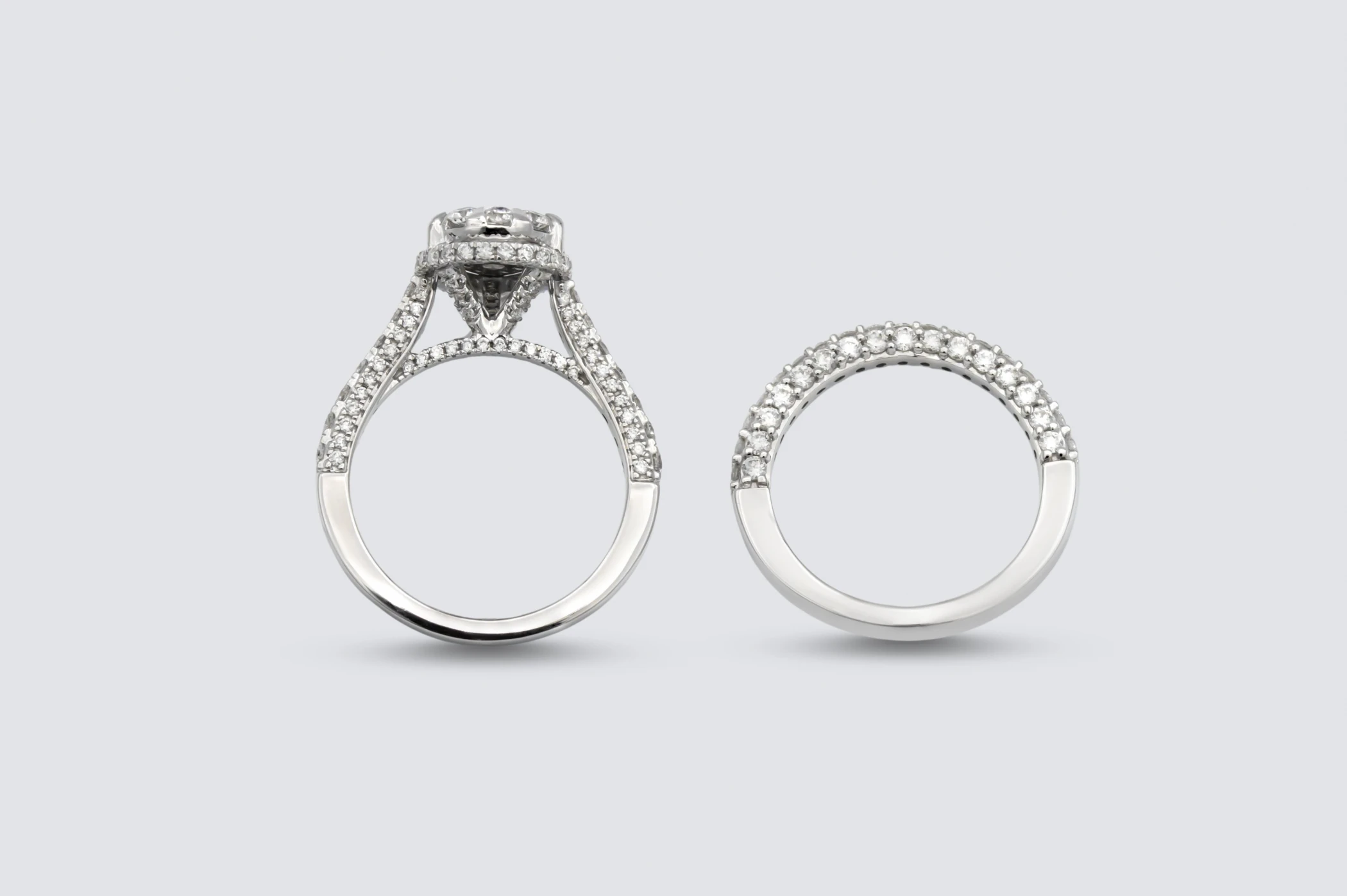 The engagement ring features a breathtaking centre diamond surrounded by shimmering accent stones, while the matching wedding band enhances the design with a perfectly coordinated row of sparkling diamonds.