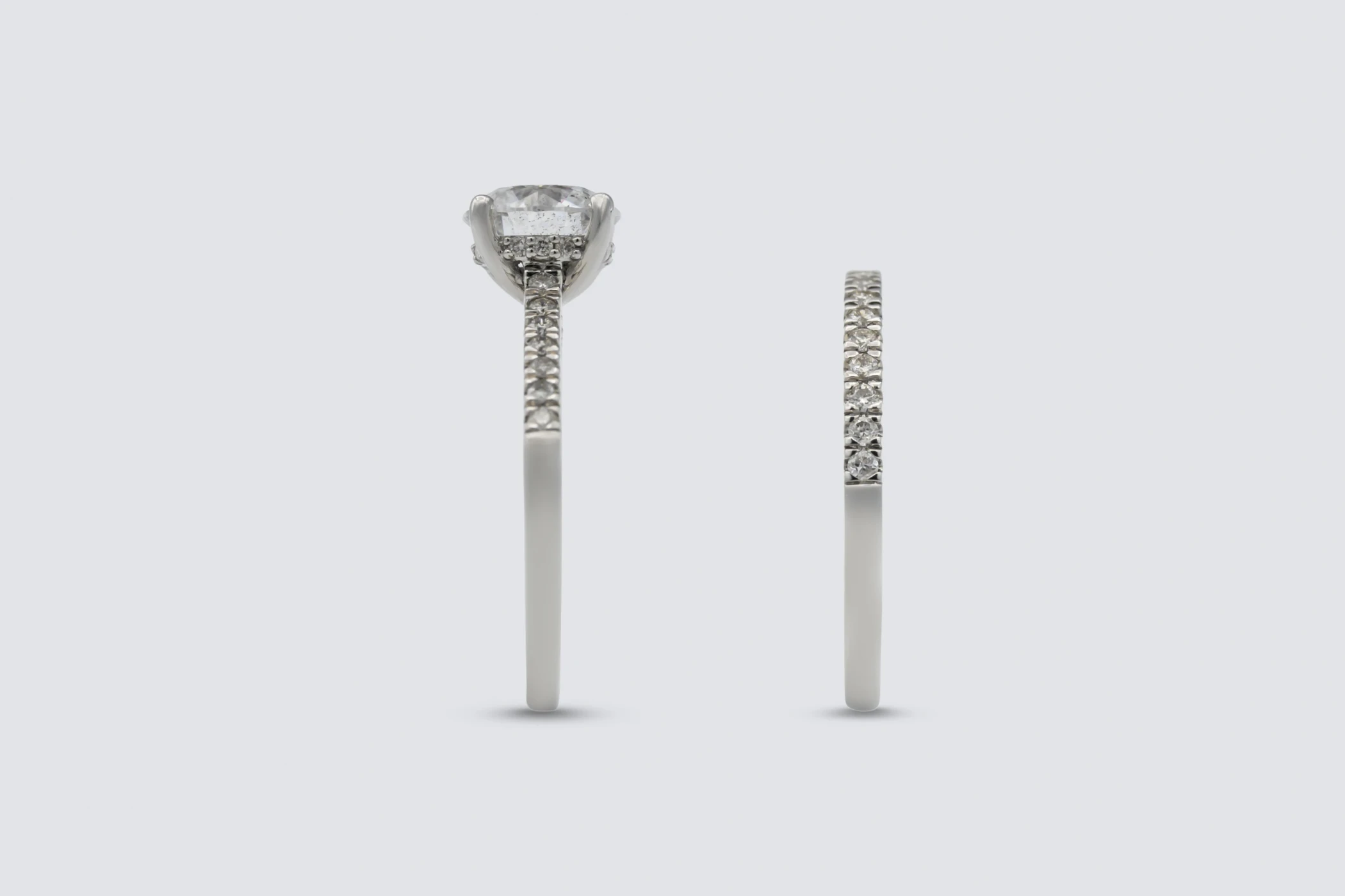 The engagement ring features a radiant centre diamond, beautifully complemented by sparkling shoulder stones, while the matching diamond-set wedding band completes the look with perfect symmetry and sophistication.