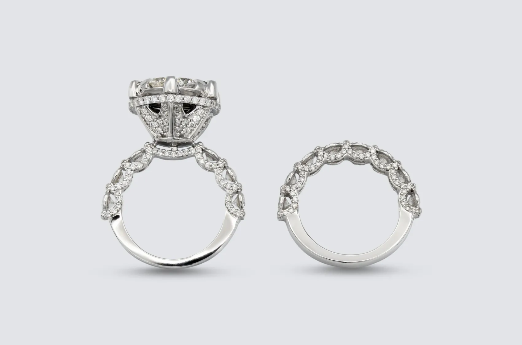 The engagement ring features a radiant central arrangement, perfectly complemented by a matching wedding band that aligns seamlessly for a harmonious and sophisticated finish.