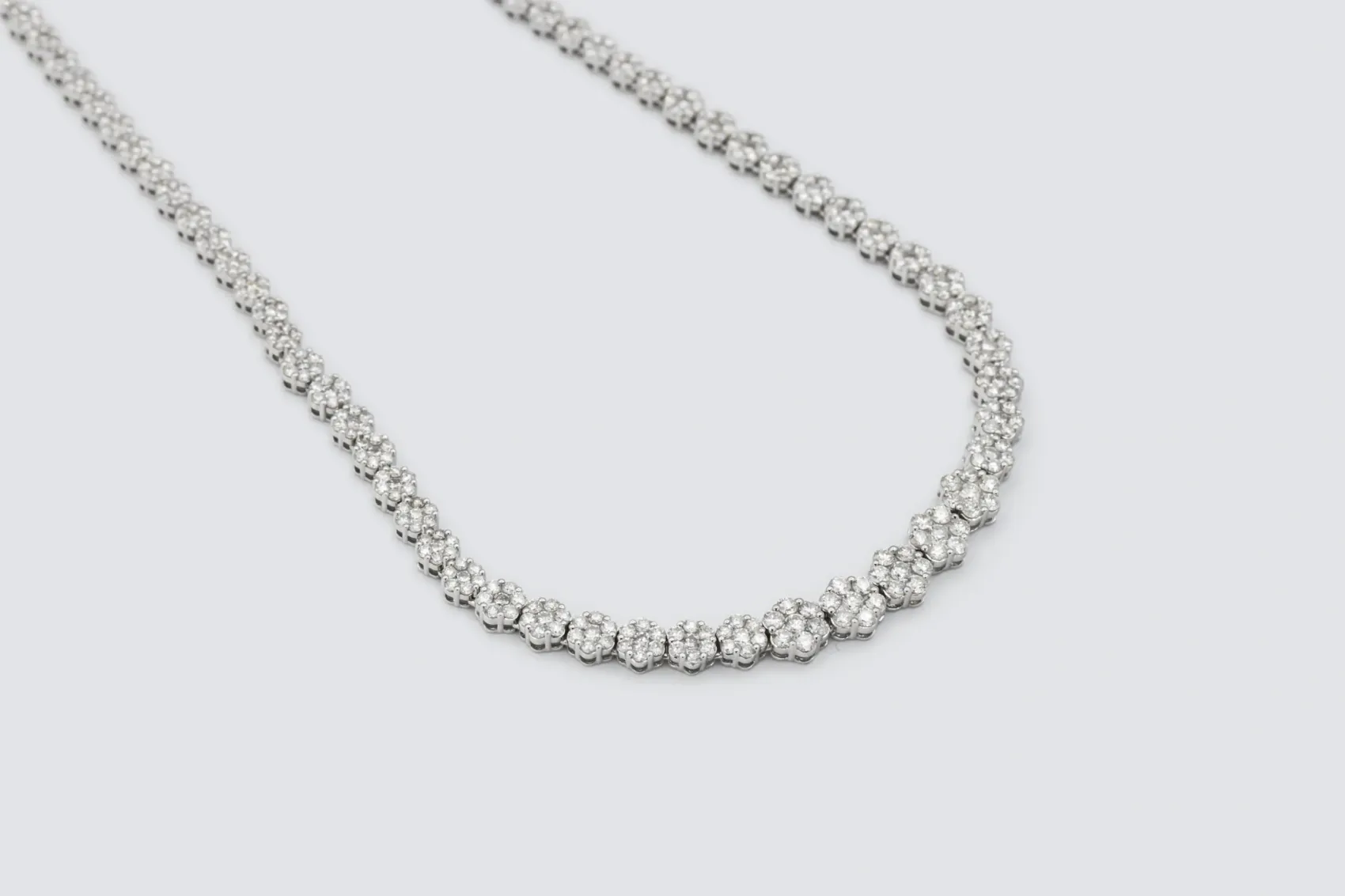 Radiating timeless elegance and refined brilliance, this 9ct white gold diamond tennis necklace is beautifully designed in a captivating flower-set style. Featuring 10.63 carats of graduated brilliant-cut natural diamonds, each stone is expertly claw set within a delicate floral-inspired arrangement, enhancing sparkle and adding a touch of romantic sophistication.