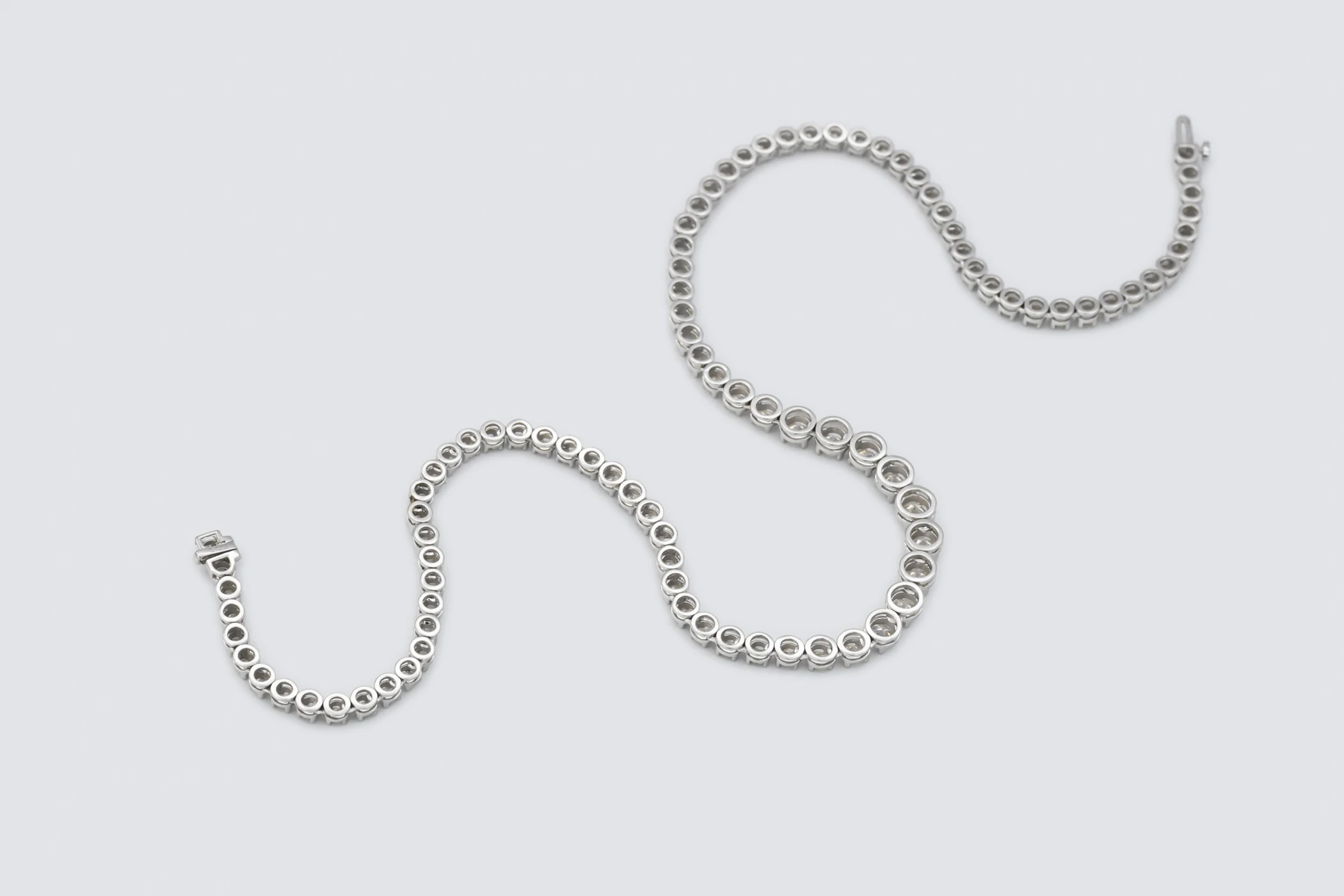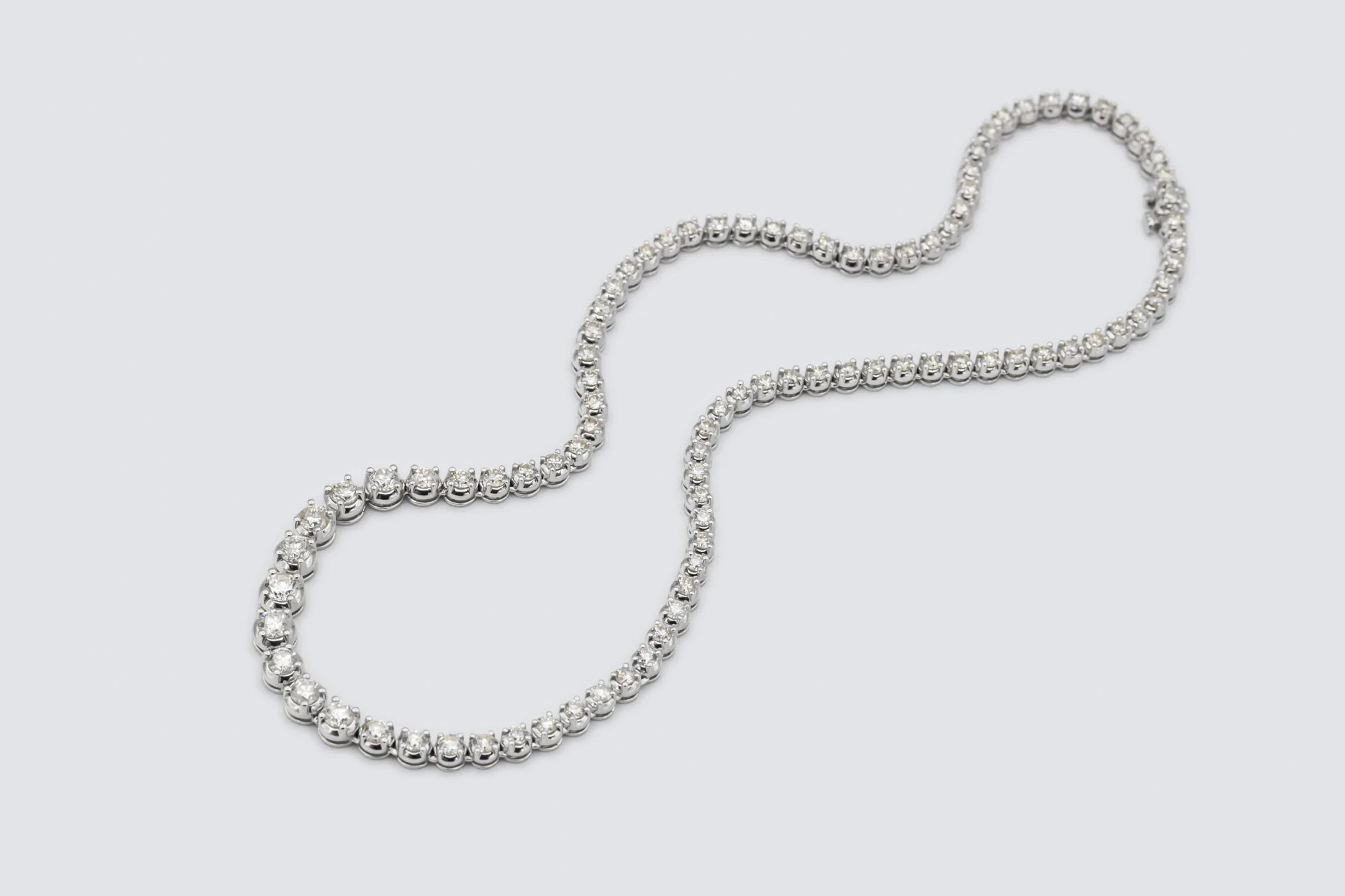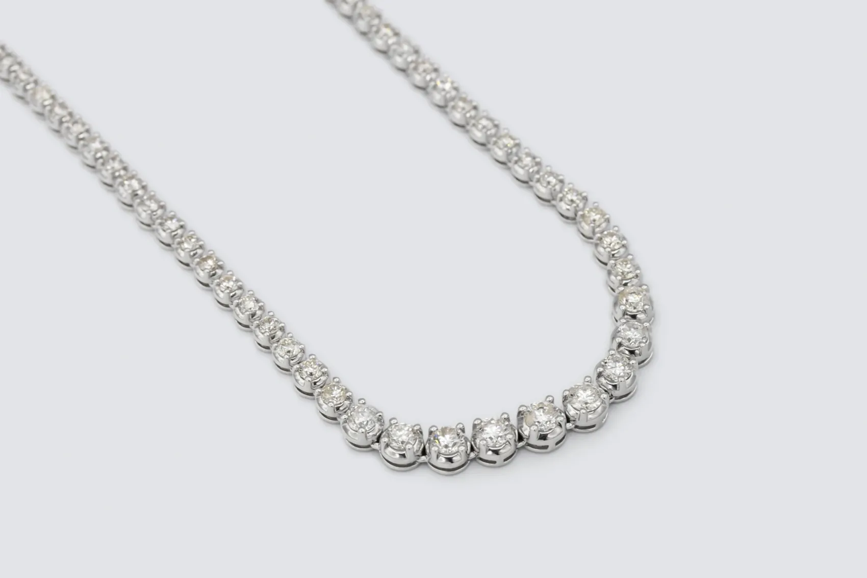 The gentle graduation in diamond size creates a refined flow that enhances the neckline with effortless grace.