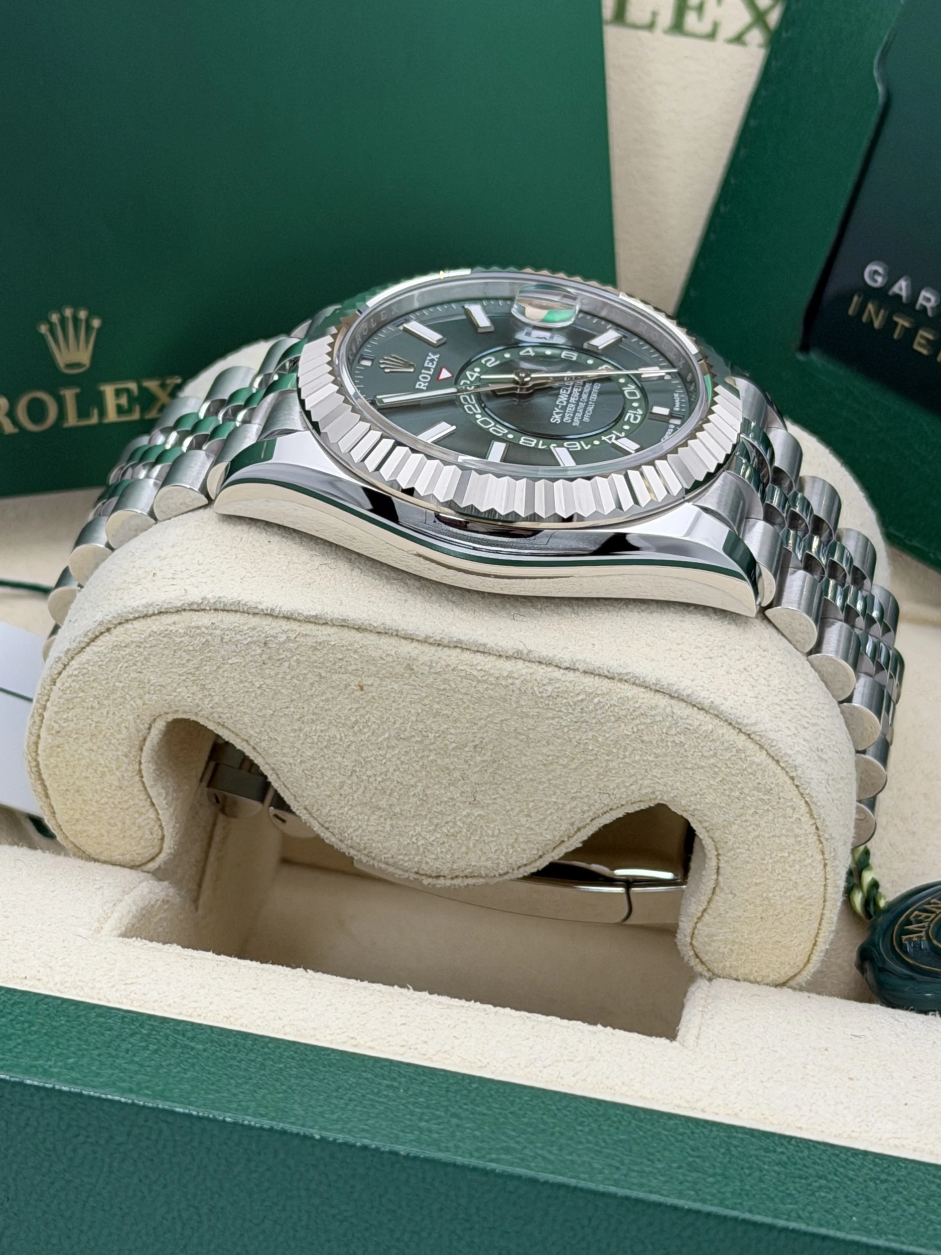This Rolex Sky-Dweller 336934 features a striking mint green dial, a white gold fluted bezel, and the elegant Jubilee bracelet. Powered by Rolex’s advanced annual calendar and dual-time automatic movement, this 42mm Sky-Dweller offers exceptional functionality and modern luxury, presented in excellent condition.