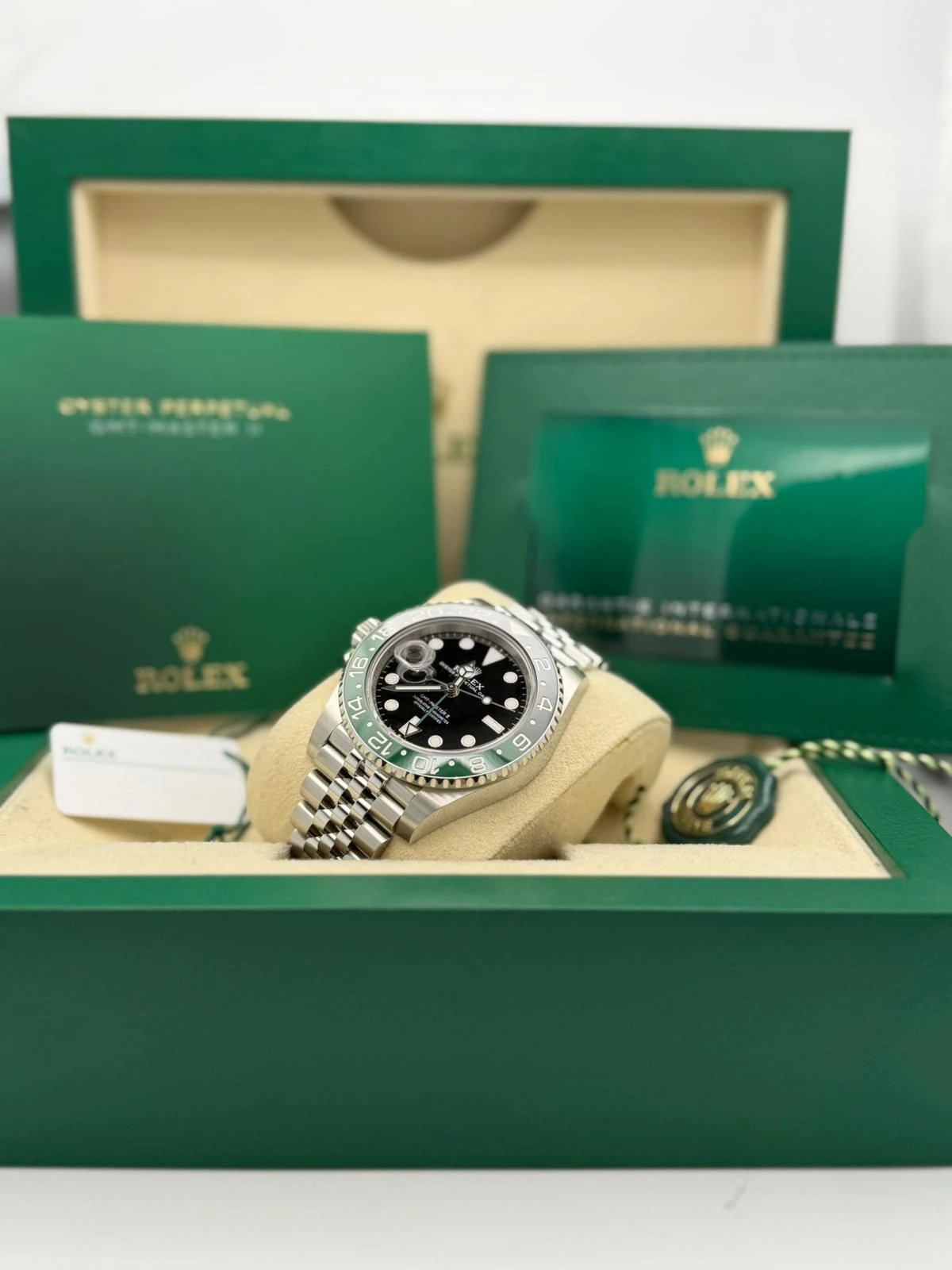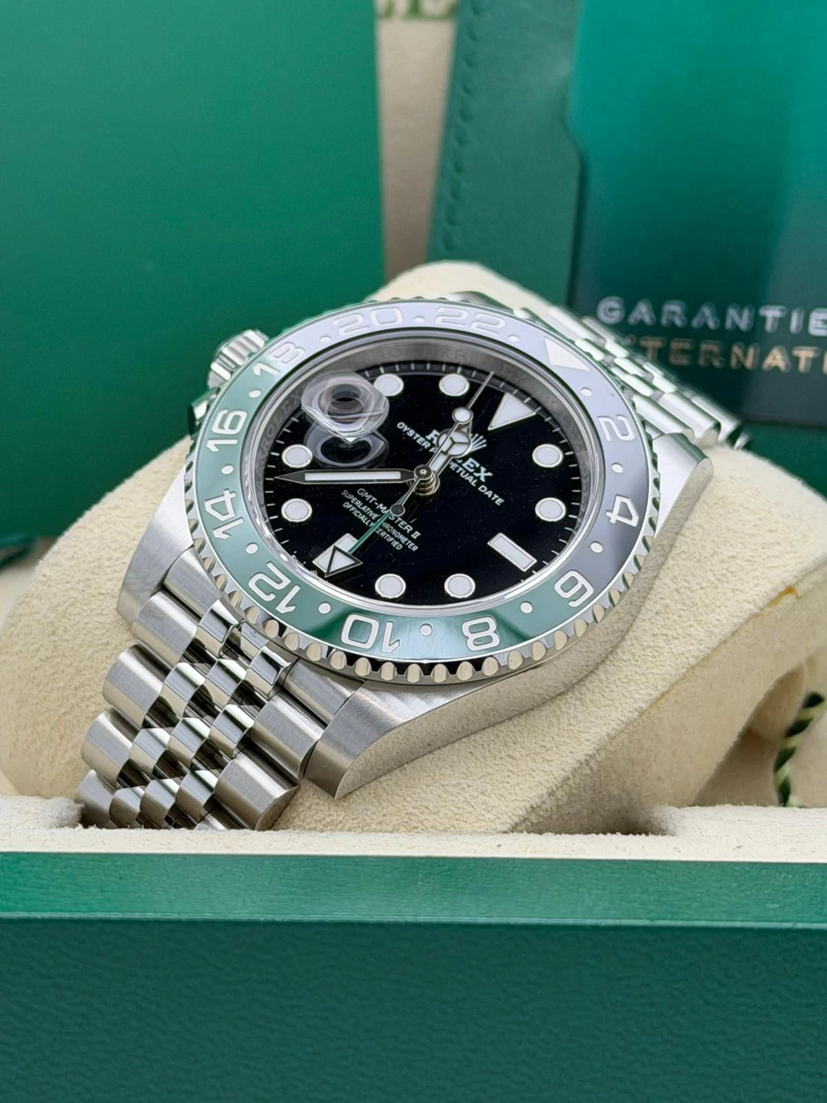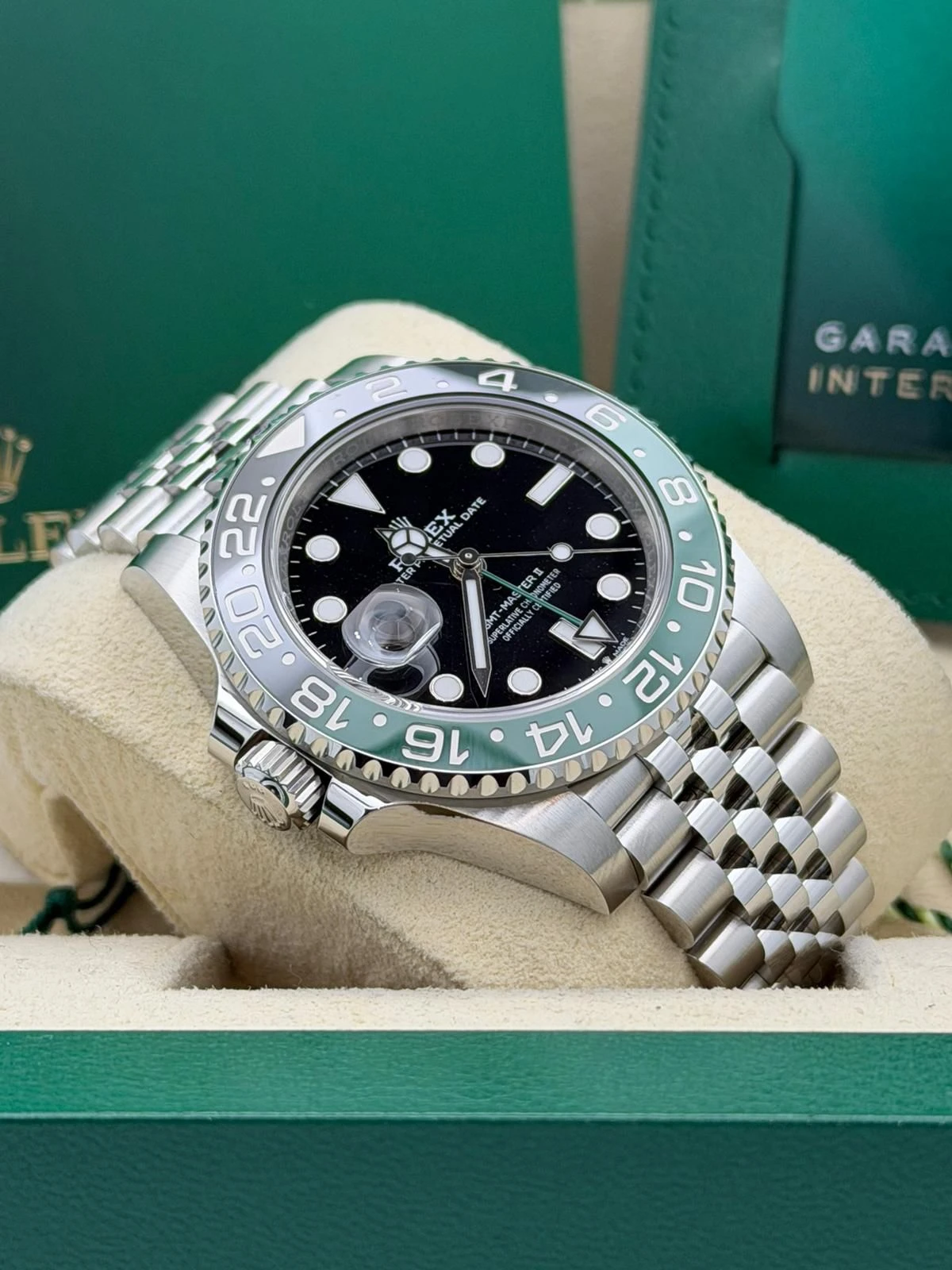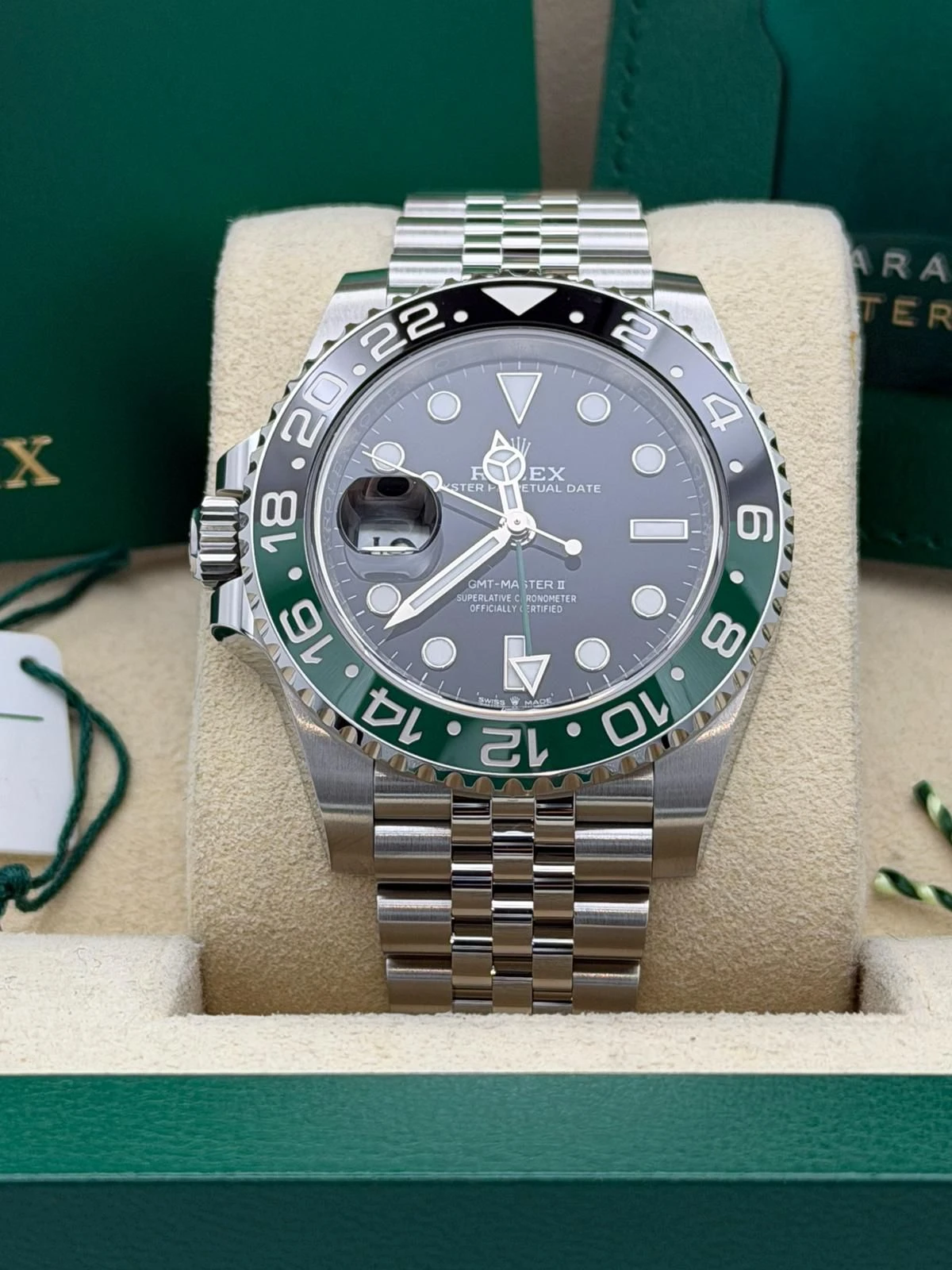This Rolex GMT-Master II reference 126720VTNR features a 40mm stainless steel Oyster case, the distinctive green and black Cerachrom bezel, and the highly desirable stainless steel Jubilee bracelet. Known as the left-hand-drive “Sprite,” this unworn 2025 model is powered by Rolex’s automatic calibre 3285 movement, offering exceptional accuracy, a 70-hour power reserve, and independent GMT functionality—ideal for frequent travellers and collectors alike.