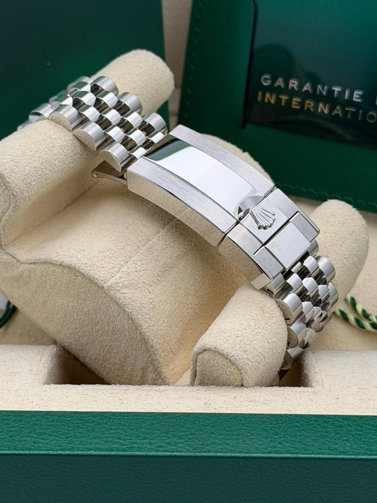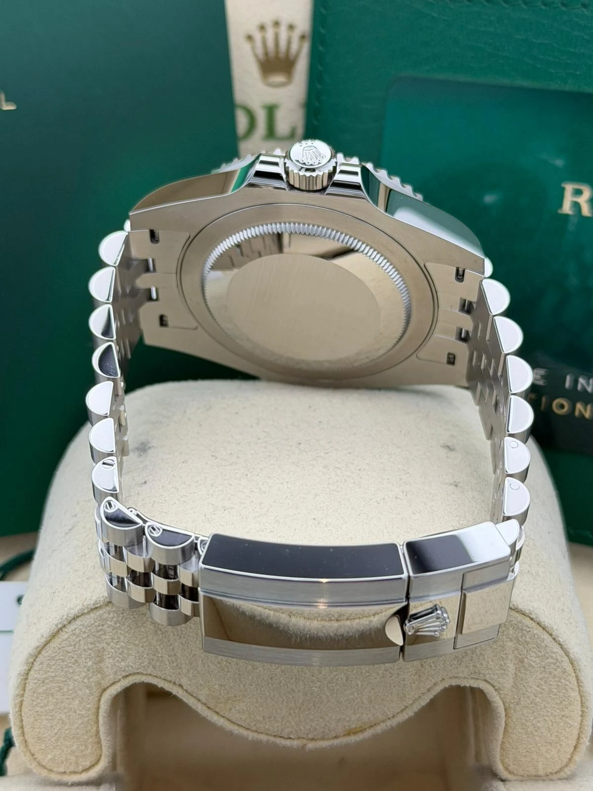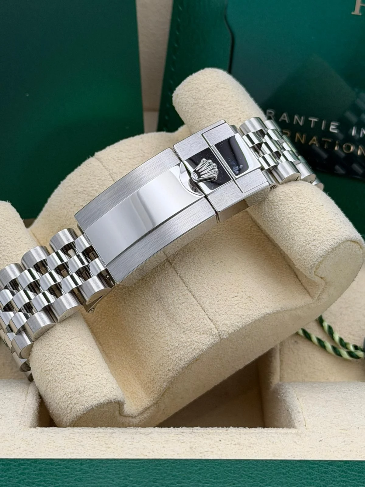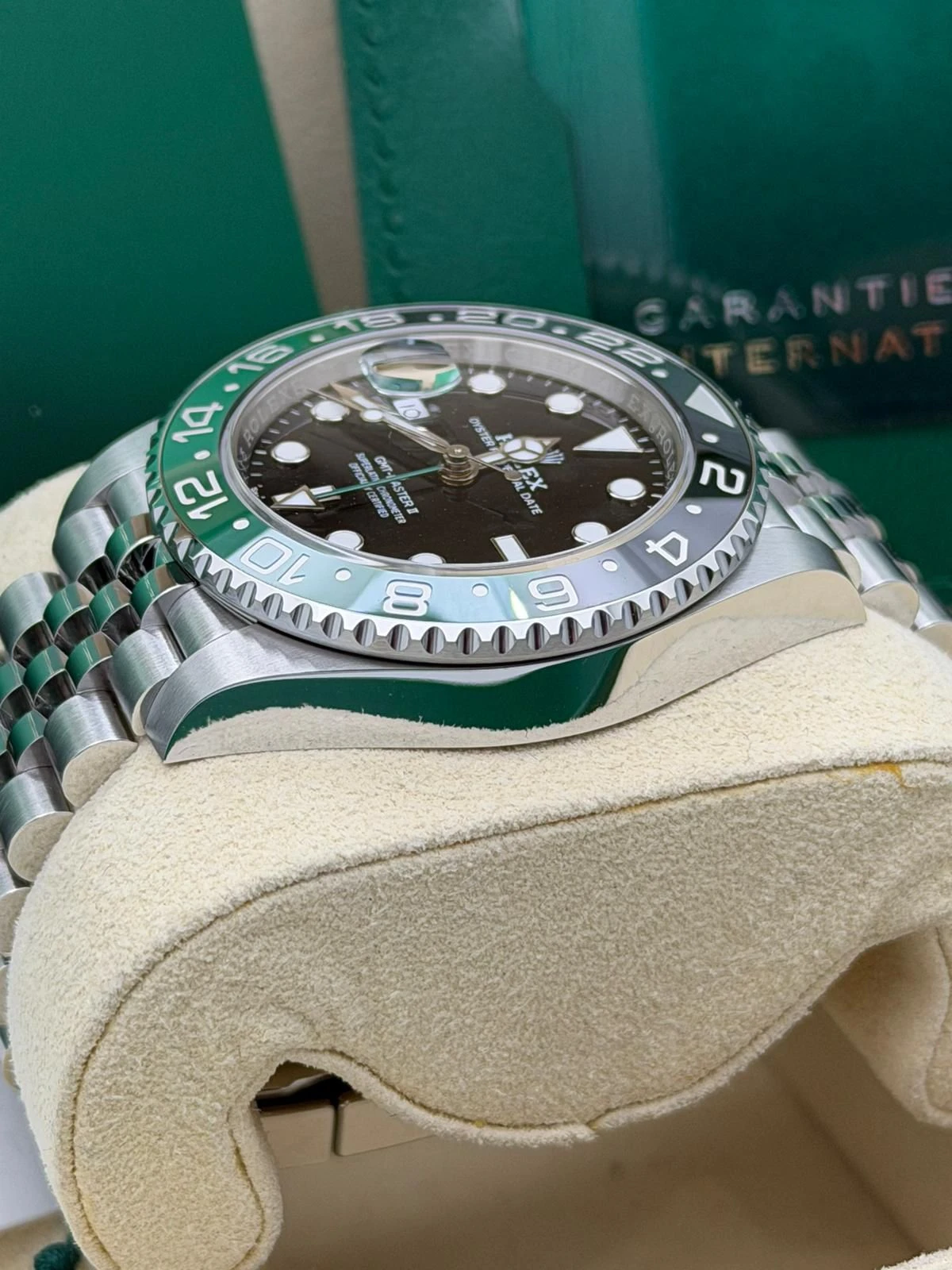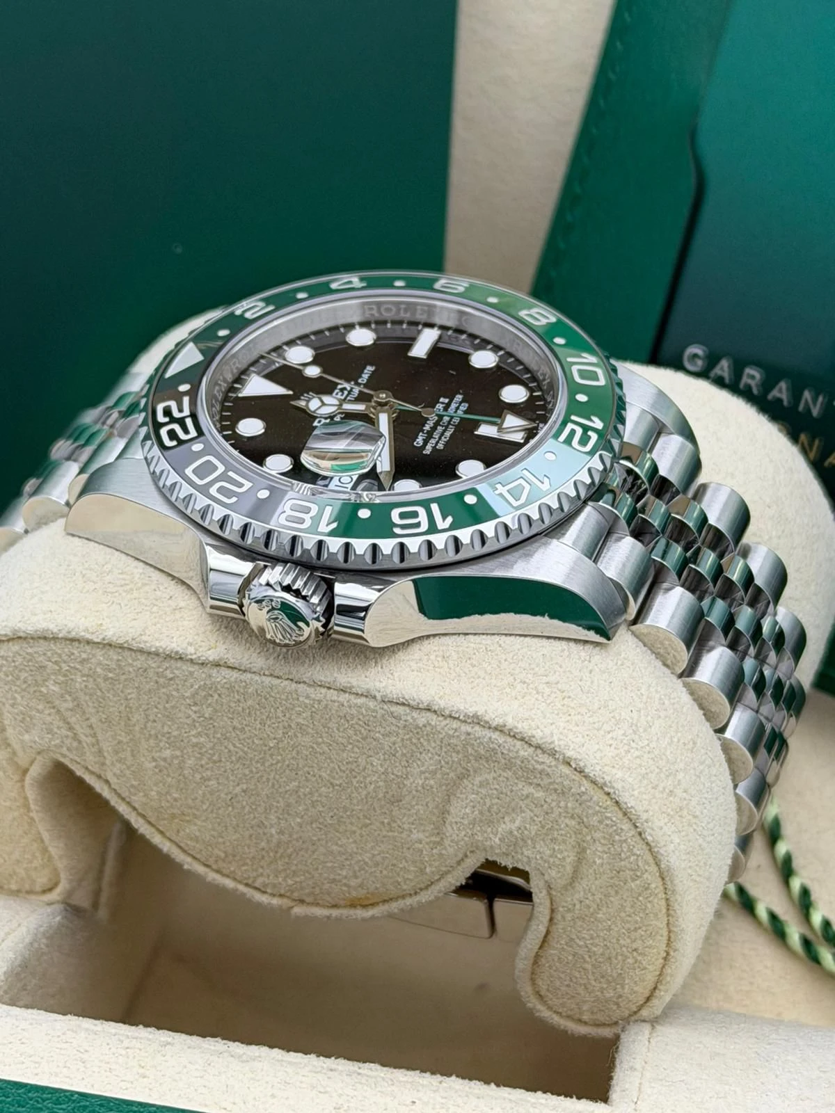 This Rolex GMT-Master II reference 126720VTNR features a 40mm stainless steel Oyster case, the distinctive green and black Cerachrom bezel, and the highly desirable stainless steel Jubilee bracelet. Known as the left-hand-drive “Sprite,” this unworn 2025 model is powered by Rolex’s automatic calibre 3285 movement, offering exceptional accuracy, a 70-hour power reserve, and independent GMT functionality—ideal for frequent travellers and collectors alike.