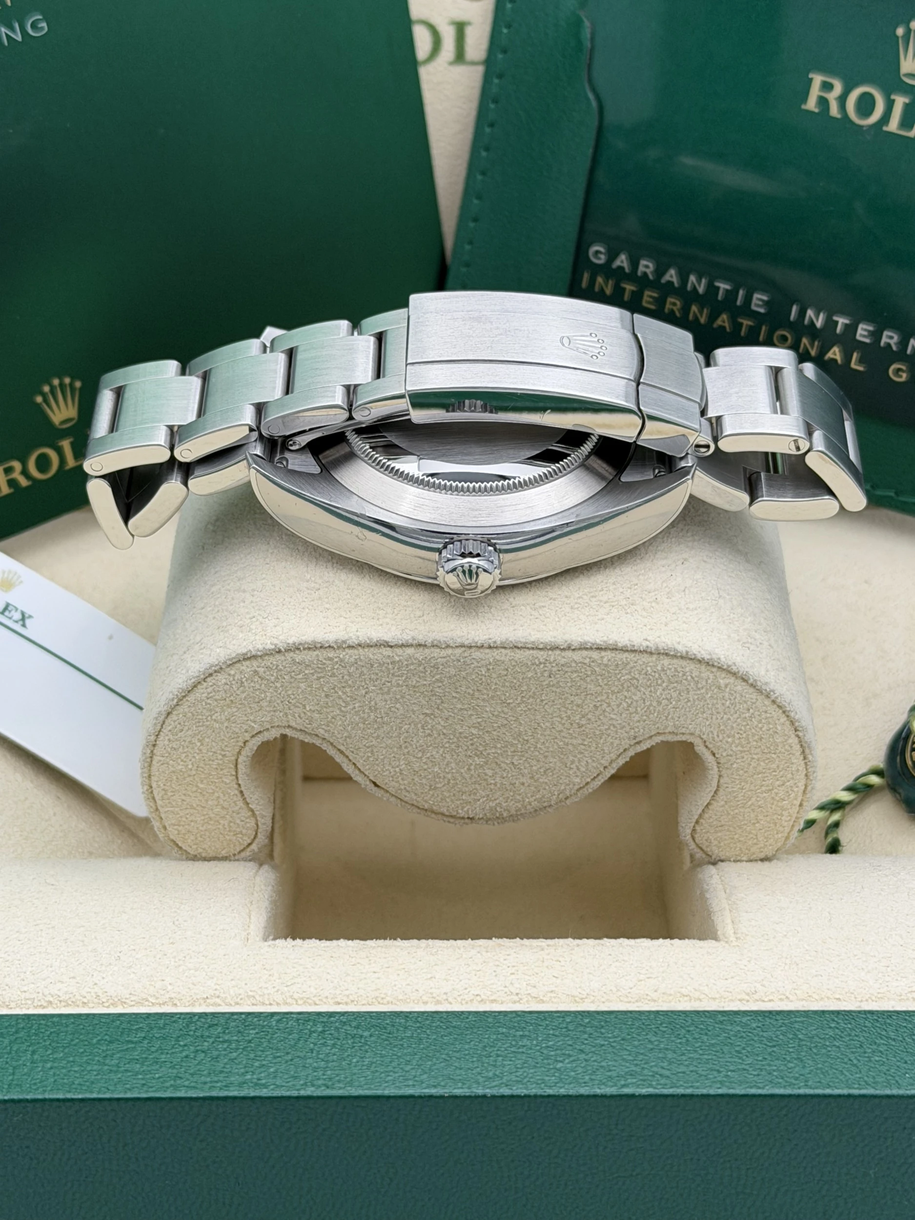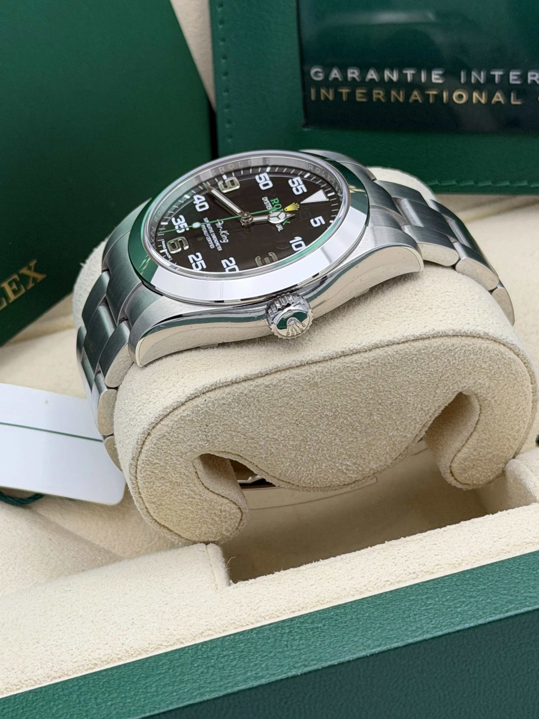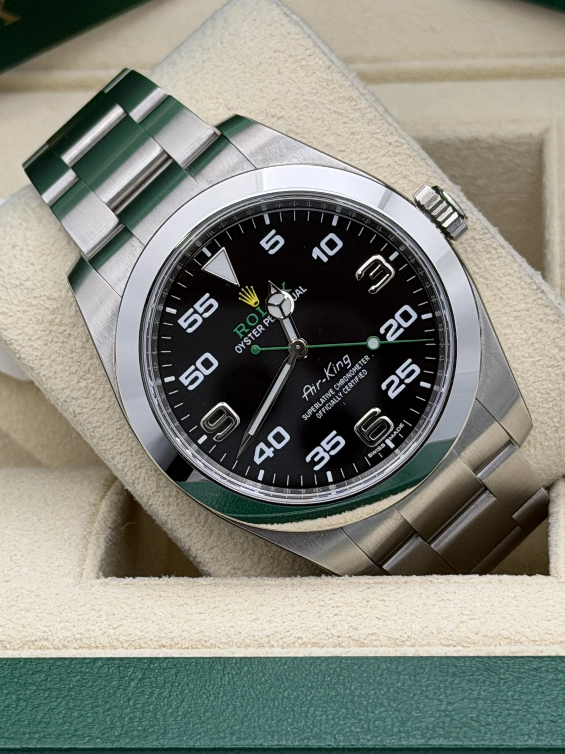 This Rolex Air-King 40 features a stainless steel case with a smooth bezel, a black dial with signature Arabic numerals, and the classic Oyster bracelet, powered by Rolex’s automatic movement, offered in excellent condition.