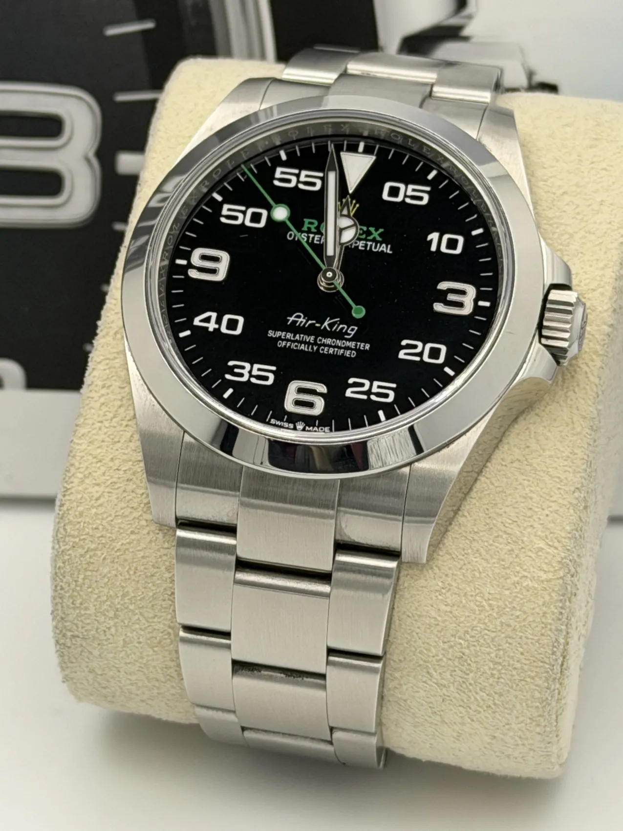 This Rolex Air-King, reference 126900, features a 40mm stainless steel case paired with a matching stainless steel Oyster bracelet and a smooth domed bezel. The updated 2022 model introduces significant upgrades, including crown guards, a redesigned dial layout for enhanced legibility, and improved case proportions that give the Air-King a sportier, more modern presence.Equipped with the advanced Rolex calibre 3230 automatic movement, this Air-King delivers exceptional accuracy, a 70-hour power reserve, and superior anti-magnetic performance. The black dial with contrasting white Arabic numerals and green seconds hand maintains the model’s aviation-inspired identity, while its robust Oyster case and sapphire crystal ensure everyday durability.