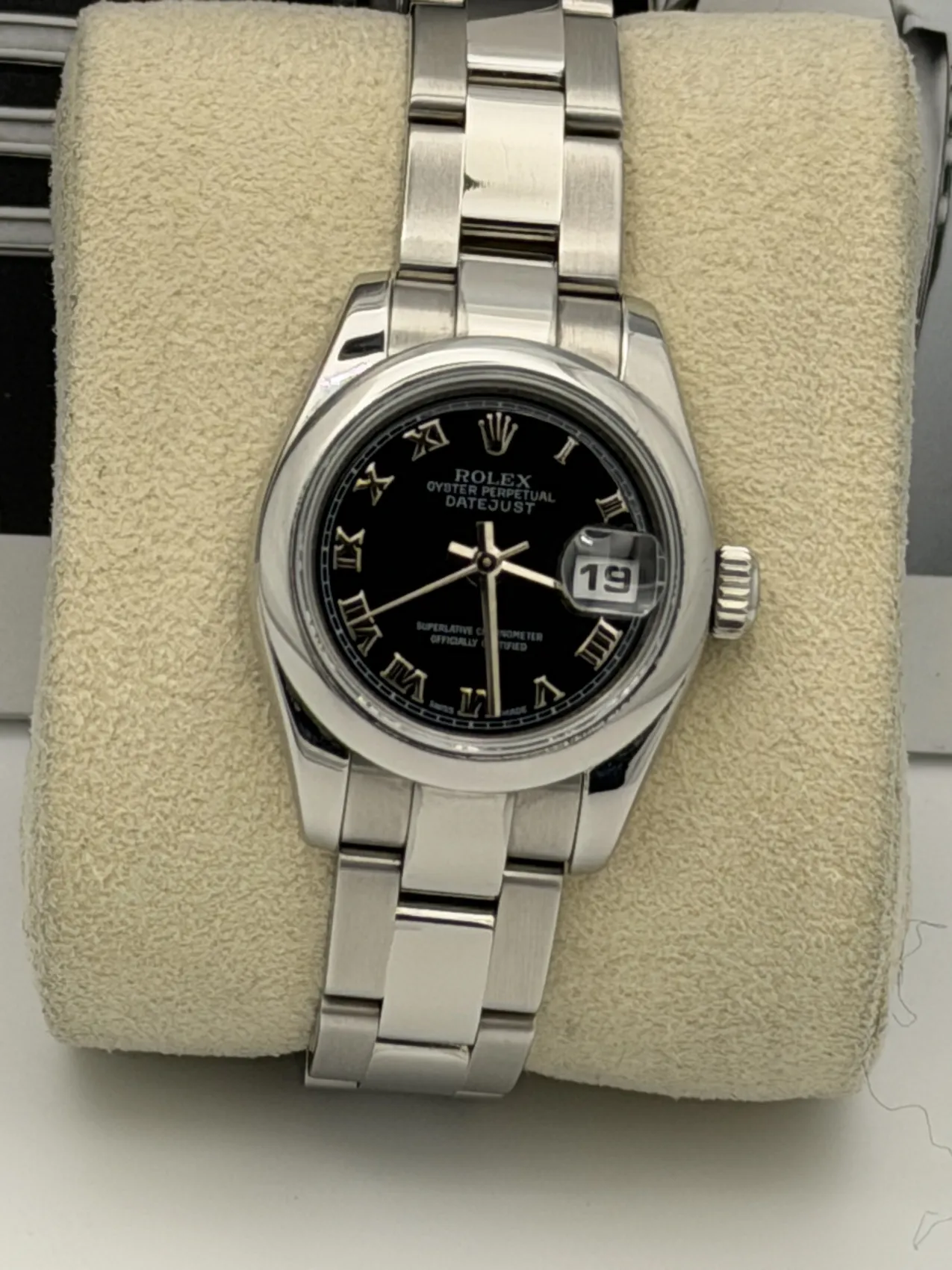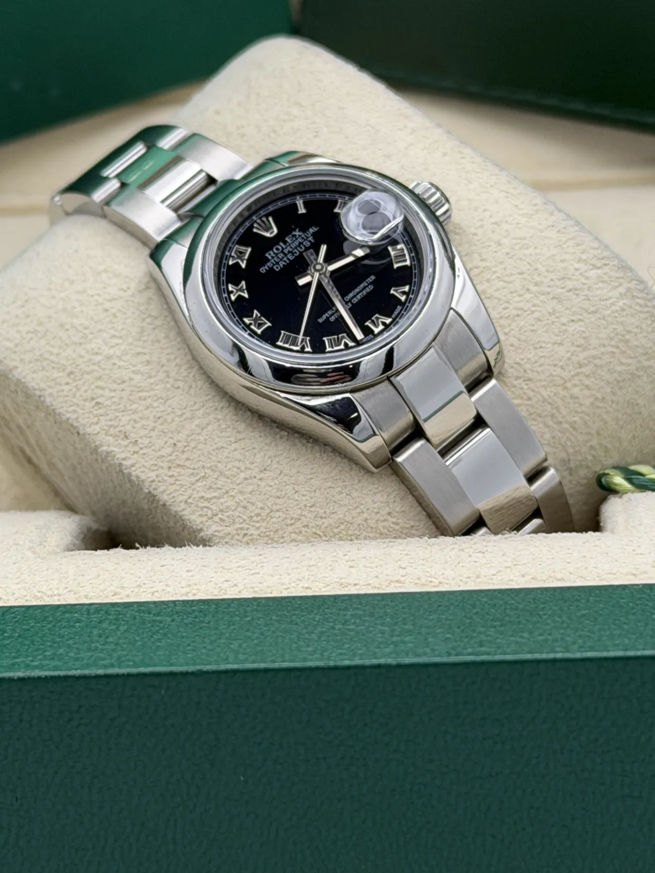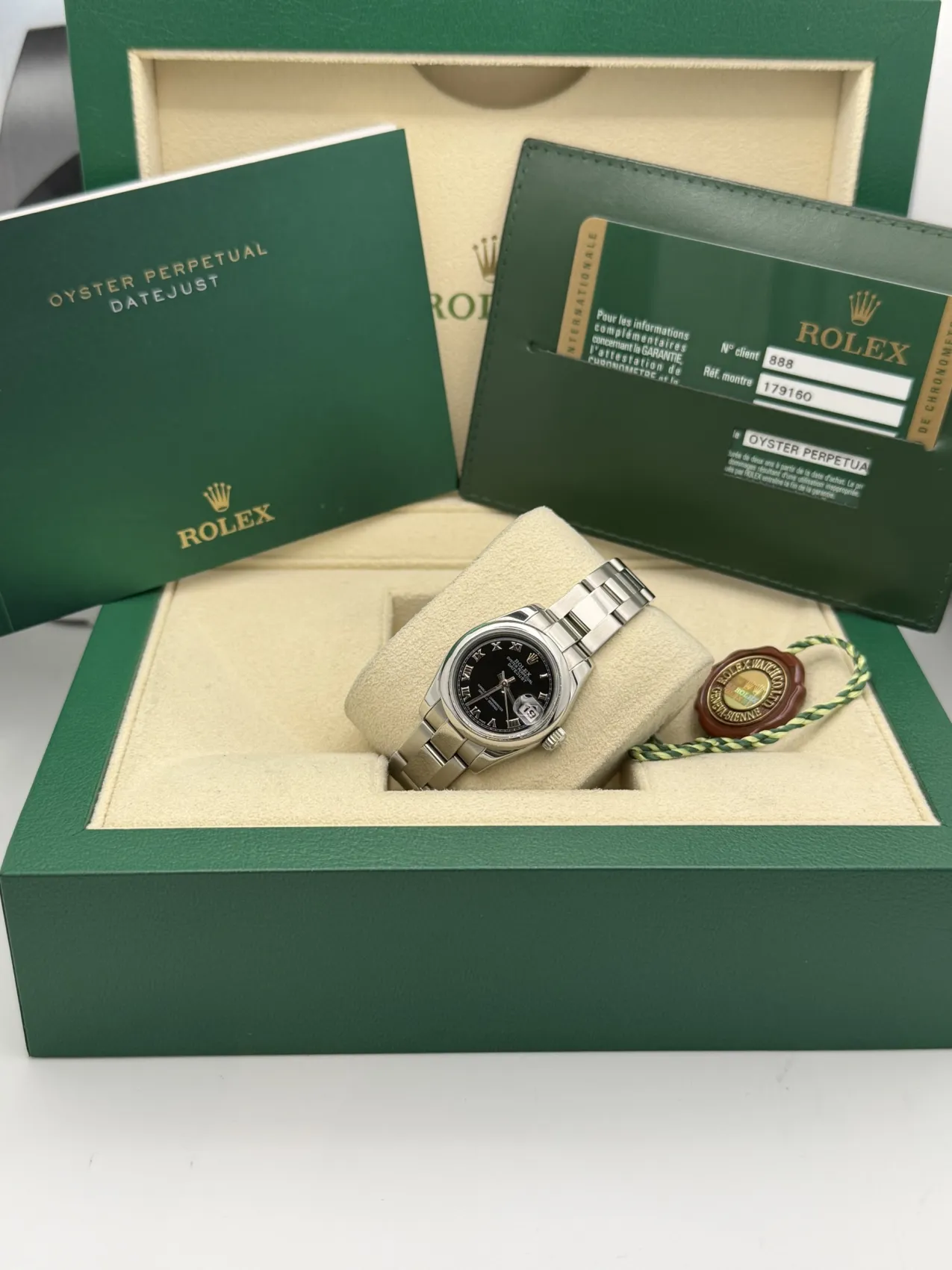 This Rolex Datejust 26 reference 179160 features a black dial, smooth stainless steel bezel, and the classic Oyster bracelet. Powered by Rolex’s automatic movement and presented in excellent condition, this 2007 Lady-Datejust offers a timeless and versatile design suitable for everyday wear.
