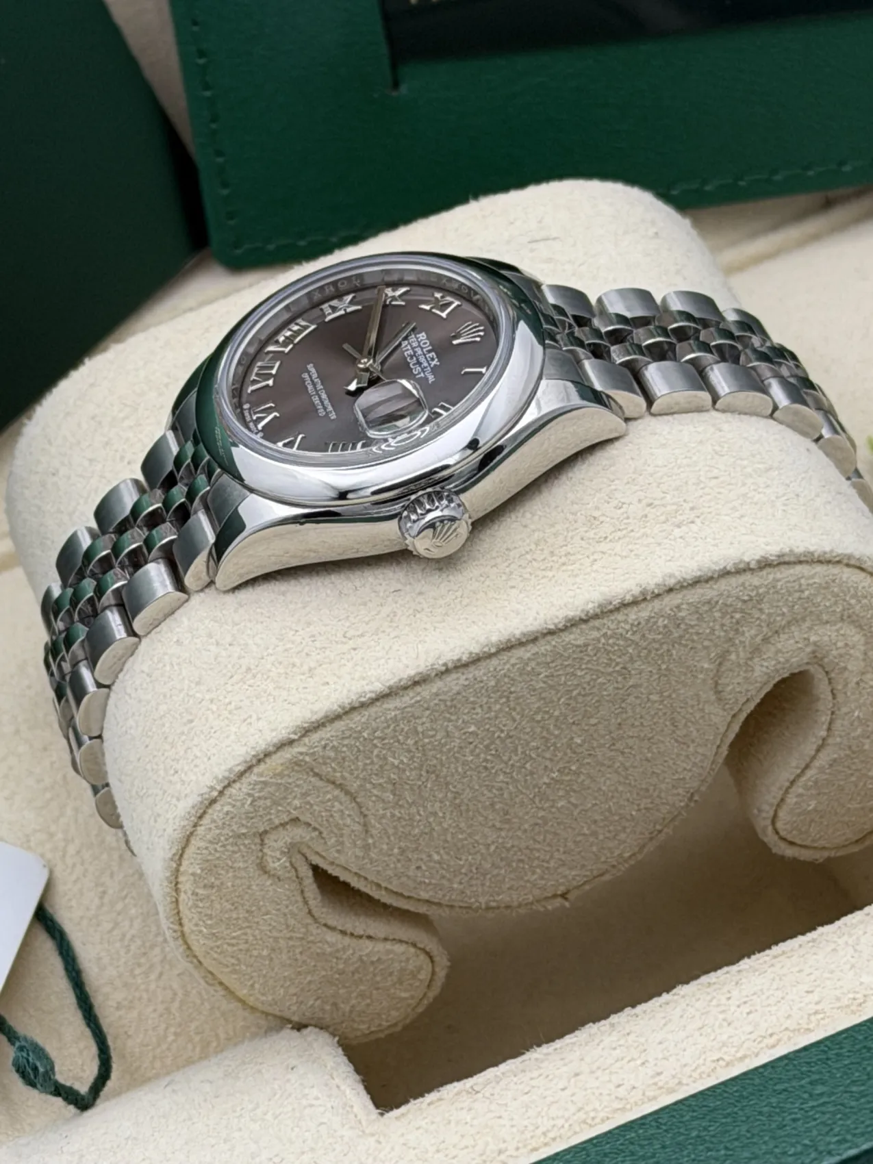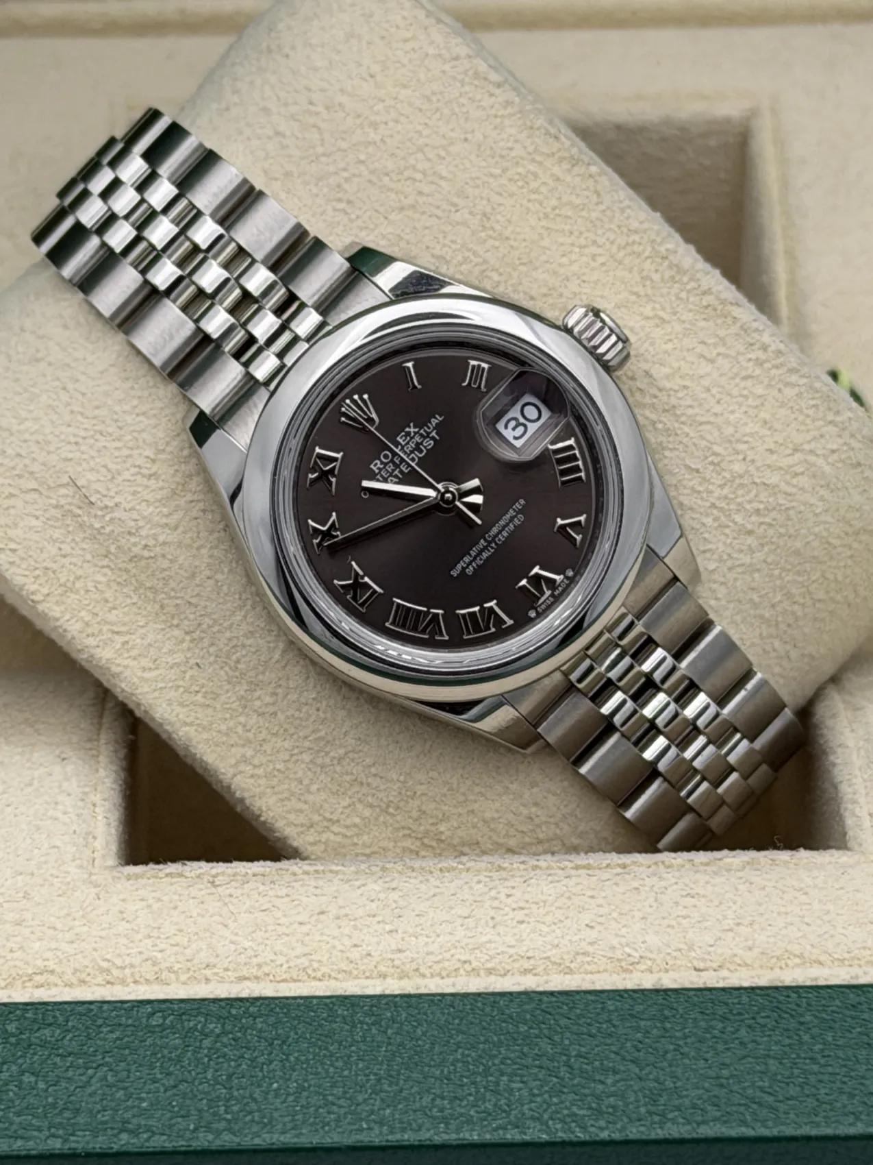 This Rolex Datejust 28mm reference 279160 features a stainless steel Oystersteel case paired with a sophisticated slate grey dial and smooth polished bezel. The elegant sunburst finish and classic baton hour markers create a refined and versatile look suited to both everyday wear and formal occasions.Fitted to the iconic five-link Jubilee bracelet, the watch offers exceptional comfort and timeless Rolex styling. Powered by the Rolex calibre 2236 automatic movement with Syloxi silicon hairspring, it delivers outstanding precision and reliability with approximately 55 hours of power reserve.Presented in excellent 2024 condition, this modern Datejust 28 combines contemporary performance with classic Rolex elegance, making it a perfect choice for those seeking a refined and understated luxury watch.