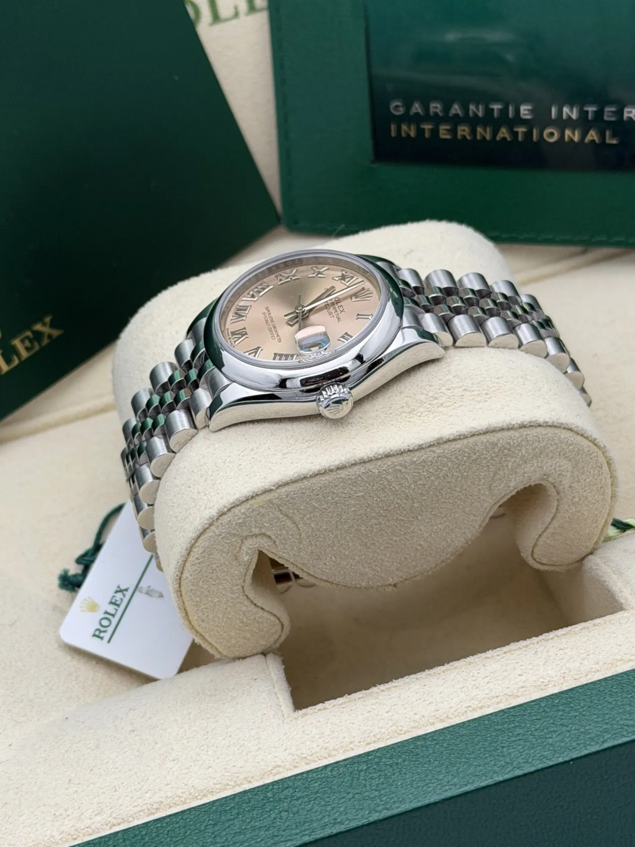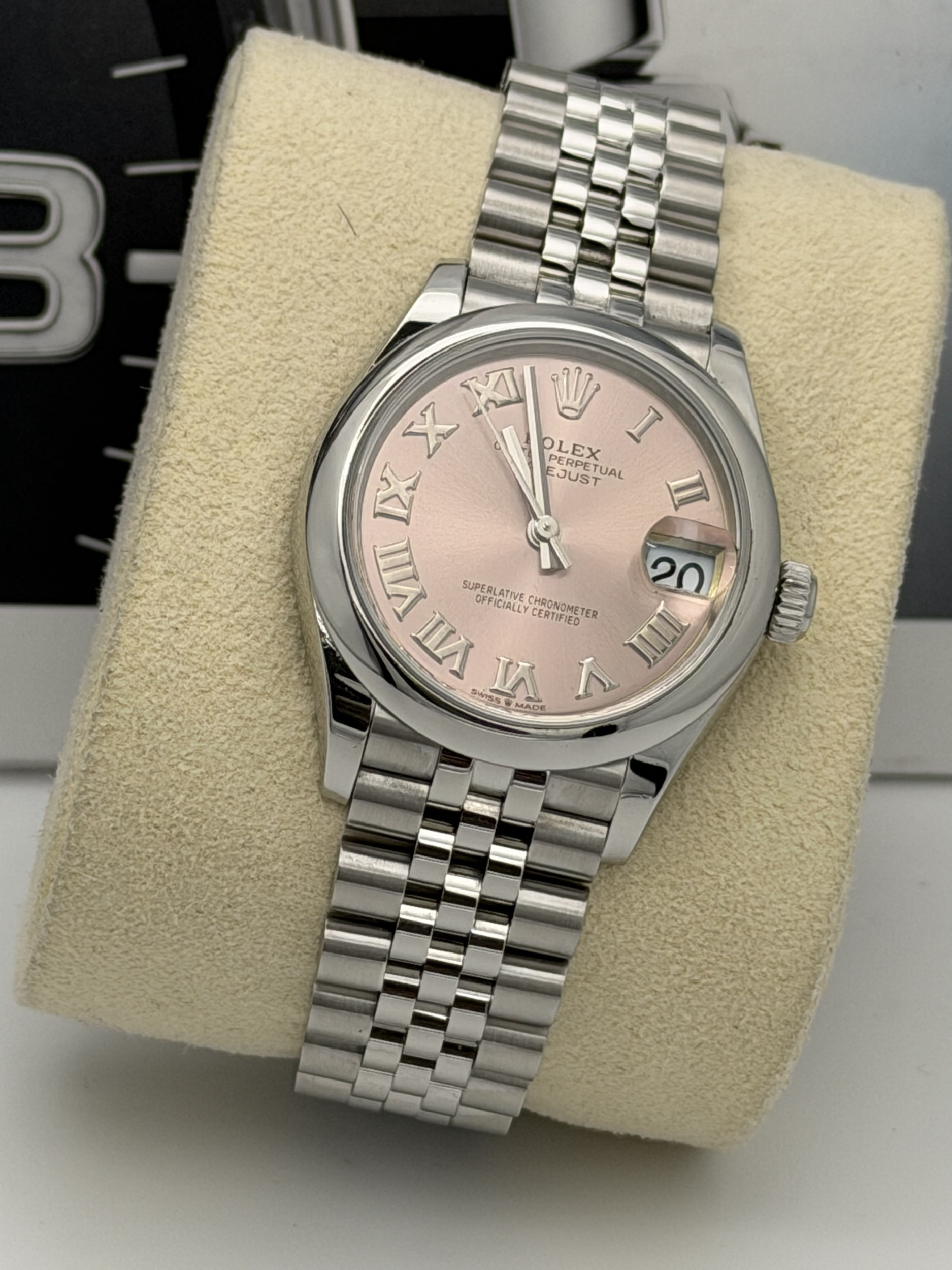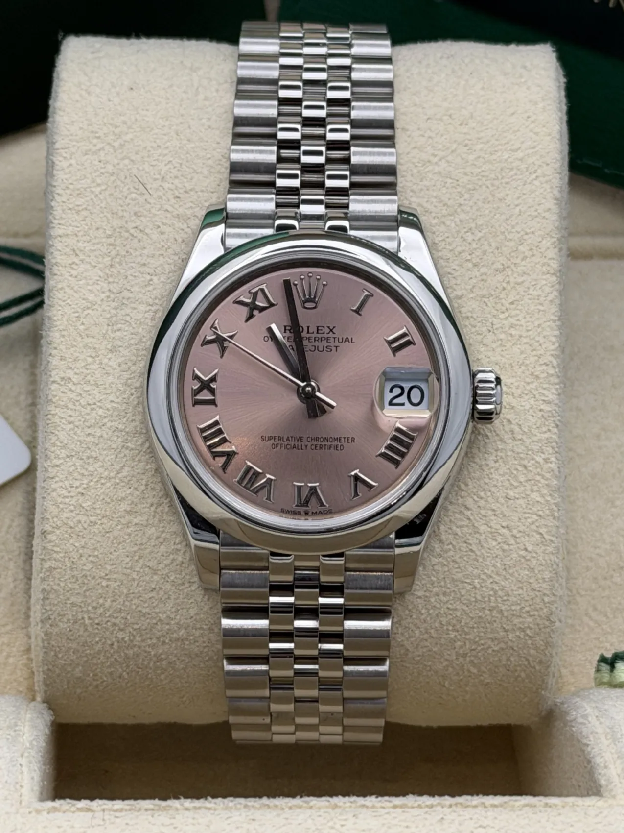 This Rolex Datejust 31 features a 31mm stainless steel case, smooth polished bezel, pink Roman numeral dial, Jubilee bracelet, and the Calibre 2236 automatic movement, offered in excellent condition.