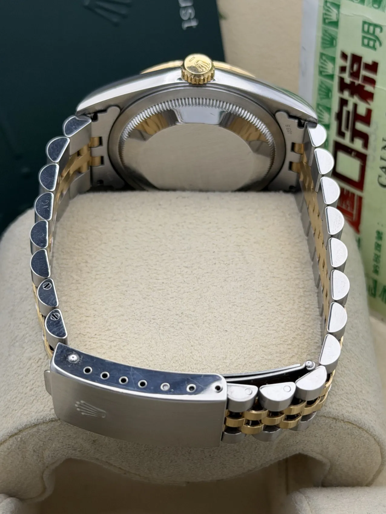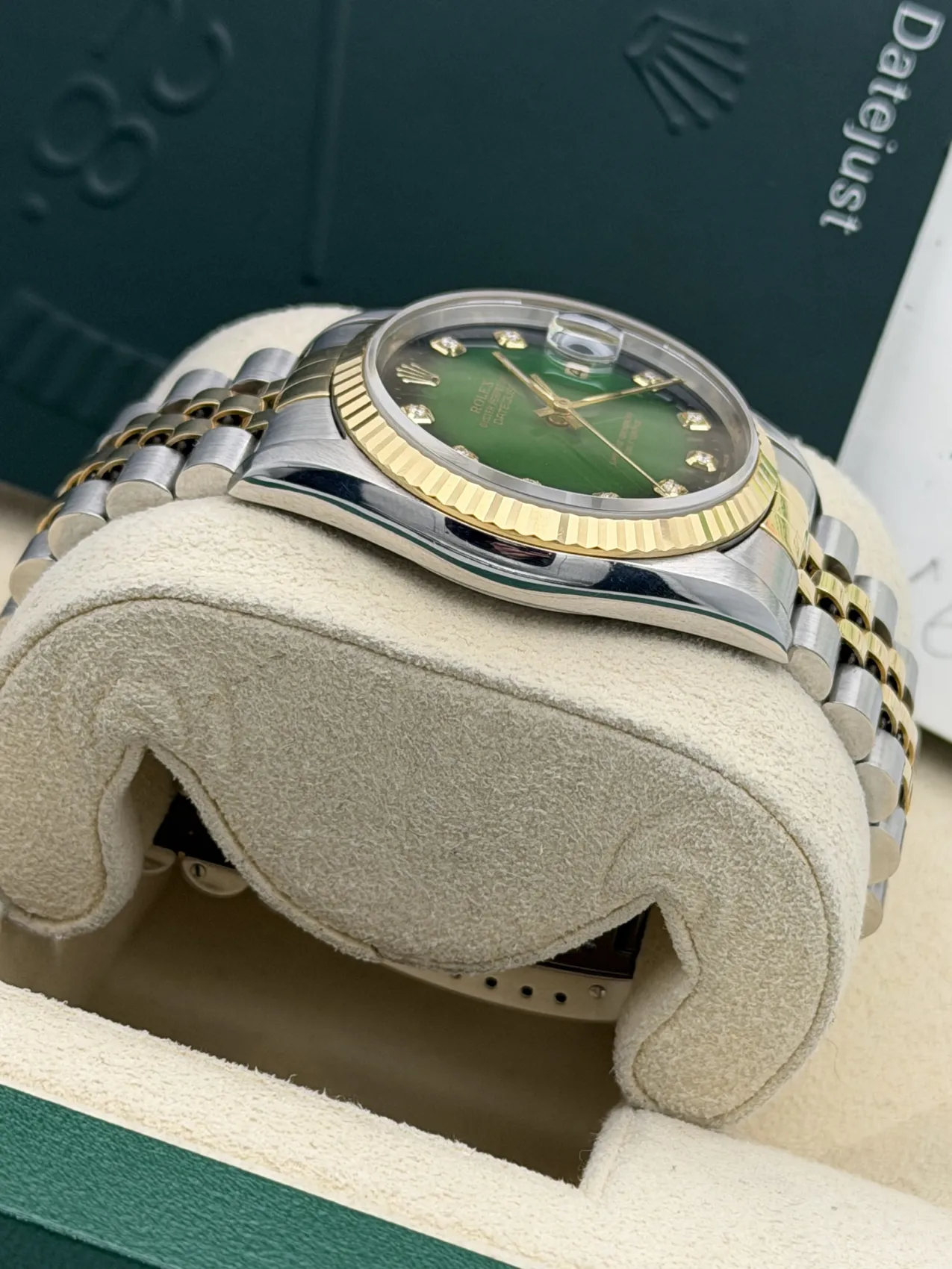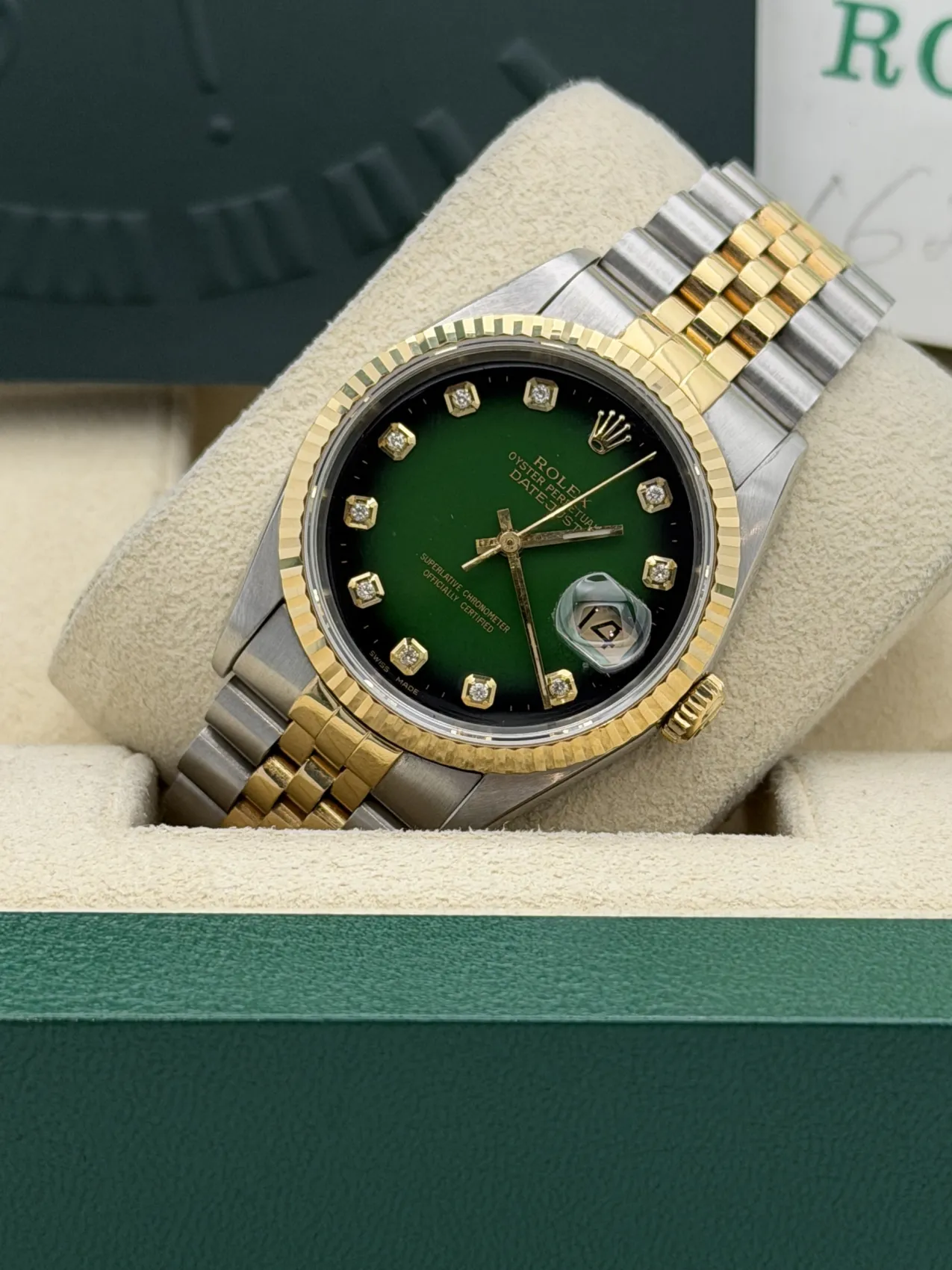 This Rolex Datejust 36mm reference 16233 is crafted in stainless steel and 18ct yellow gold, featuring the iconic fluted bezel and matching bi-metal Jubilee bracelet. What truly sets this example apart is the rare and highly collectible green vignette dial, graduating from a rich emerald centre to a darker outer edge, creating depth and character that is seldom seen on this reference.The classic 36mm case size maintains perfect proportions, making it one of the most enduring and versatile Rolex designs ever produced. Powered by the Rolex calibre 3135 automatic movement, the 16233 is celebrated for its reliability, robustness, and ease of servicing — a true cornerstone of modern Rolex engineering.Presented in 1996 condition, this vintage two-tone Datejust offers both timeless style and increasing collectability, particularly with the uncommon green vignette configuration.