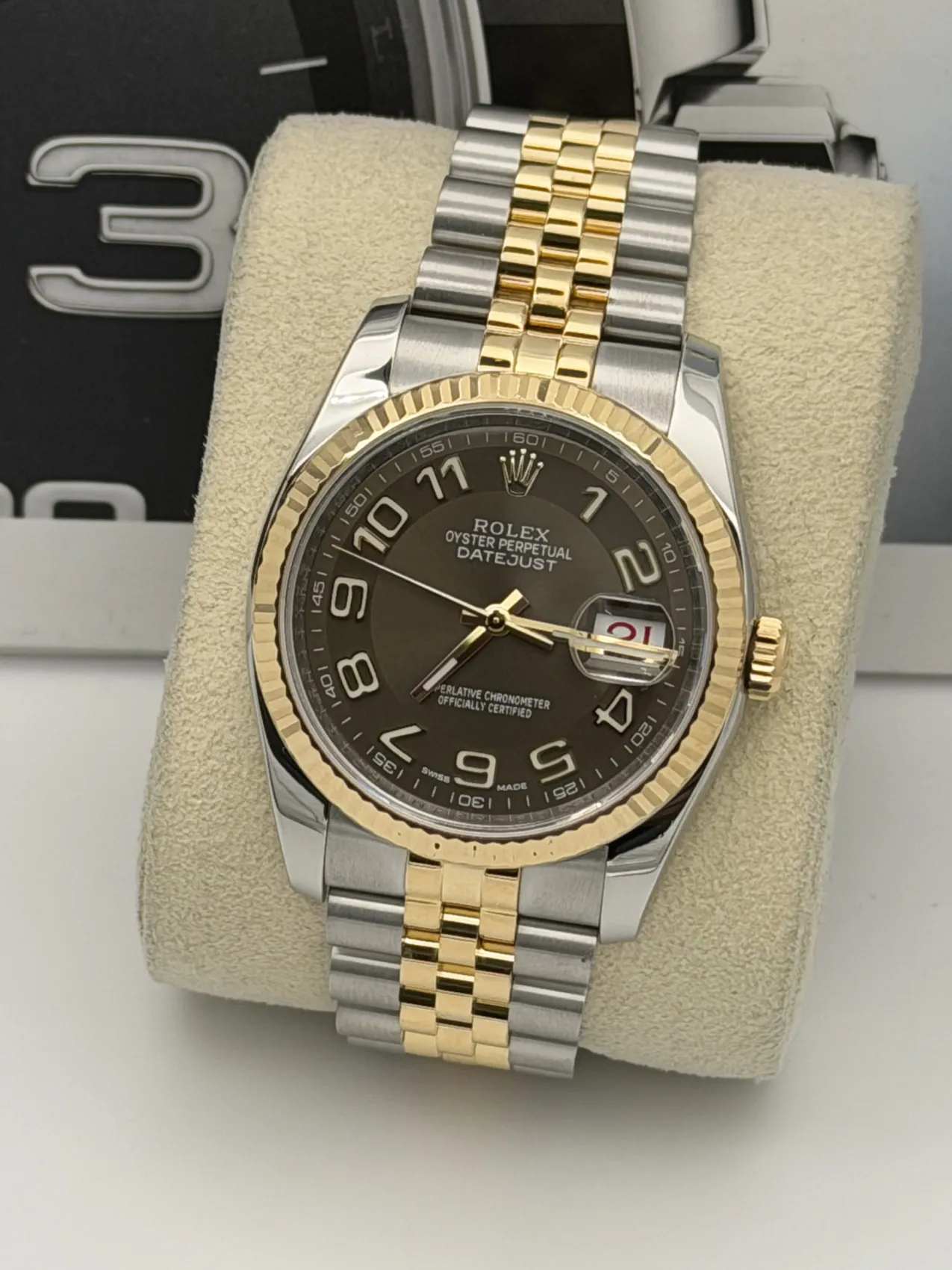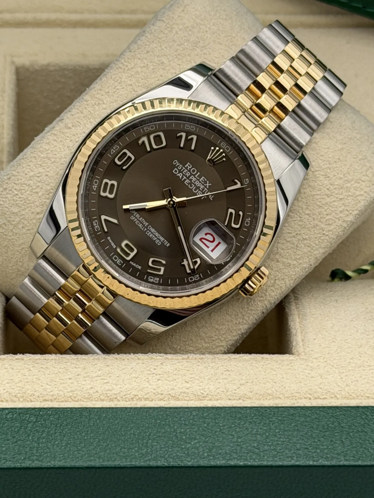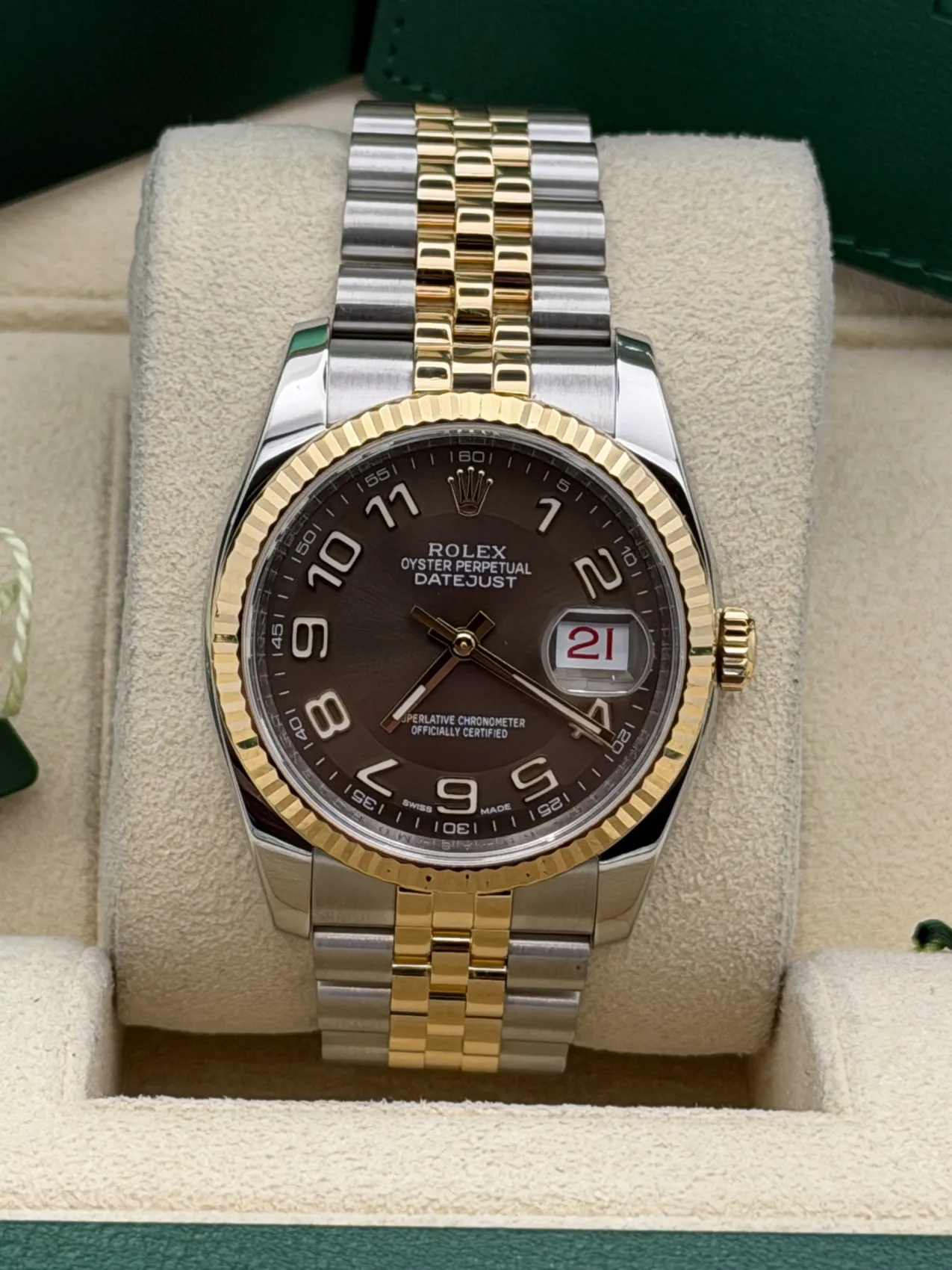 This Rolex Datejust 36mm reference 116233 features a stainless steel and 18ct yellow gold case, distinctive brown concentric dial, fluted yellow gold bezel, and Jubilee bracelet. Powered by an automatic Rolex movement, this classic two-tone Datejust offers timeless proportions with a unique and elegant dial variation. Presented in excellent 2017 condition, it remains a highly versatile and refined choice within the Datejust collection.