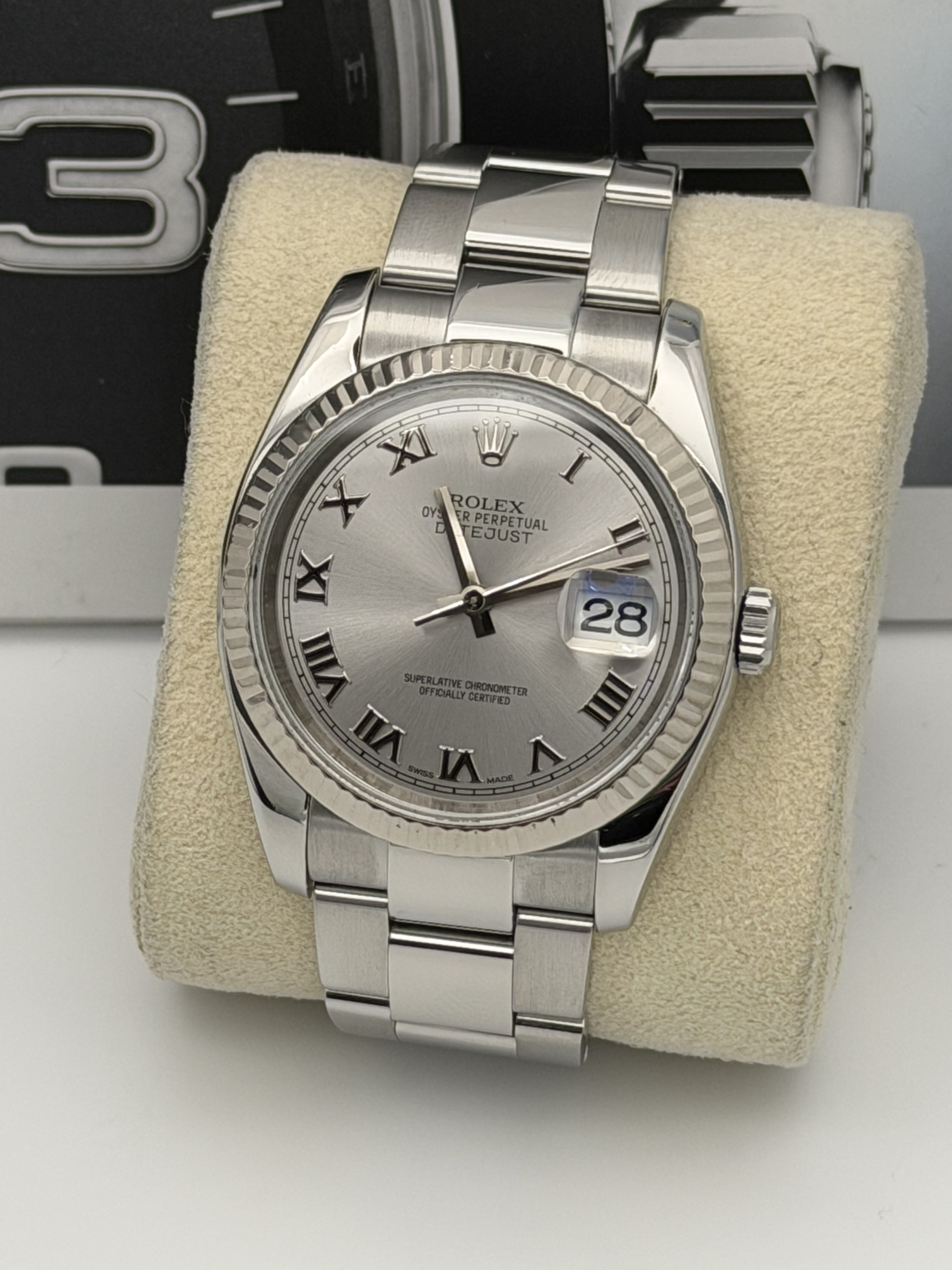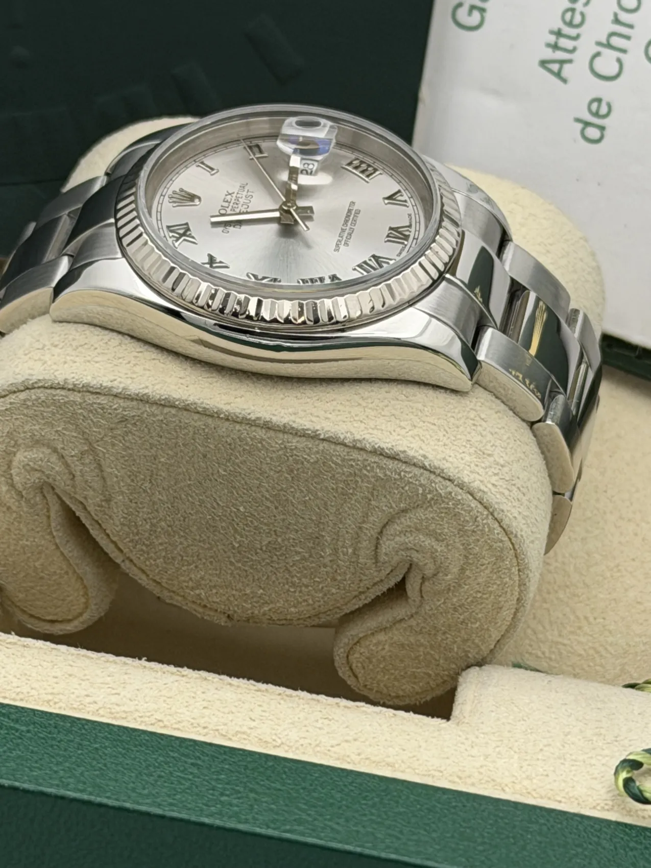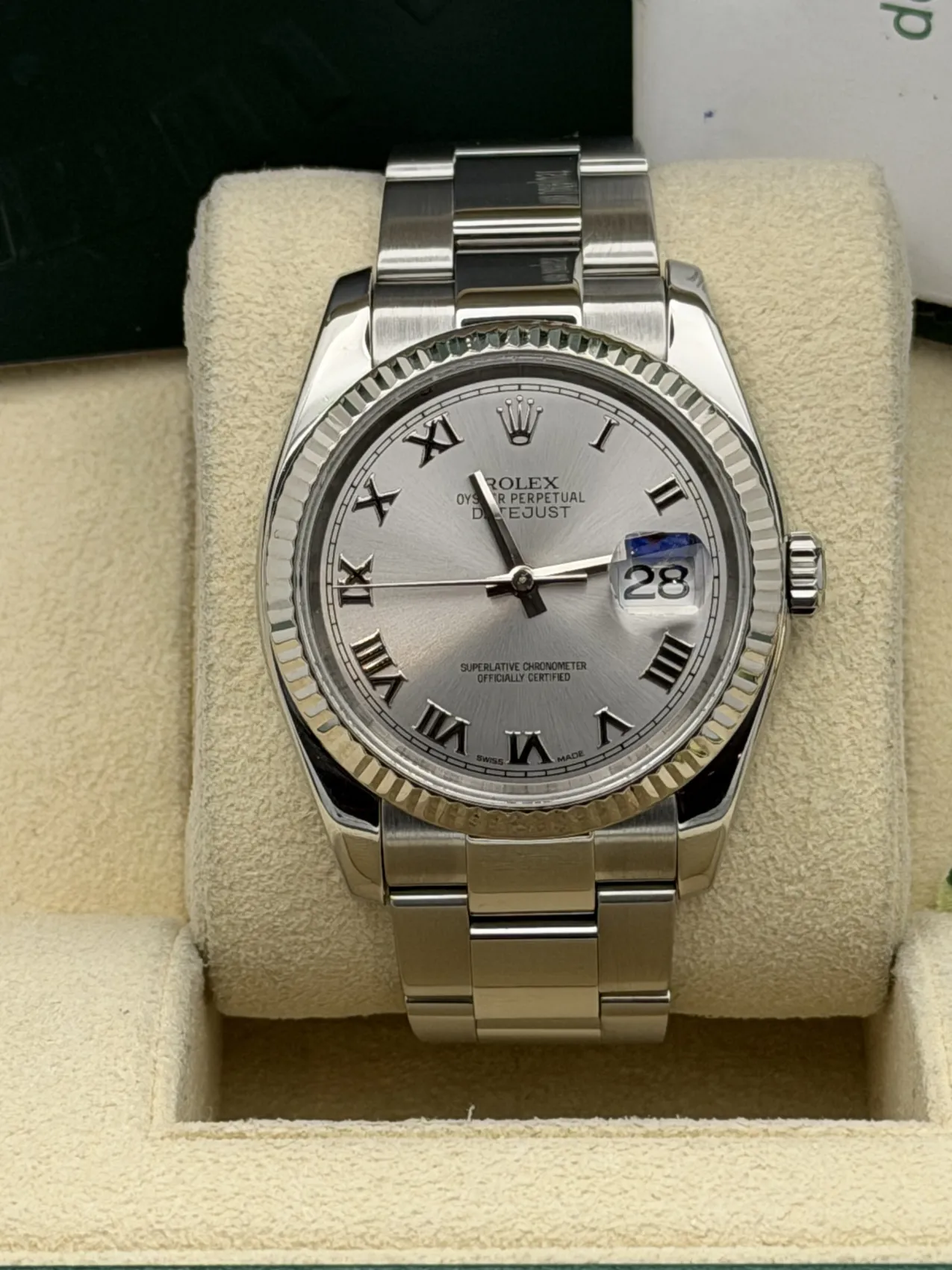This Rolex Datejust 36mm reference 116234 features a stainless steel case, elegant silver Roman numeral dial, fluted white gold bezel, Oyster bracelet, and automatic Rolex movement, presented in excellent 2006 condition. A timeless and versatile Datejust combining classic Rolex design with everyday wearability.