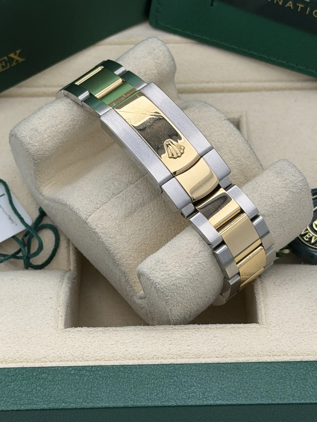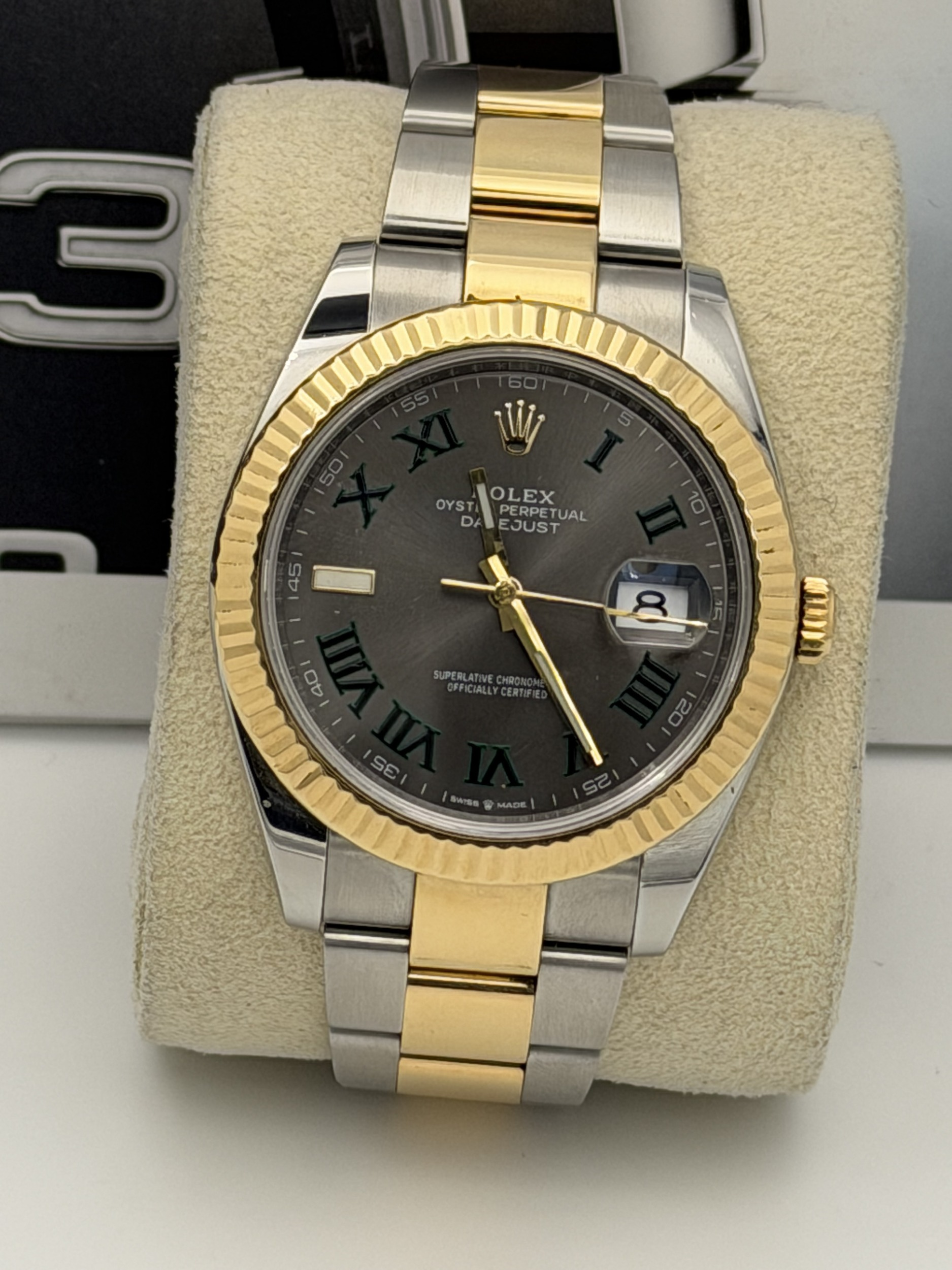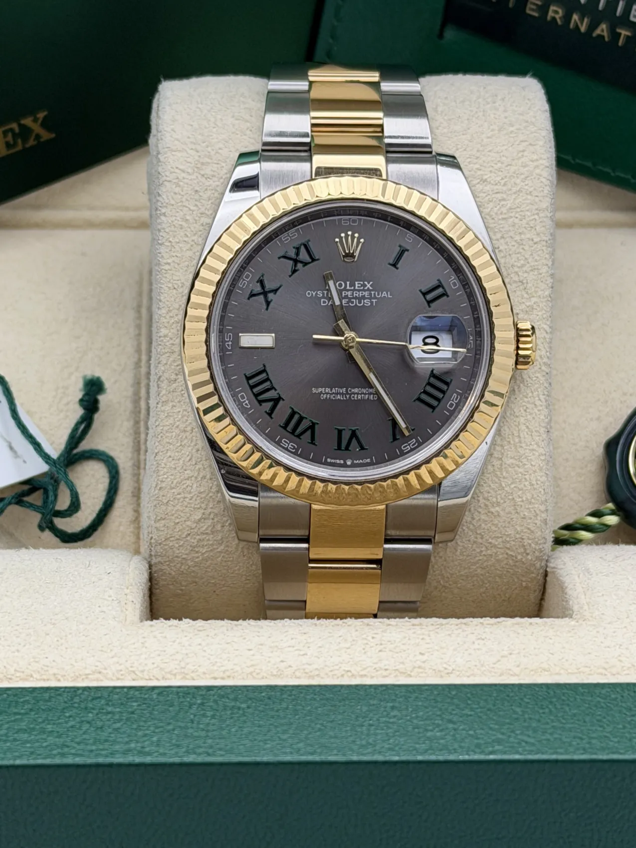 This Rolex Datejust 41, reference 126333, features a 41mm stainless steel and 18ct yellow gold case paired with the robust two-tone Oyster bracelet. It is fitted with the iconic yellow gold fluted bezel, one of Rolex’s most recognisable design elements.The standout feature of this model is the highly sought-after Wimbledon dial, with its slate grey finish, bold black Roman numerals outlined in green, and luminous hands—an elegant, sporty, and modern aesthetic unique to Rolex. Powered by the Rolex calibre 3235 automatic movement, it offers outstanding accuracy, a 70-hour power reserve, and excellent reliability.We offer a 12-month warranty on all watches with less than one year of remaining manufacturer or service warranty.