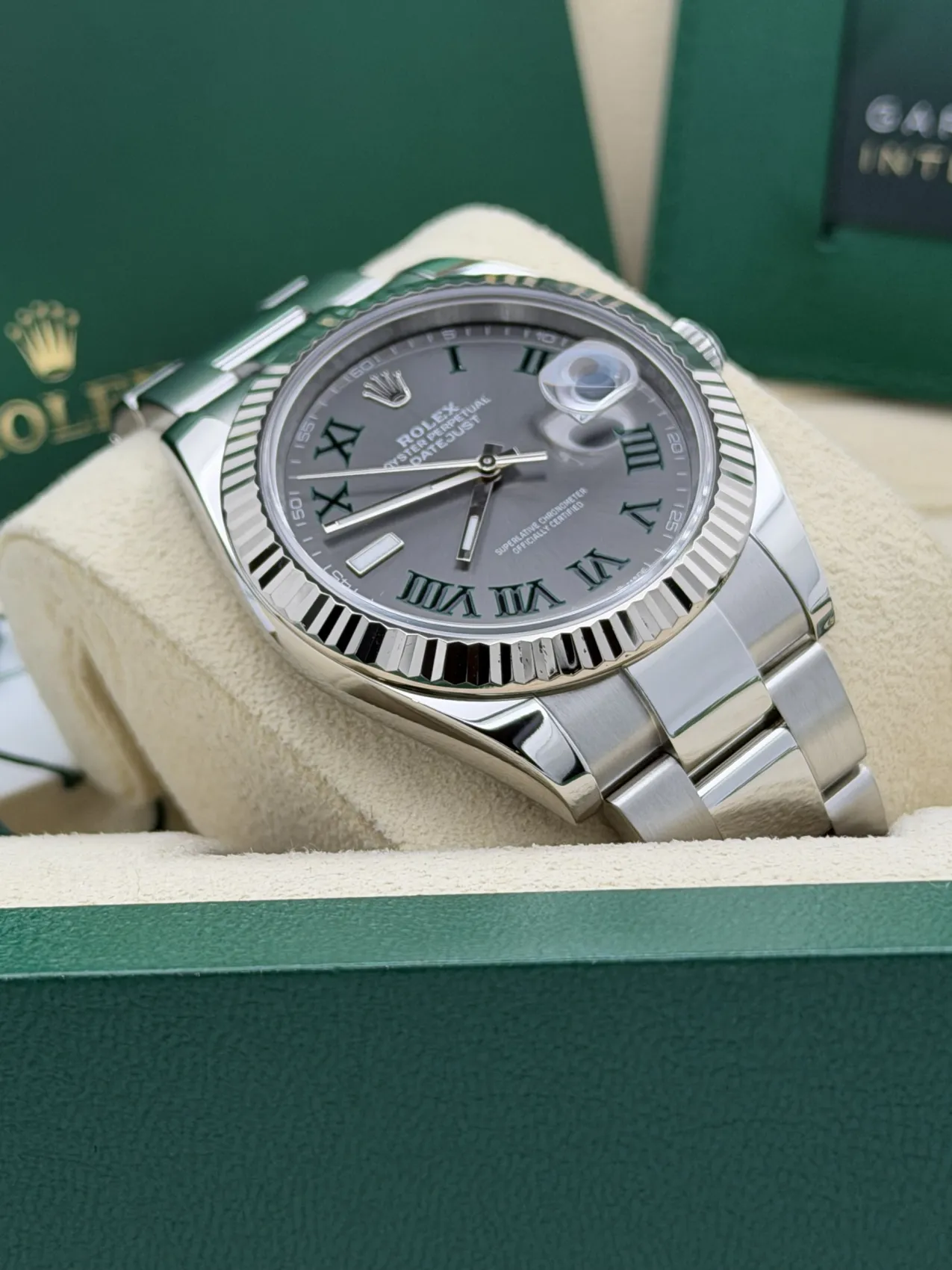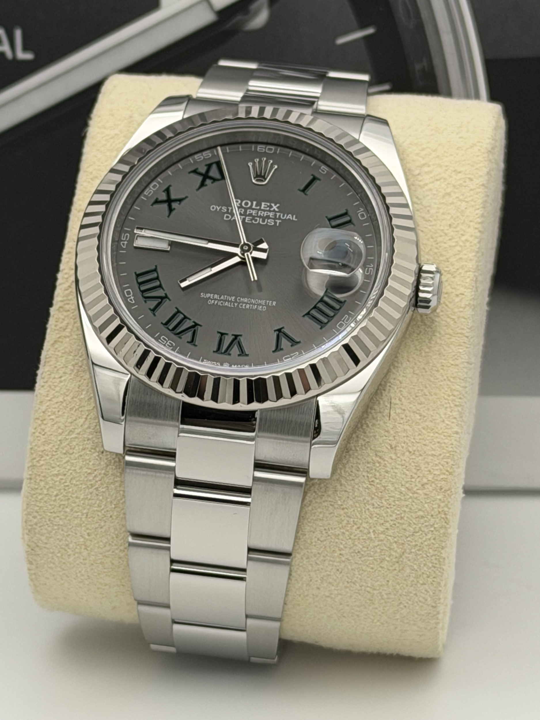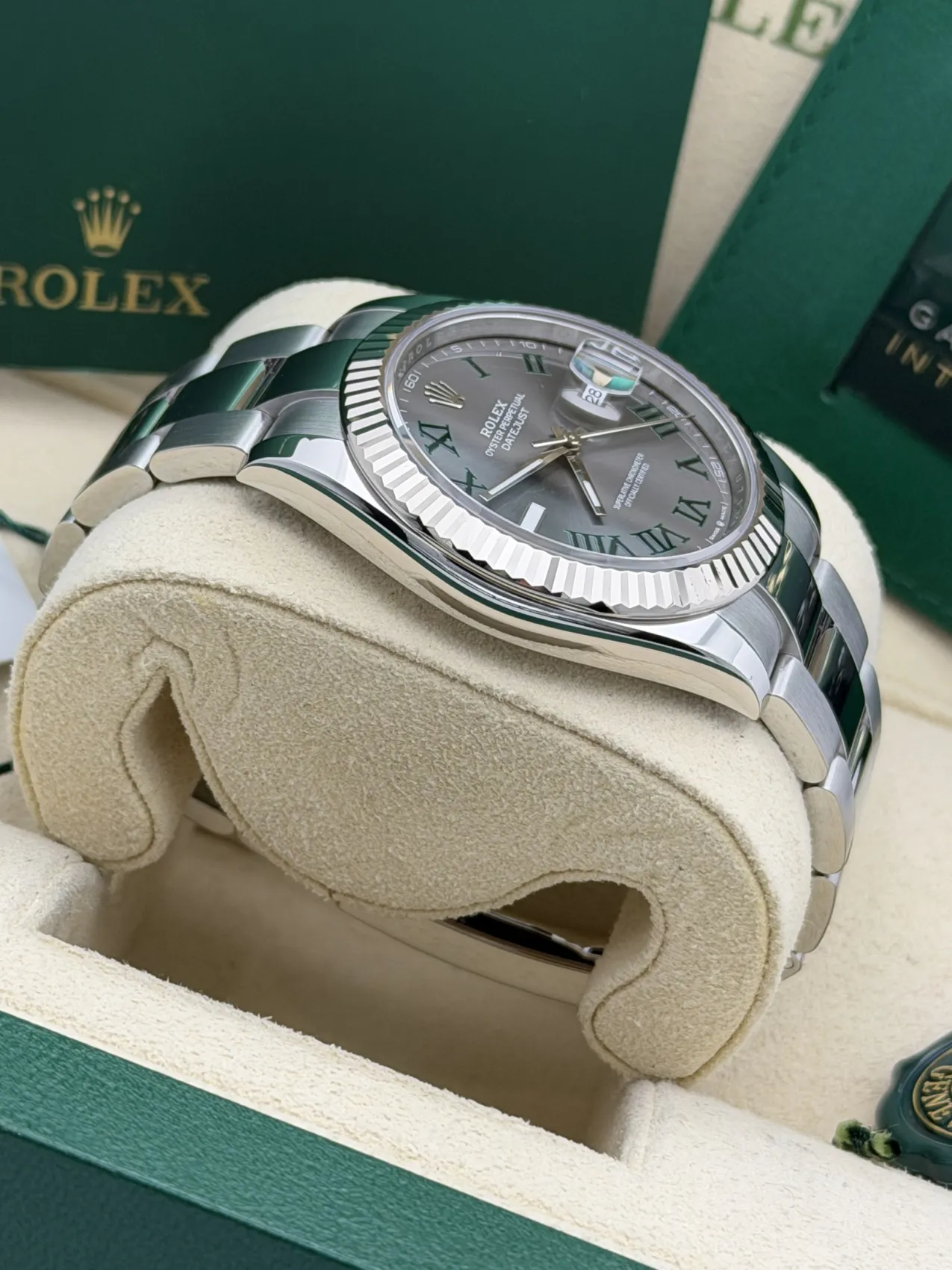 This Rolex Datejust 41mm reference 126334 features a stainless steel case complemented by an 18ct white gold fluted bezel, paired with the highly recognisable Wimbledon dial. The slate grey dial with distinctive green Roman numerals creates one of the most iconic and sought-after modern Datejust configurations.Fitted to the sporty Oyster bracelet with Oysterclasp and Easylink comfort extension, this model offers both durability and everyday comfort while maintaining the classic elegance expected from the Datejust collection. Powered by the Rolex calibre 3235 automatic movement, it benefits from Chronergy escapement technology and approximately 70 hours of power reserve.Presented in excellent 2024 condition, this Datejust 41 combines contemporary proportions with one of Rolex’s most popular dial variations, making it a highly desirable addition to any collection.