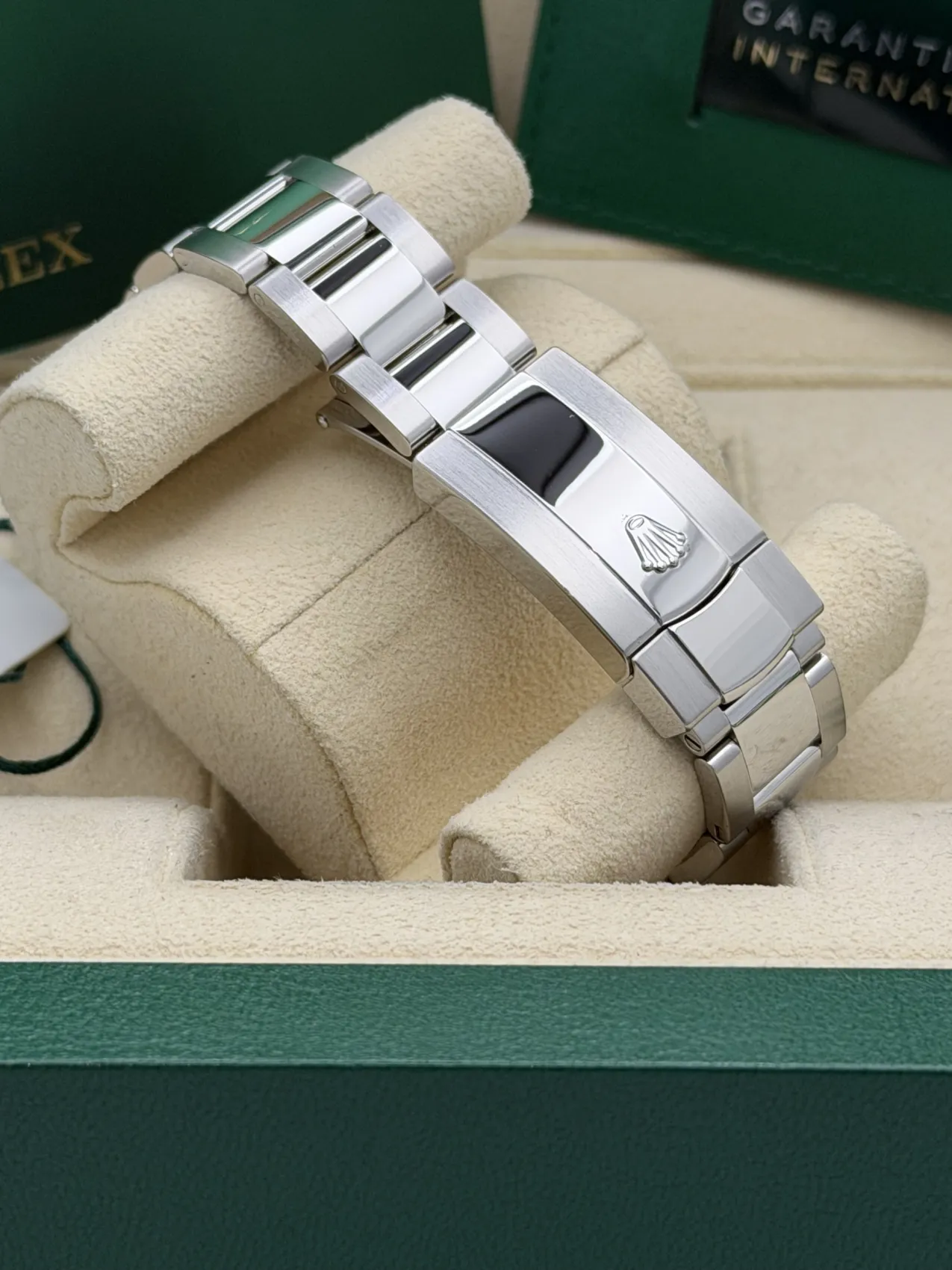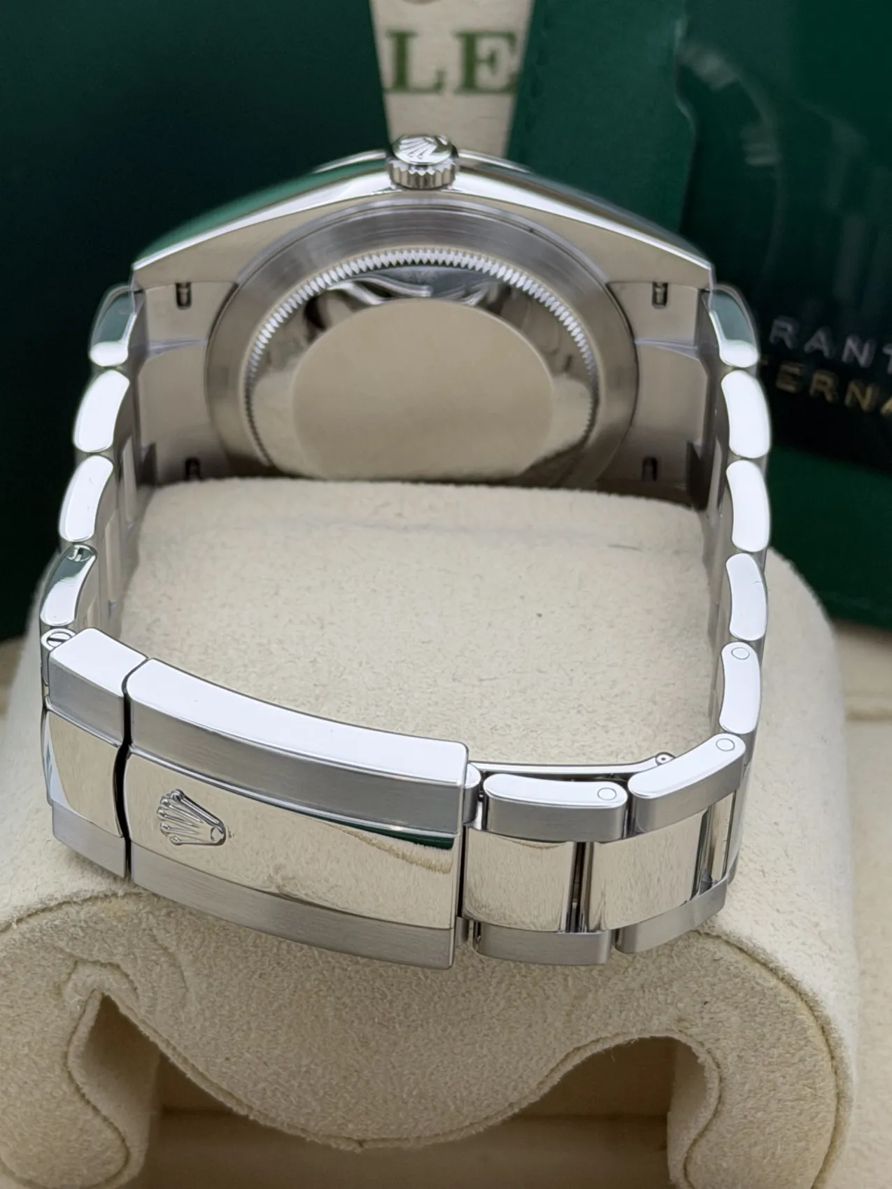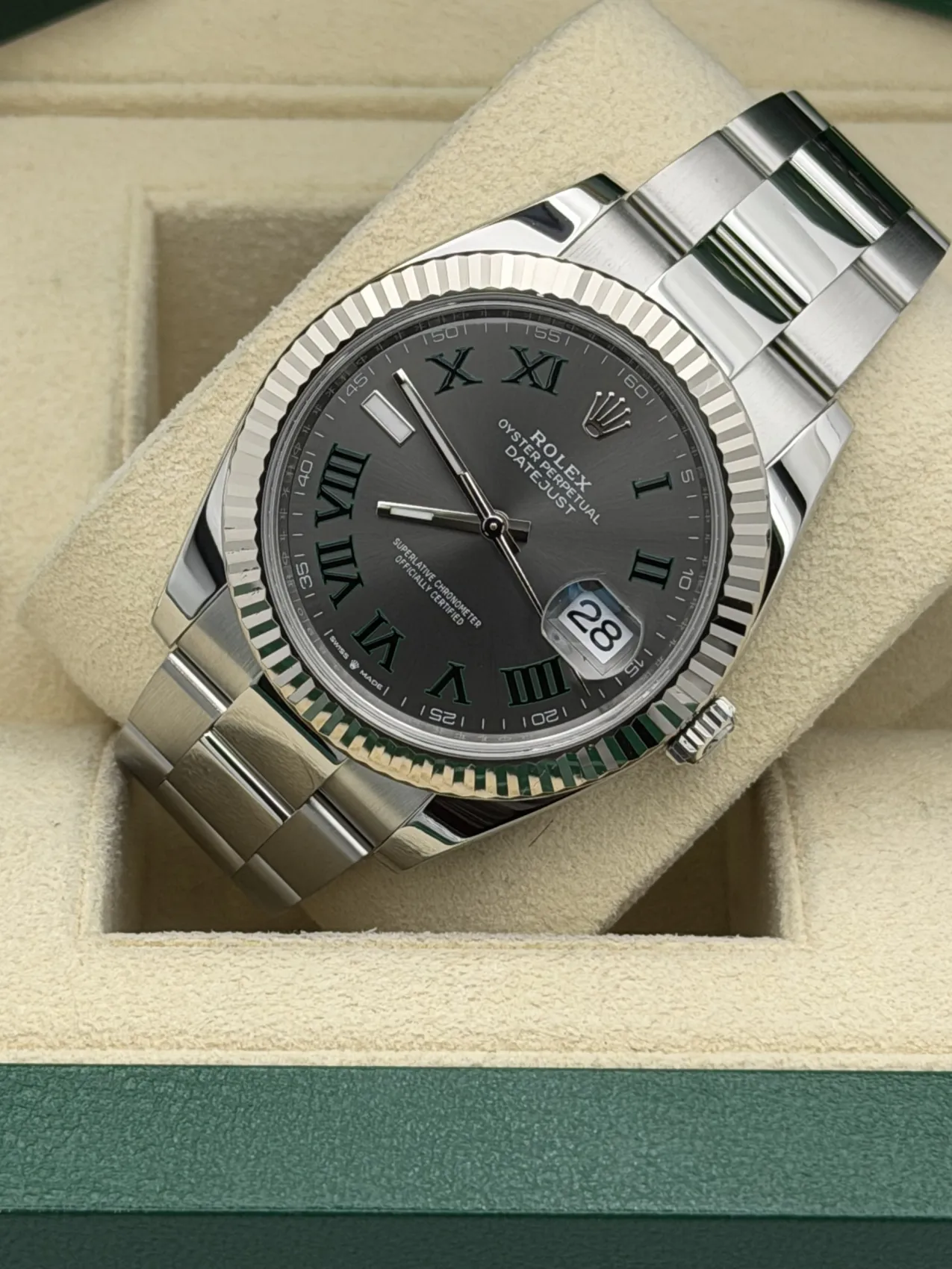 This Rolex Datejust 41mm reference 126334 features a stainless steel case complemented by an 18ct white gold fluted bezel, paired with the highly recognisable Wimbledon dial. The slate grey dial with distinctive green Roman numerals creates one of the most iconic and sought-after modern Datejust configurations.Fitted to the sporty Oyster bracelet with Oysterclasp and Easylink comfort extension, this model offers both durability and everyday comfort while maintaining the classic elegance expected from the Datejust collection. Powered by the Rolex calibre 3235 automatic movement, it benefits from Chronergy escapement technology and approximately 70 hours of power reserve.Presented in excellent 2024 condition, this Datejust 41 combines contemporary proportions with one of Rolex’s most popular dial variations, making it a highly desirable addition to any collection.