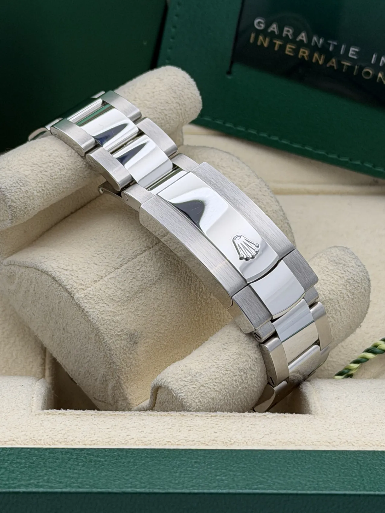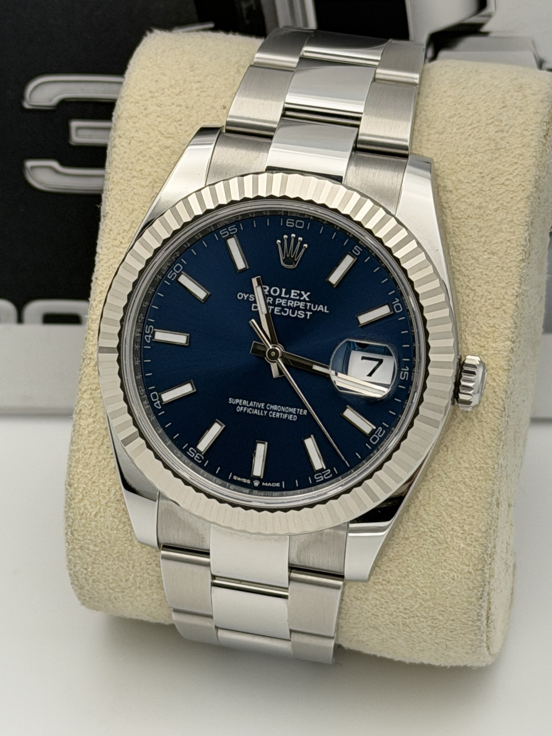 This Rolex Datejust 41mm reference 126334 features a stainless steel case complemented by an 18ct white gold fluted bezel, paired with the highly desirable sunburst blue baton (stick) dial. The clean baton hour markers enhance legibility while maintaining the timeless elegance that defines the Datejust collection.Fitted to the classic Oyster bracelet with Oysterclasp and Easylink comfort extension, this configuration offers a sportier aesthetic while retaining the refinement expected from a Datejust. Powered by the Rolex calibre 3235 automatic movement, it benefits from Chronergy escapement technology and approximately 70 hours of power reserve.Presented in excellent 2024 condition, this current-generation Datejust 41 represents one of the most sought-after modern configurations, combining versatility, presence, and everyday practicality.