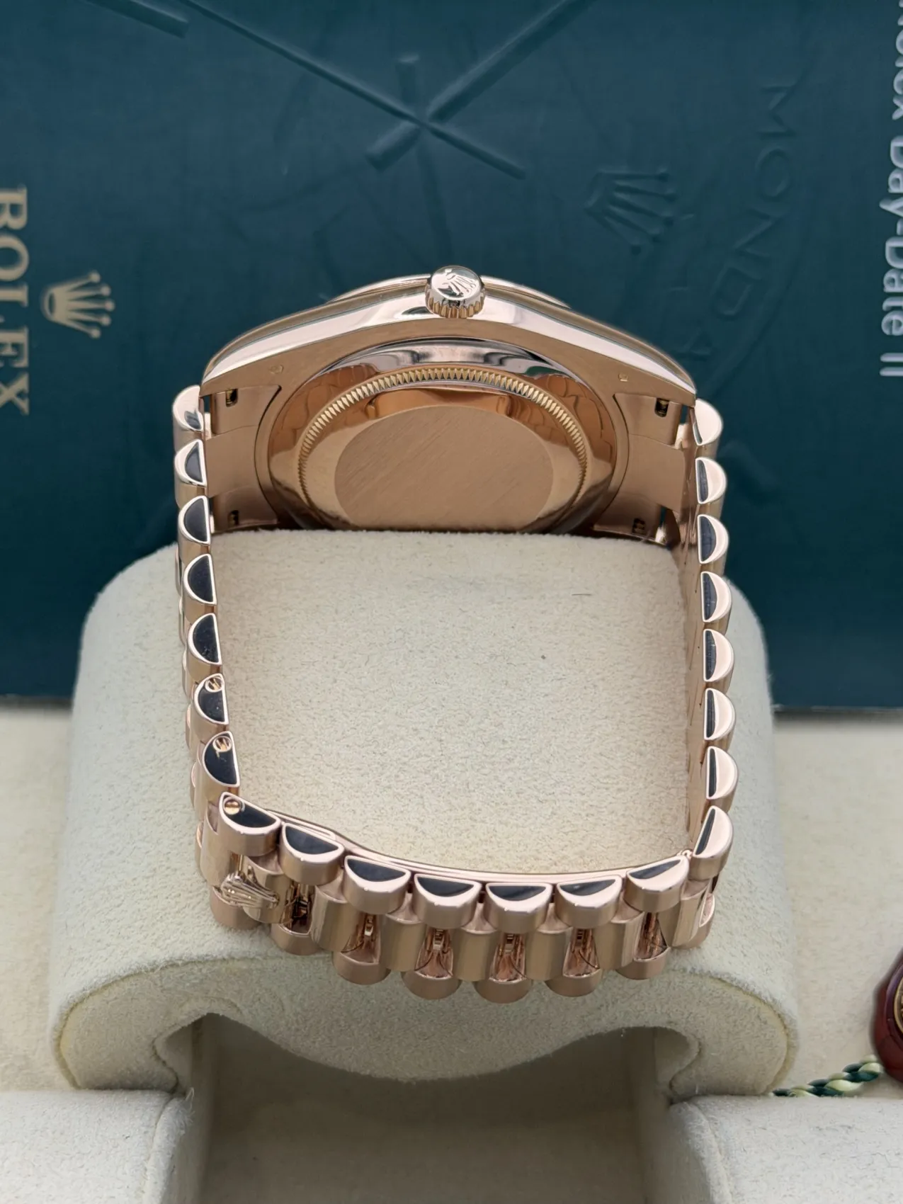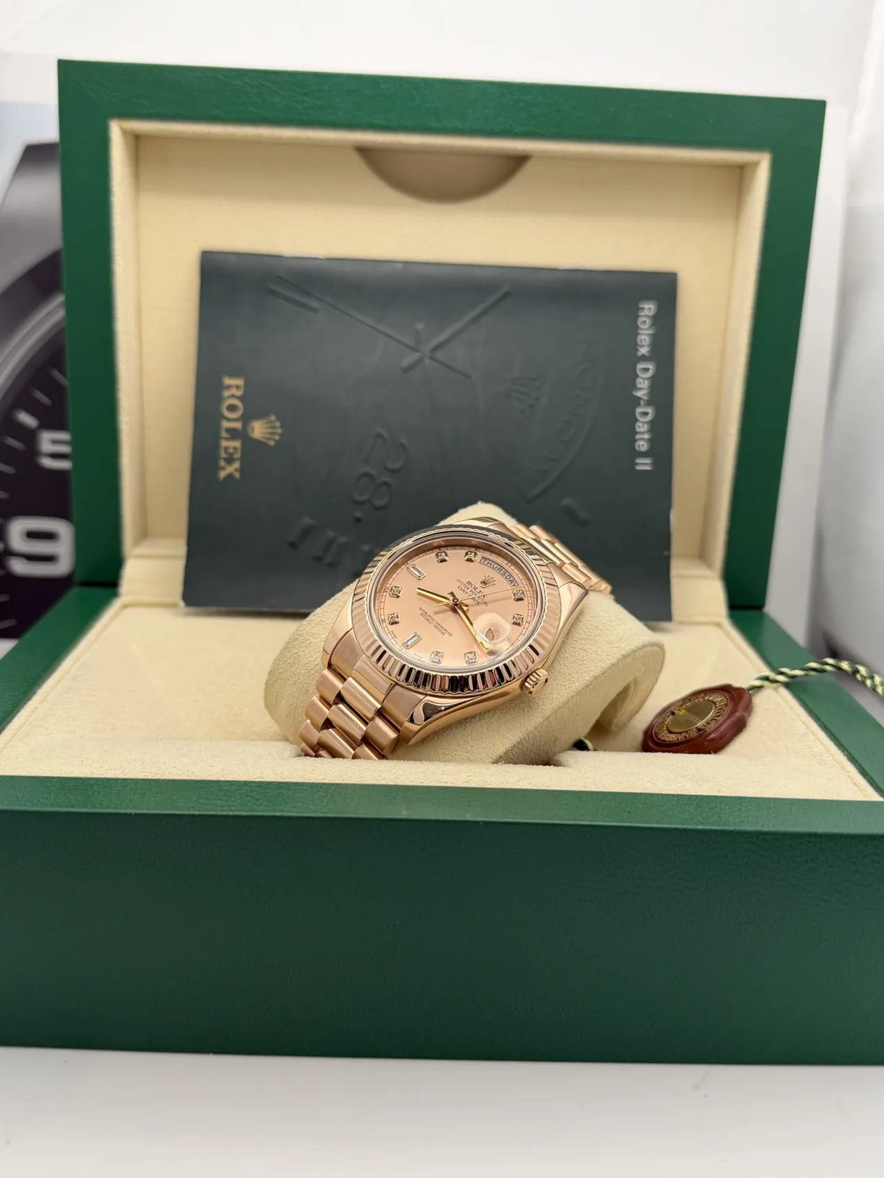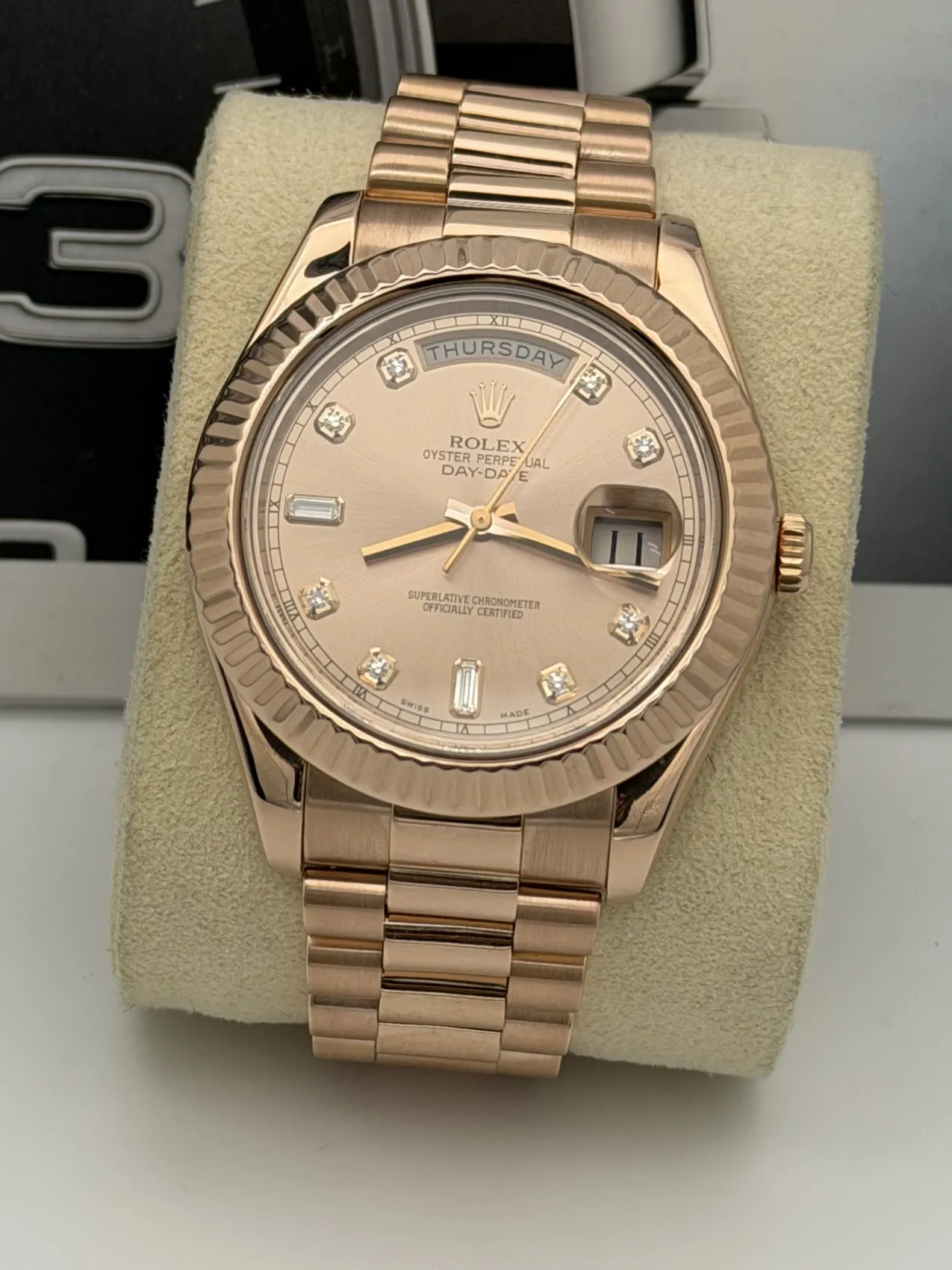This Rolex Day-Date II features a 41mm 18ct Everose gold case, fluted bezel, sundust diamond dot dial, President bracelet, and the Calibre 3156 automatic movement, offered in excellent condition.