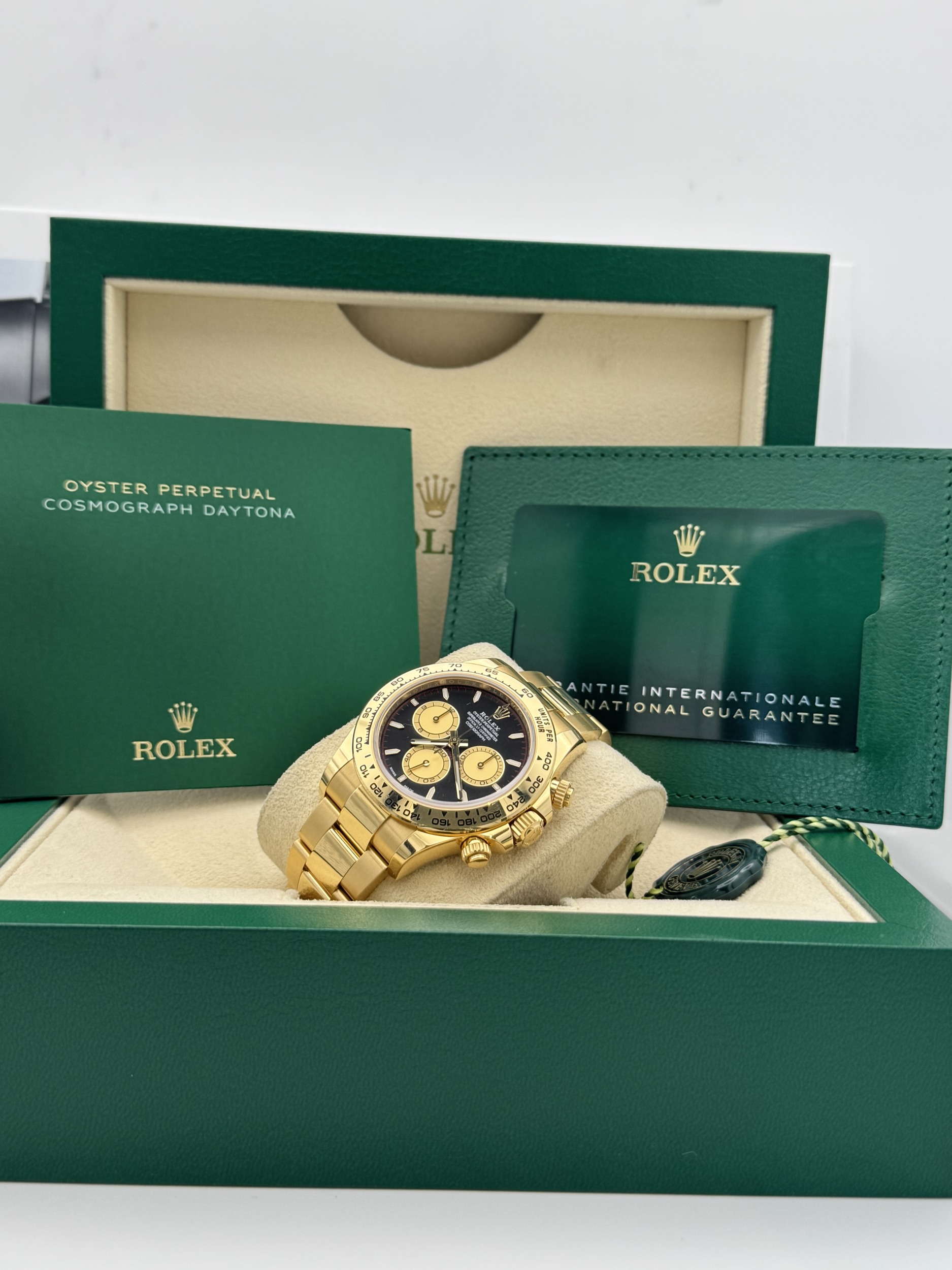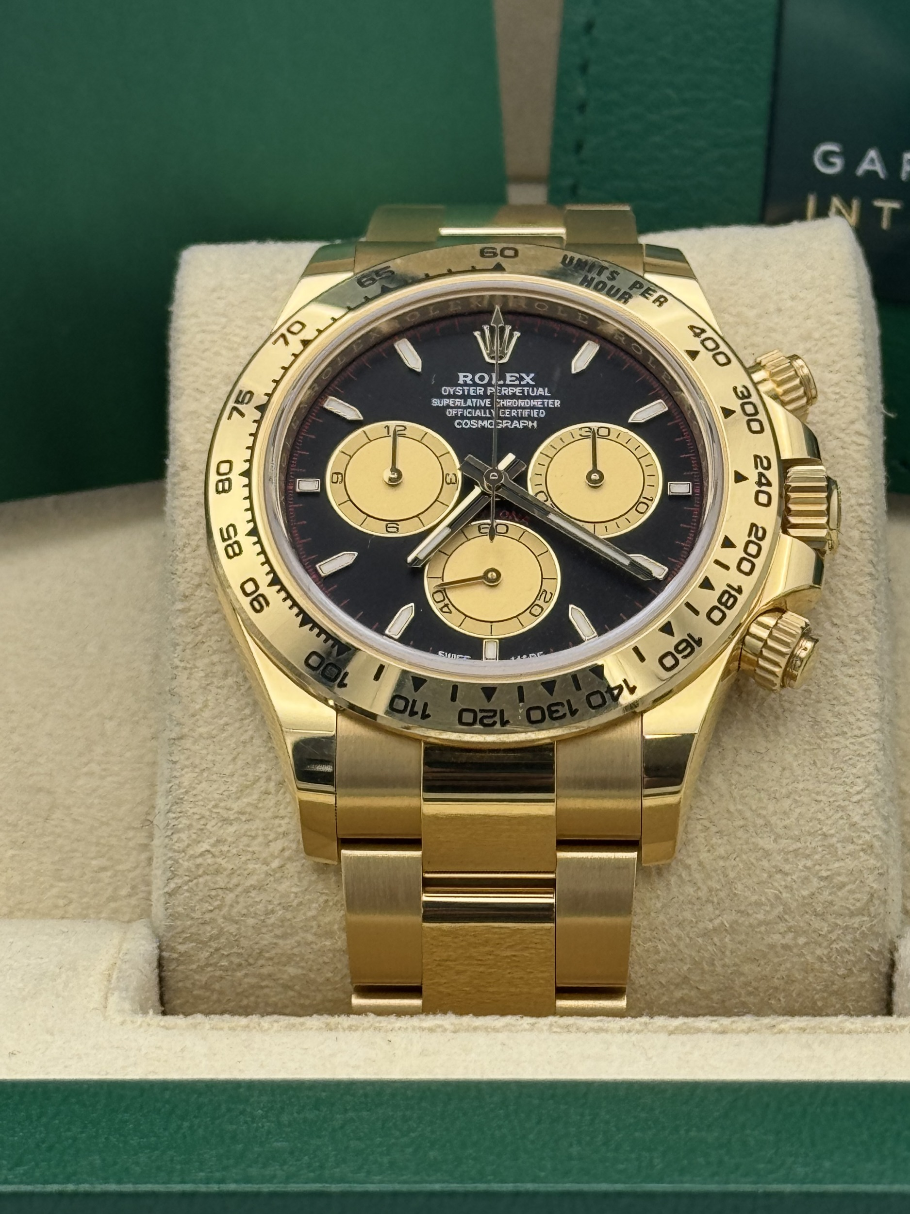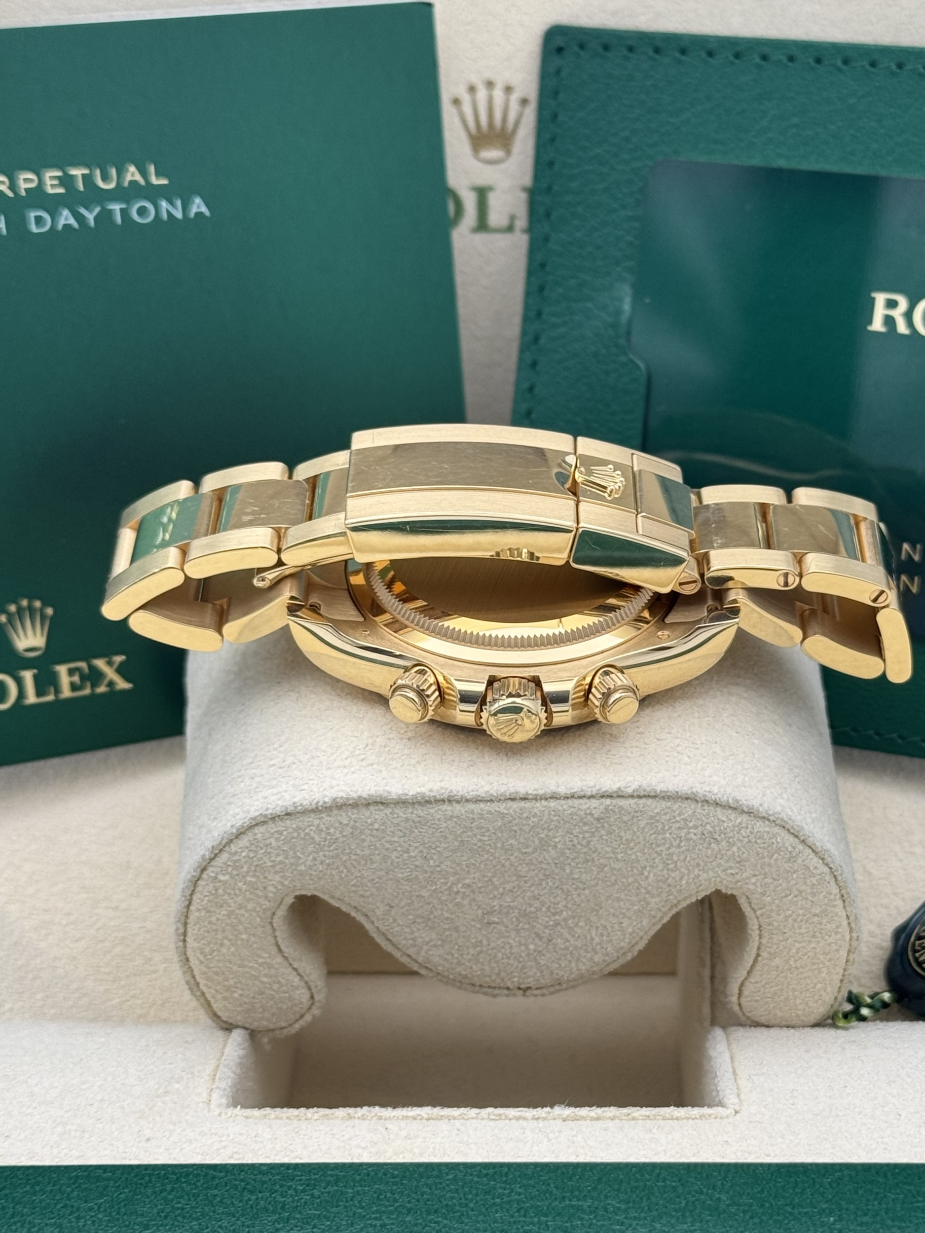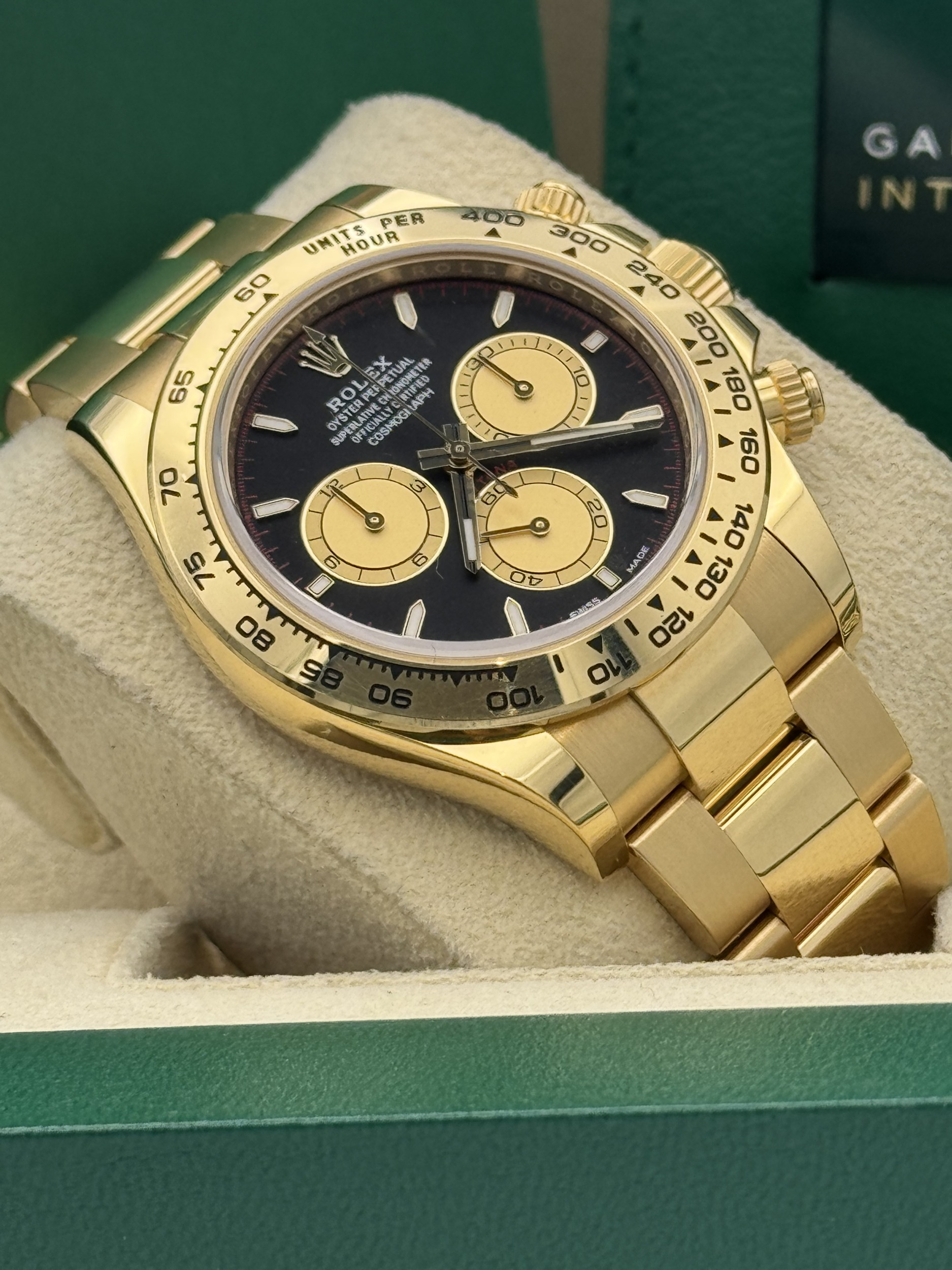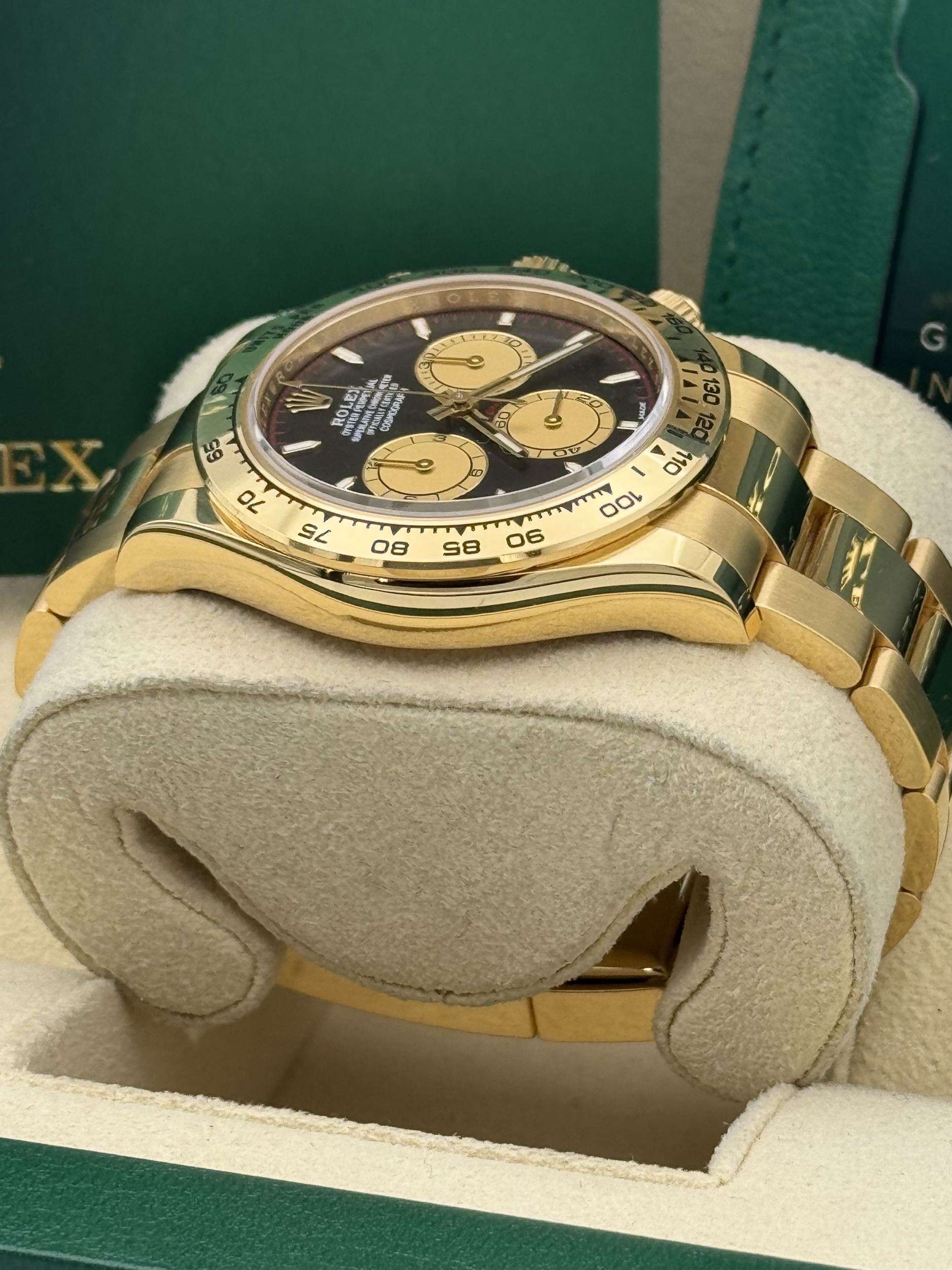 This Rolex Daytona 40mm features a 18ct yellow gold case, iconic Paul Newman dial with contrasting subdials, Oyster bracelet, and the Calibre 4130 automatic chronograph movement, presented in excellent 2017 condition.