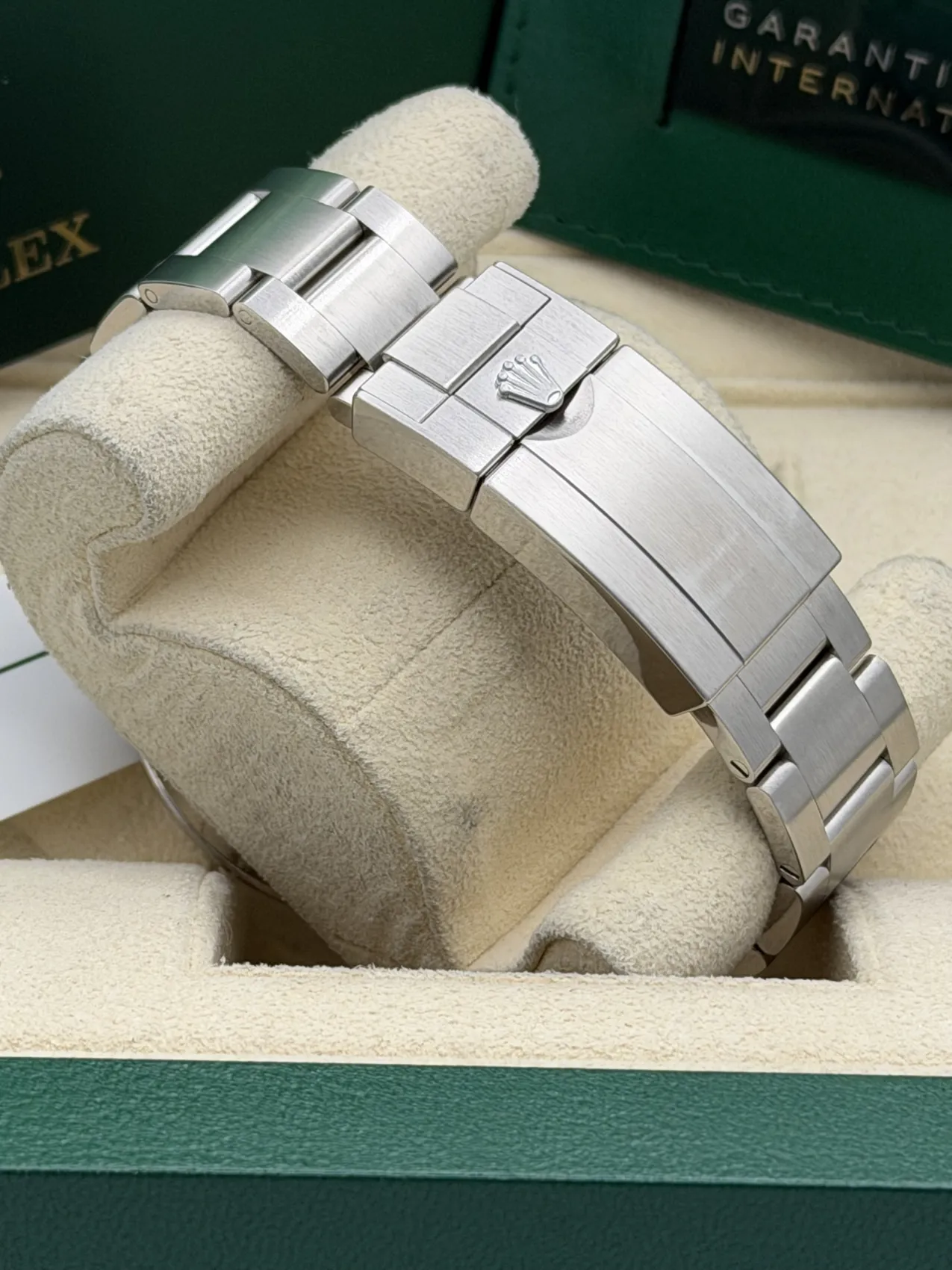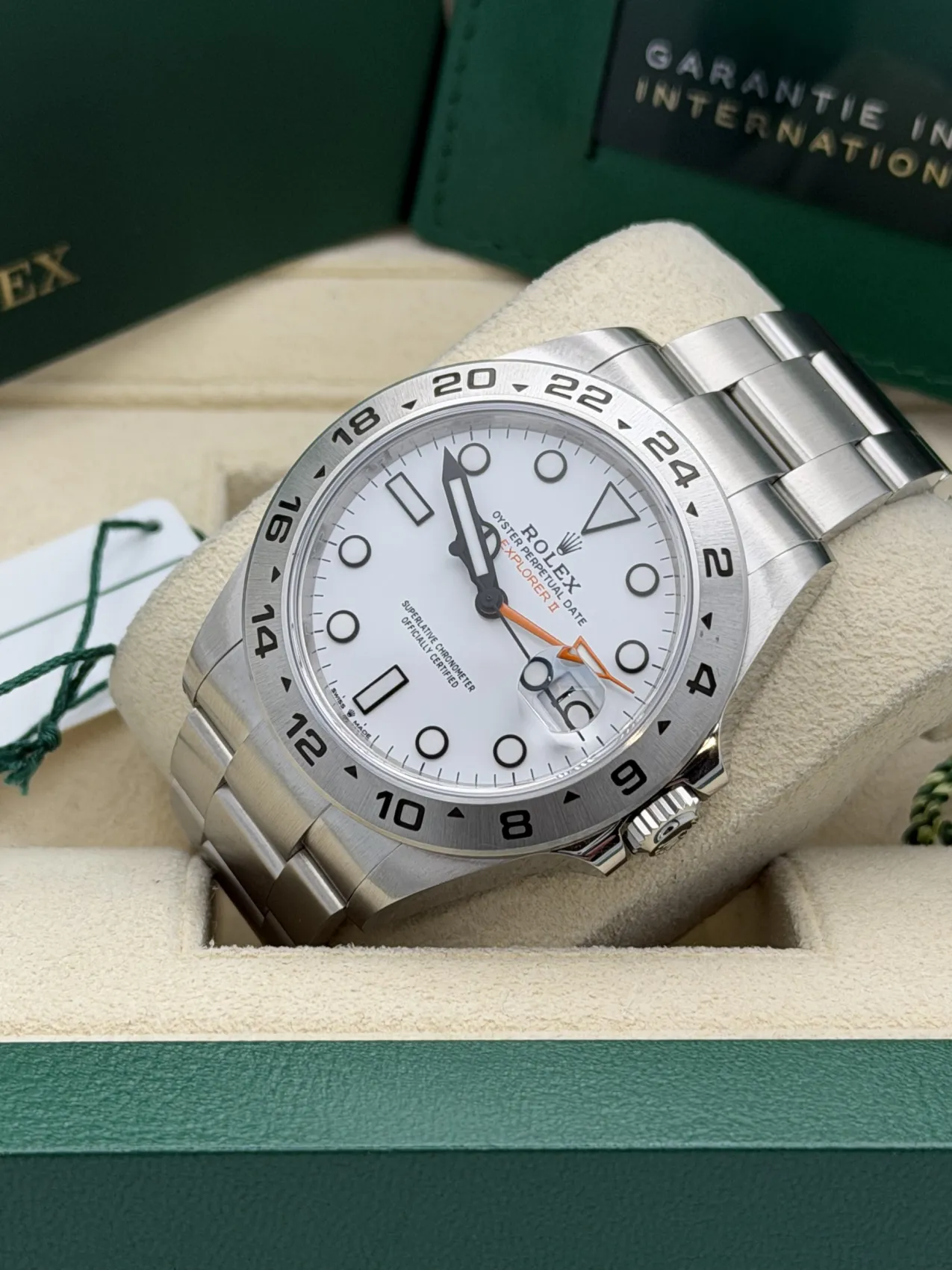 This Rolex Explorer II 42mm reference 226570 features a crisp polar white dial with contrasting black surrounds and the iconic orange 24-hour hand, set within a robust stainless steel case and fixed 24-hour graduated bezel. Fitted to the solid Oyster bracelet with Oysterlock clasp and Easylink extension, it delivers the perfect blend of durability and everyday comfort.Originally designed for adventurers and explorers, the Explorer II allows tracking of a second time zone via its independently adjustable 24-hour hand, making it both practical and instantly recognisable. Powered by the Rolex calibre 3285 automatic movement, it offers Chronergy escapement technology and approximately 70 hours of power reserve, ensuring exceptional reliability and precision.Presented in excellent 2023 condition, this example represents the latest generation Explorer II with refined proportions and upgraded movement, making it a highly desirable modern professional Rolex.