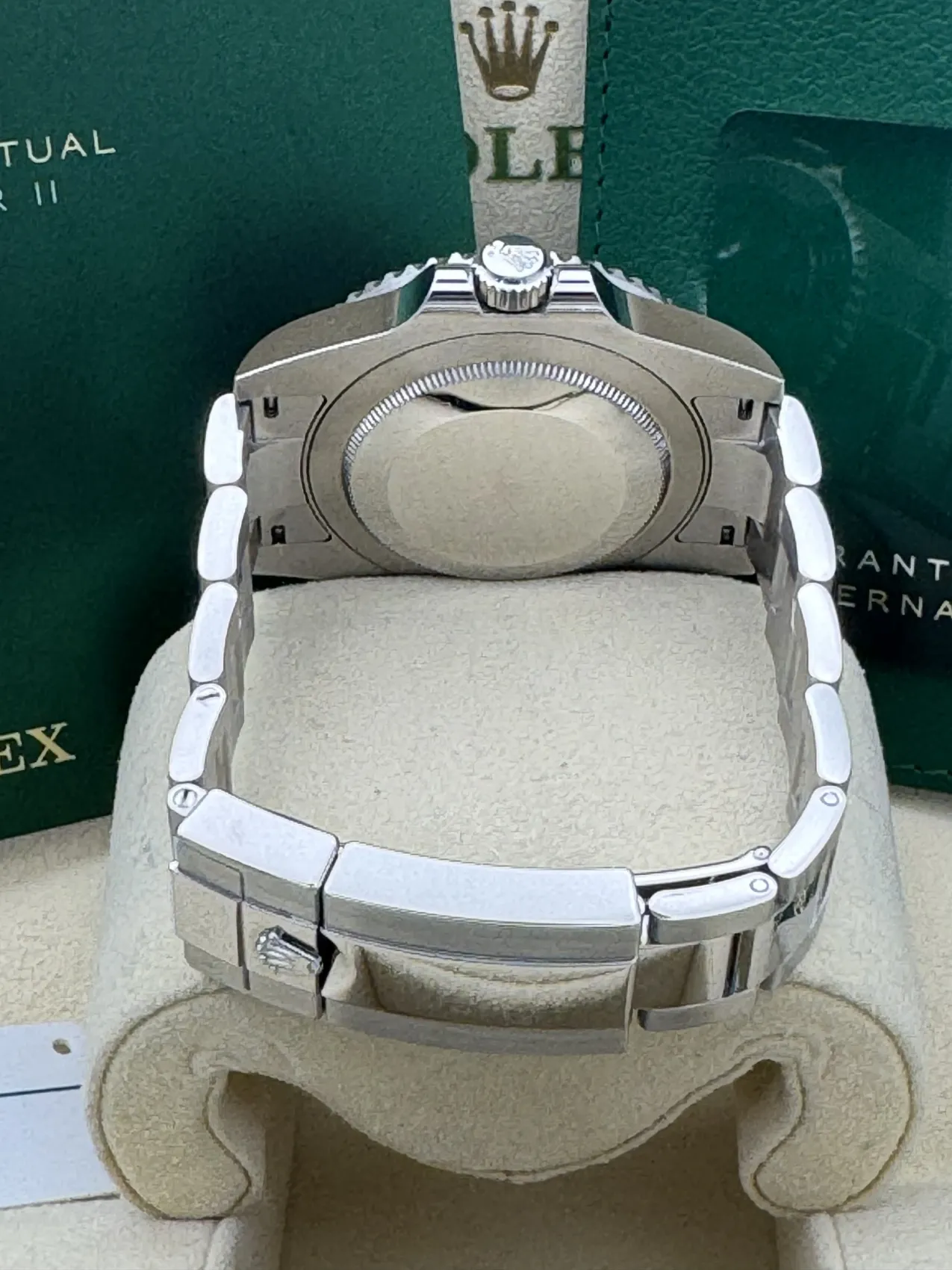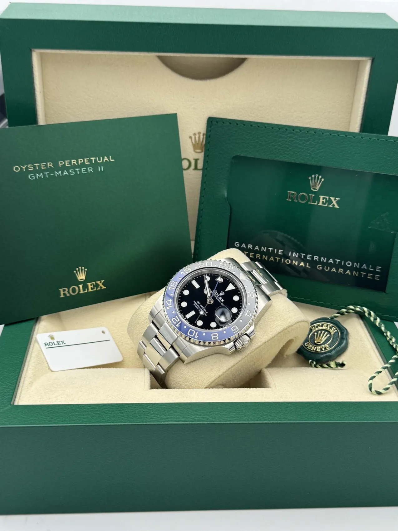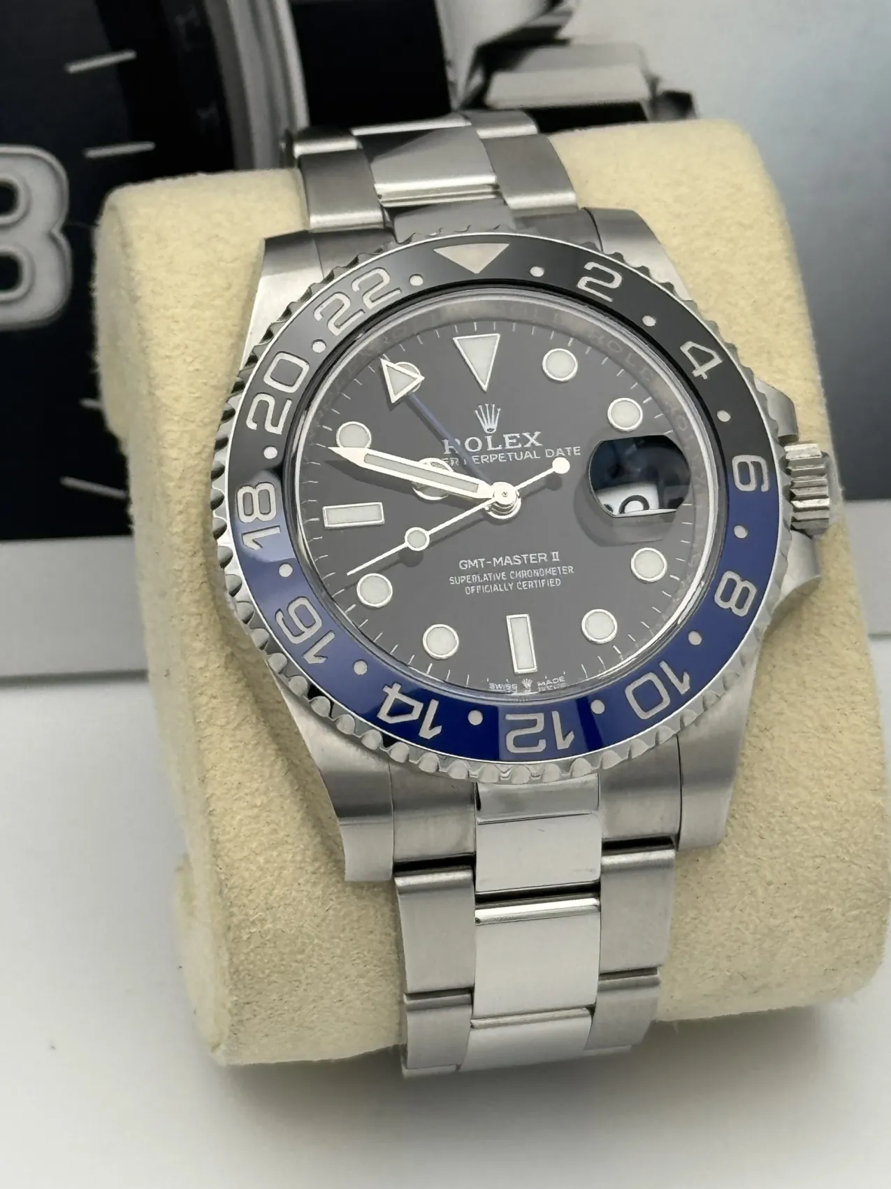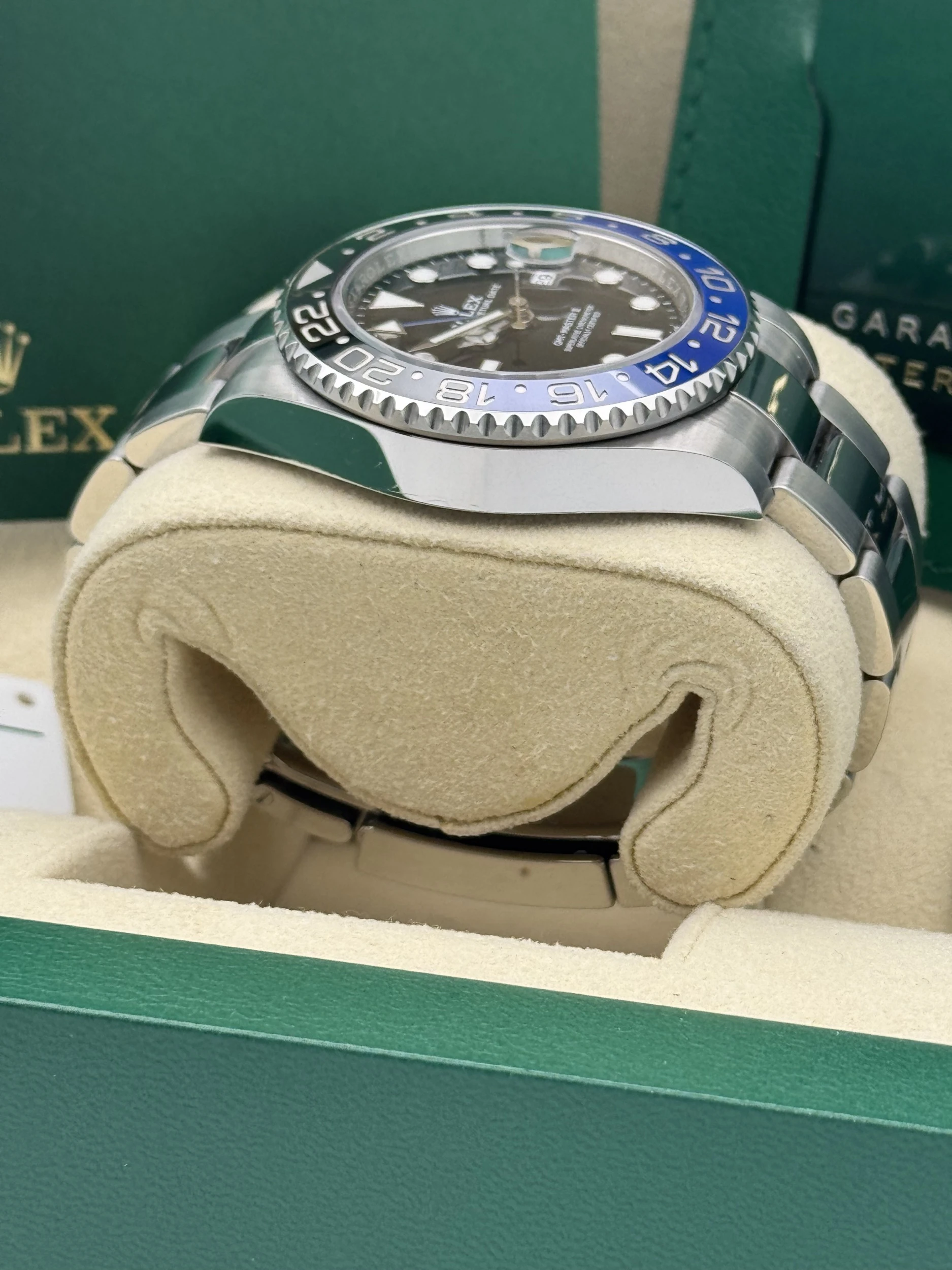 This Rolex GMT-Master II 126710BLNR, known as the “Batman,” features a stainless steel case, black and blue Cerachrom ceramic bezel, black dial, and the classic Oyster bracelet. Powered by Rolex’s automatic dual-time movement and presented in excellent condition, this 2022 model is a modern GMT icon, prized for its distinctive bi-color bezel and robust functionality.