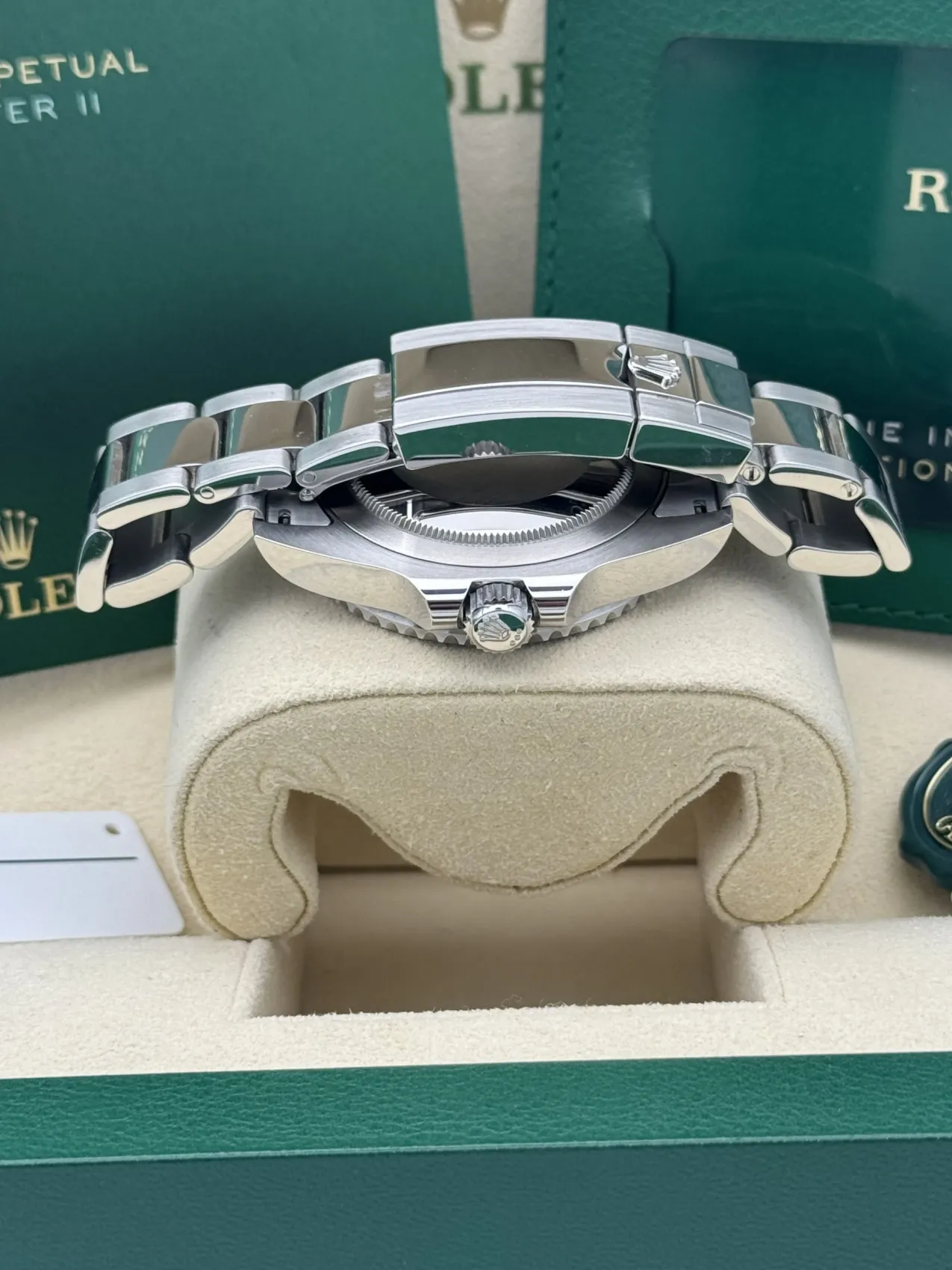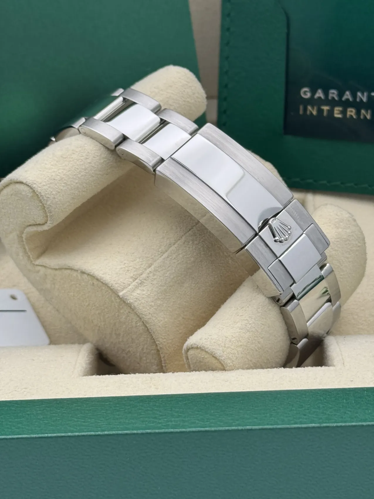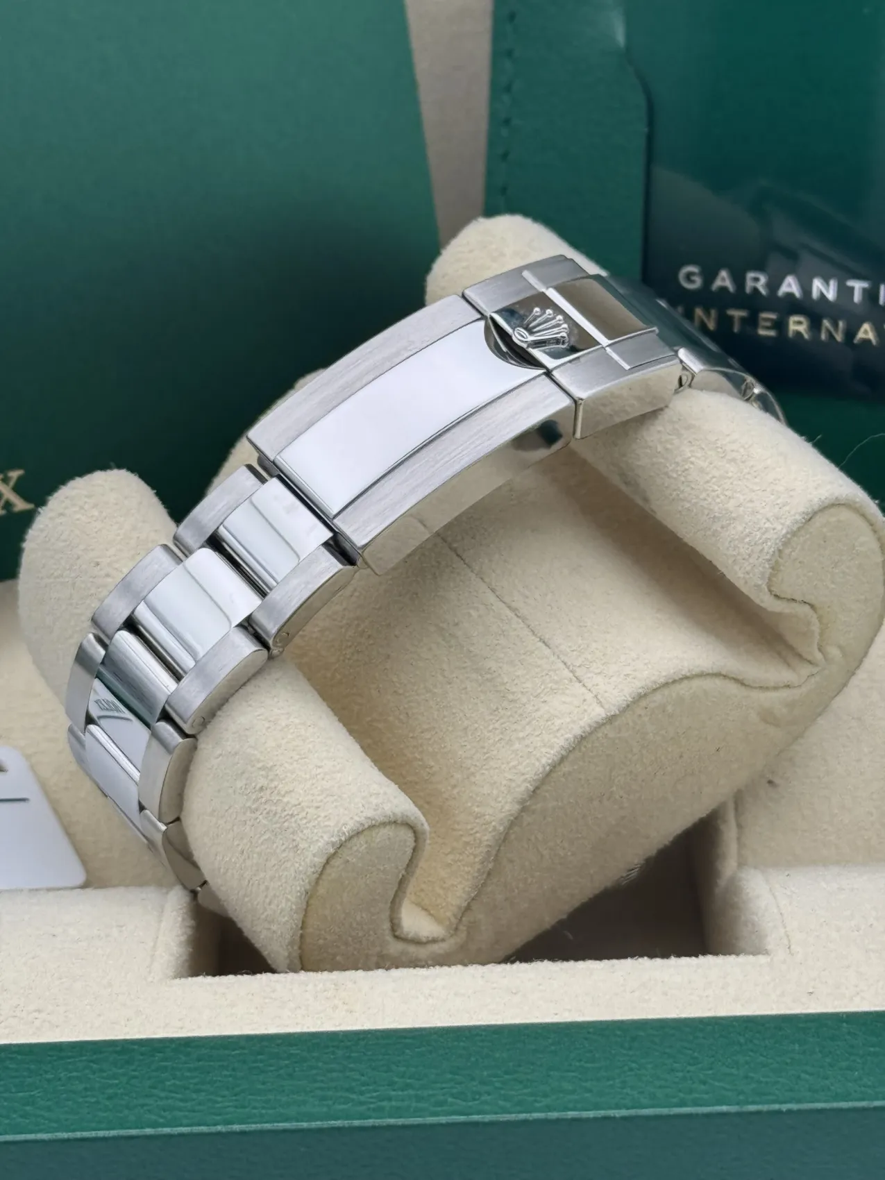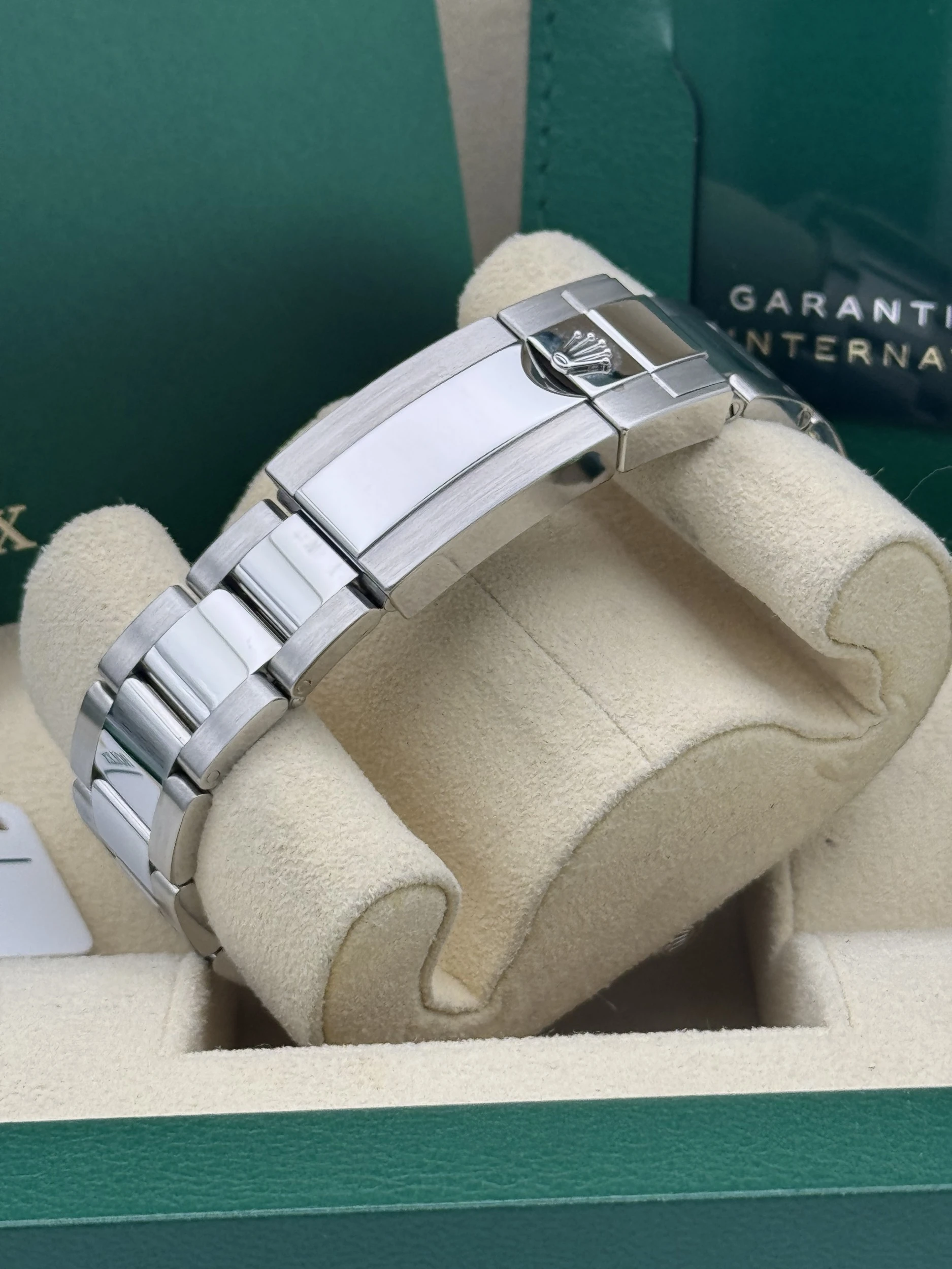 This Rolex GMT-Master II 126710BLNR, known as the “Batman,” features a stainless steel case, black and blue Cerachrom ceramic bezel, black dial, and the classic Oyster bracelet. Powered by Rolex’s automatic dual-time movement and presented in excellent condition, this 2022 model is a modern GMT icon, prized for its distinctive bi-color bezel and robust functionality.