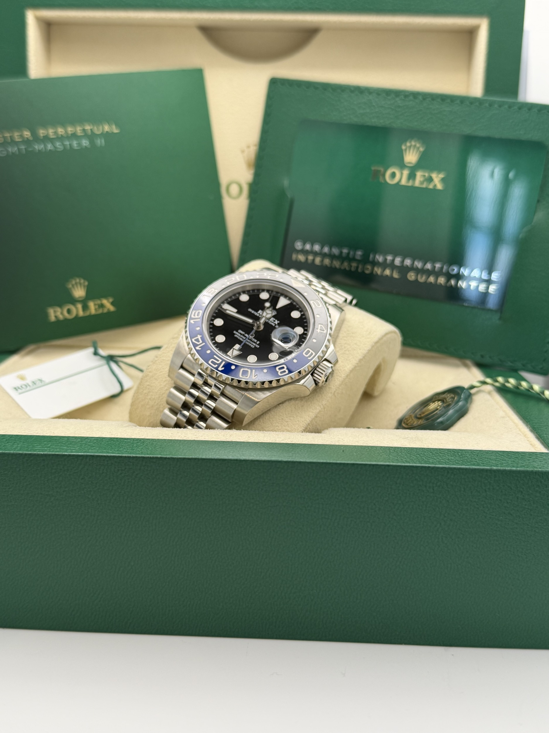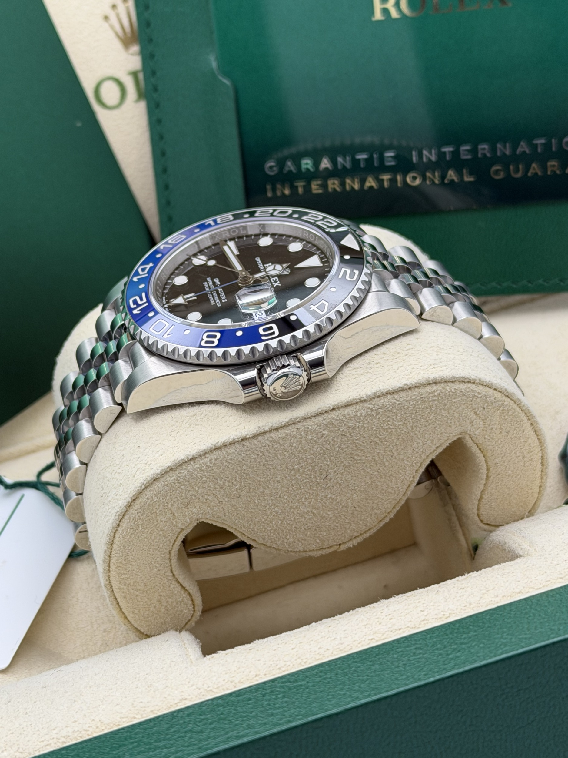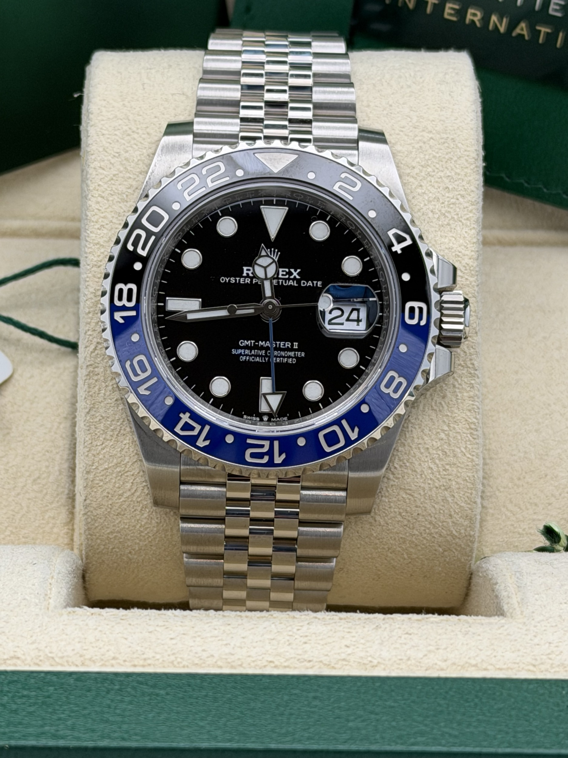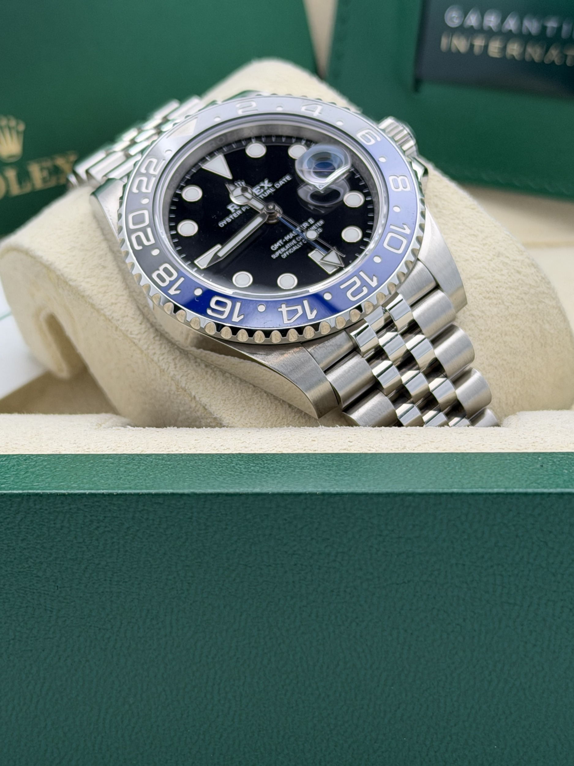 This Rolex GMT-Master II features a 40mm stainless steel case, black and blue Cerachrom “Batgirl” bezel, black dial, Jubilee bracelet, and the Calibre 3285 automatic GMT movement, offered in excellent condition.