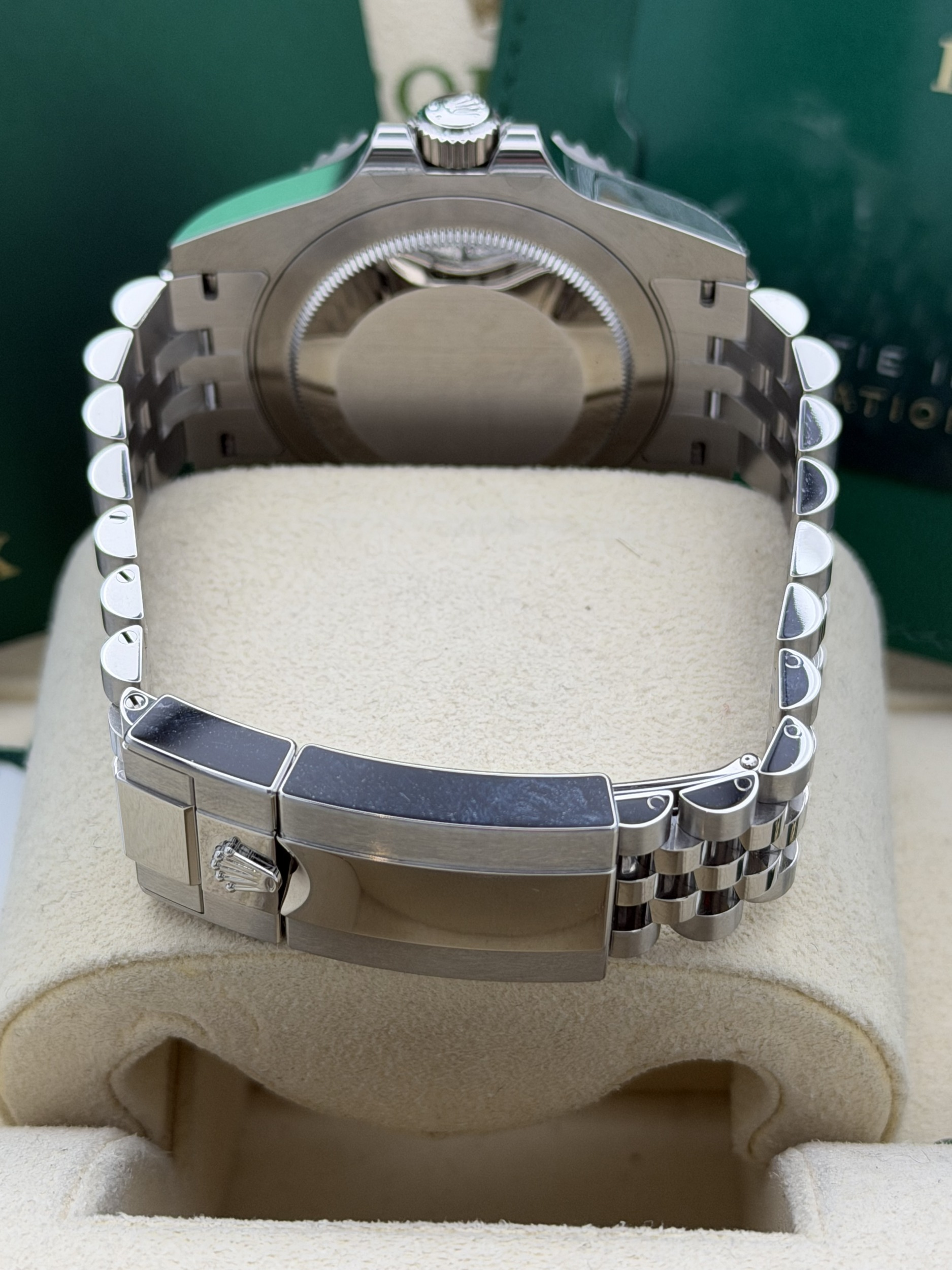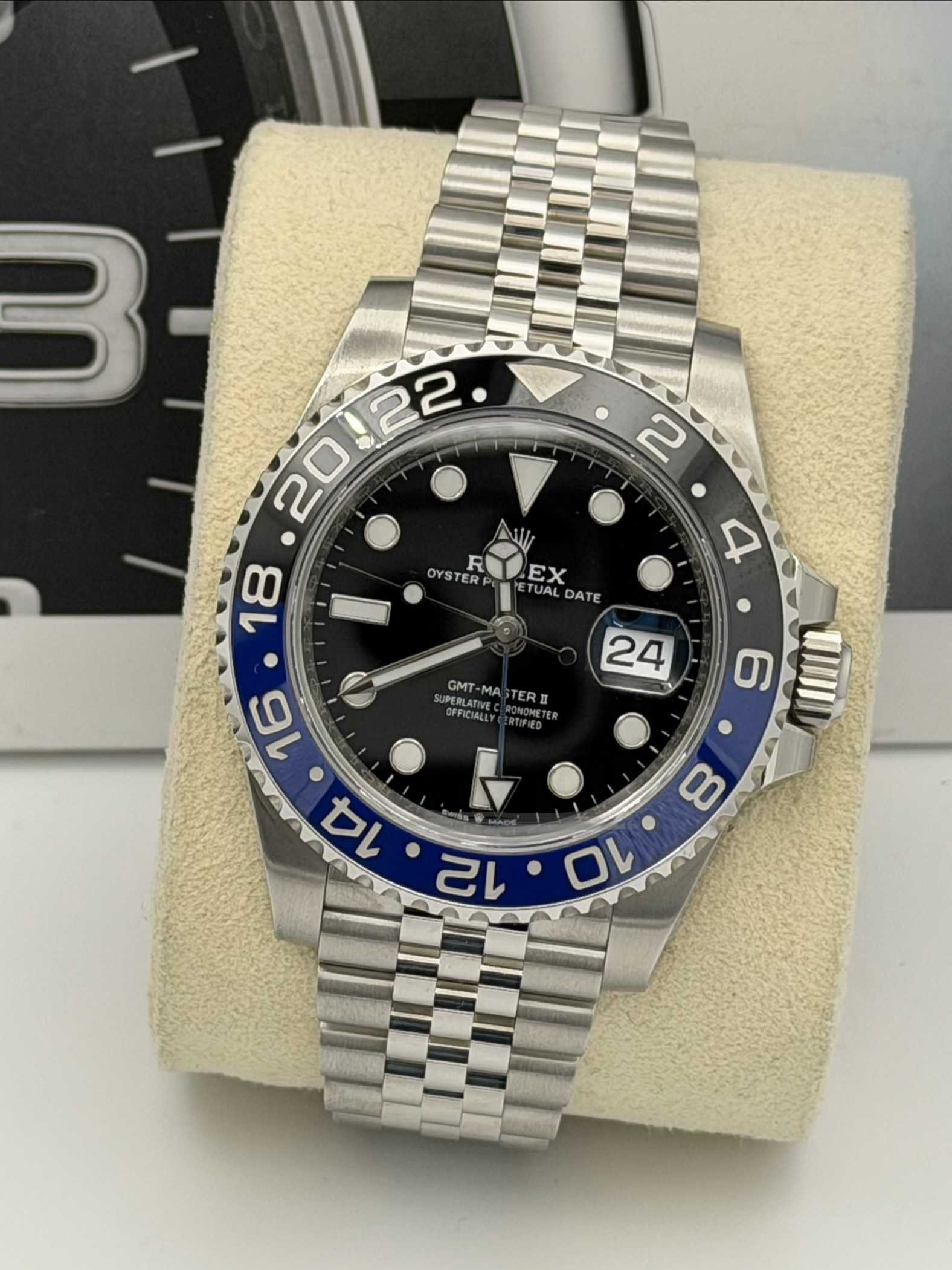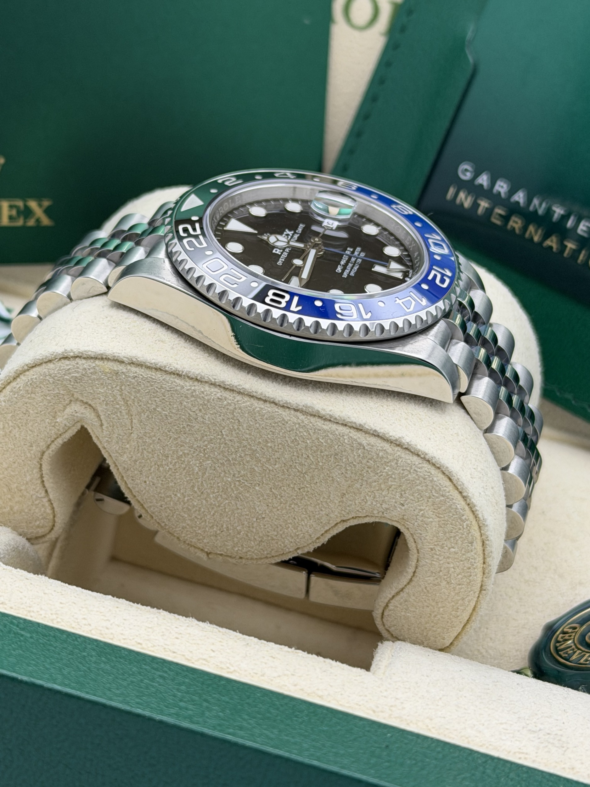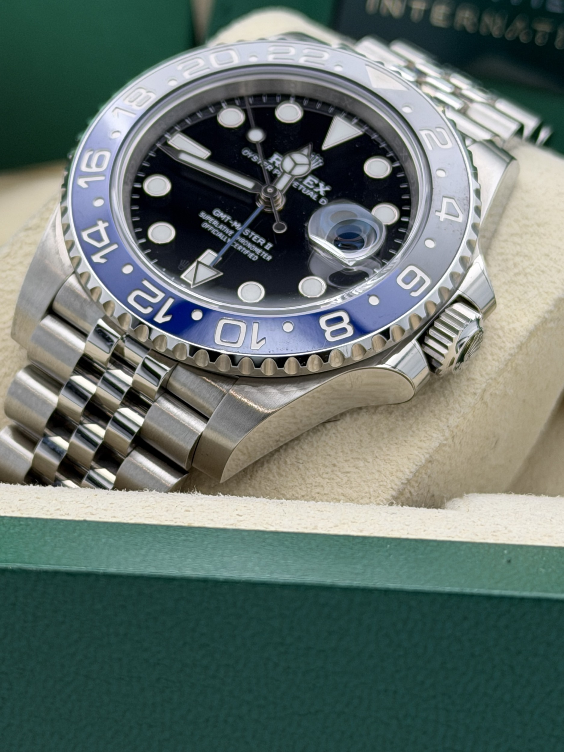 This Rolex GMT-Master II features a 40mm stainless steel case, black and blue Cerachrom “Batgirl” bezel, black dial, Jubilee bracelet, and the Calibre 3285 automatic GMT movement, offered in excellent condition.