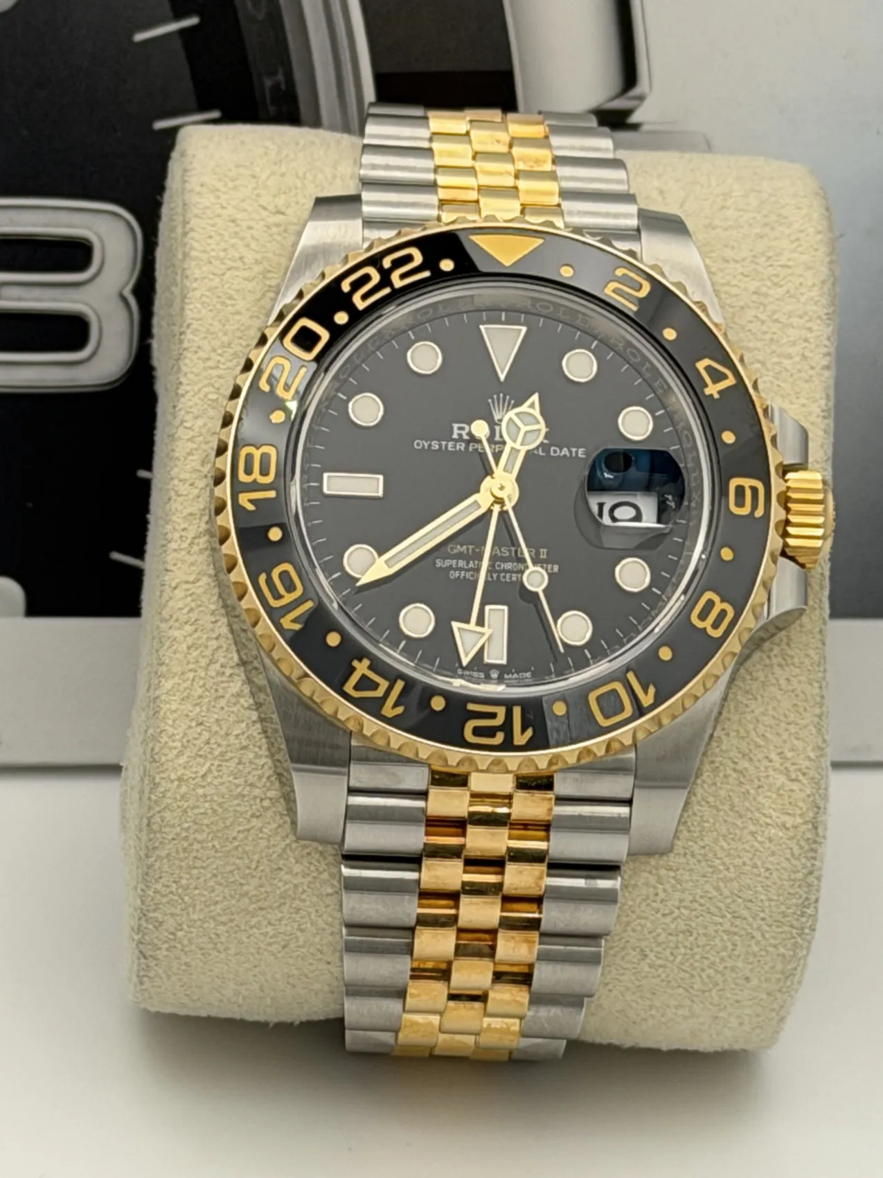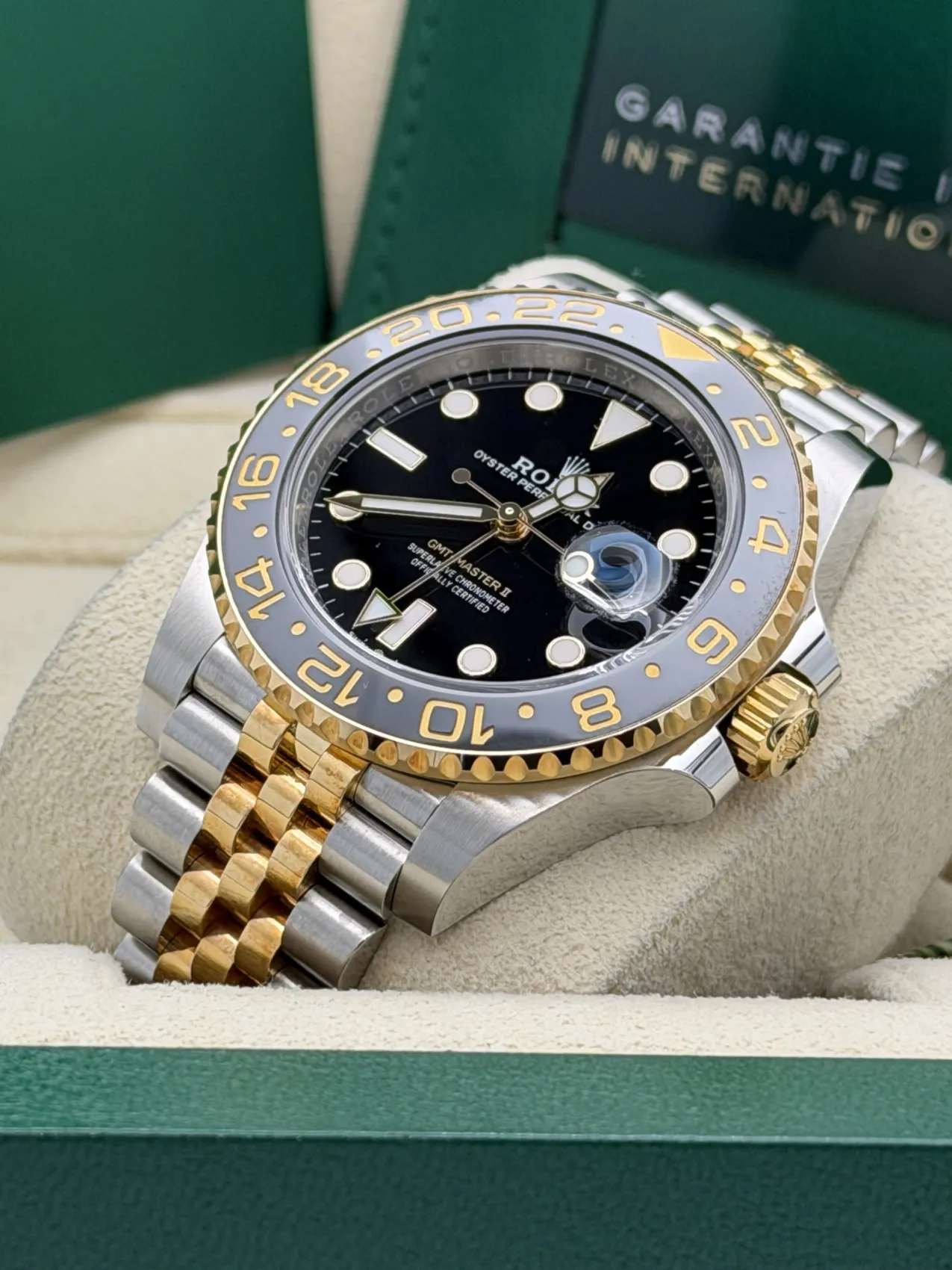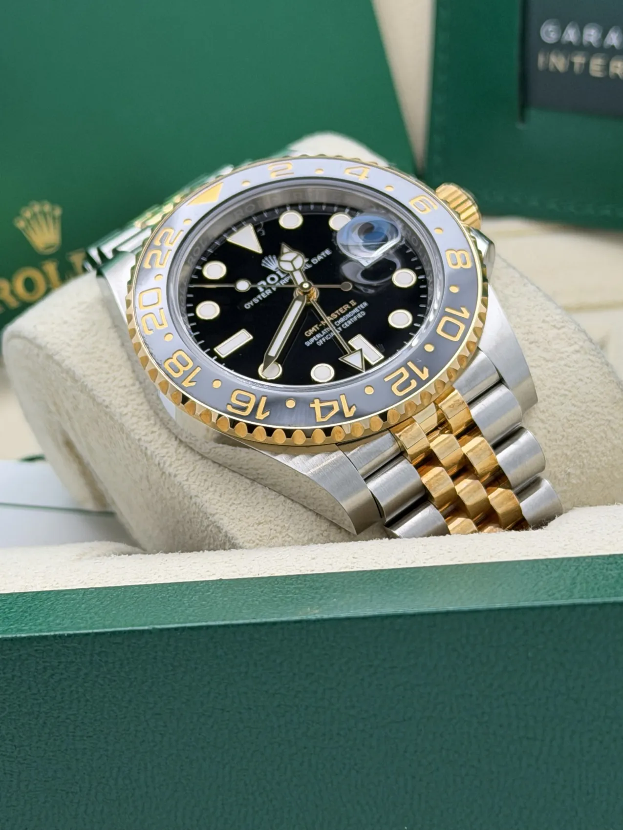 This Rolex GMT-Master II 40mm reference 126713GRNR, nicknamed the “Zombie,” features a stainless steel and 18ct yellow gold case paired with the striking black and grey Cerachrom bezel insert. Fitted to the elegant yet sporty Jubilee bracelet in yellow Rolesor, this configuration blends contemporary design with classic GMT heritage.The black dial is complemented by luminous hour markers and hands, along with the signature GMT hand allowing the tracking of a second time zone via the bidirectional 24-hour bezel. Powered by the Rolex calibre 3285 automatic movement, it offers Chronergy escapement technology and approximately 70 hours of power reserve, ensuring precision and reliability.The contrast between the monochrome bezel and the warmth of yellow gold gives the 126713GRNR a bold and modern presence, making it one of the most desirable current-production GMT-Master II models.