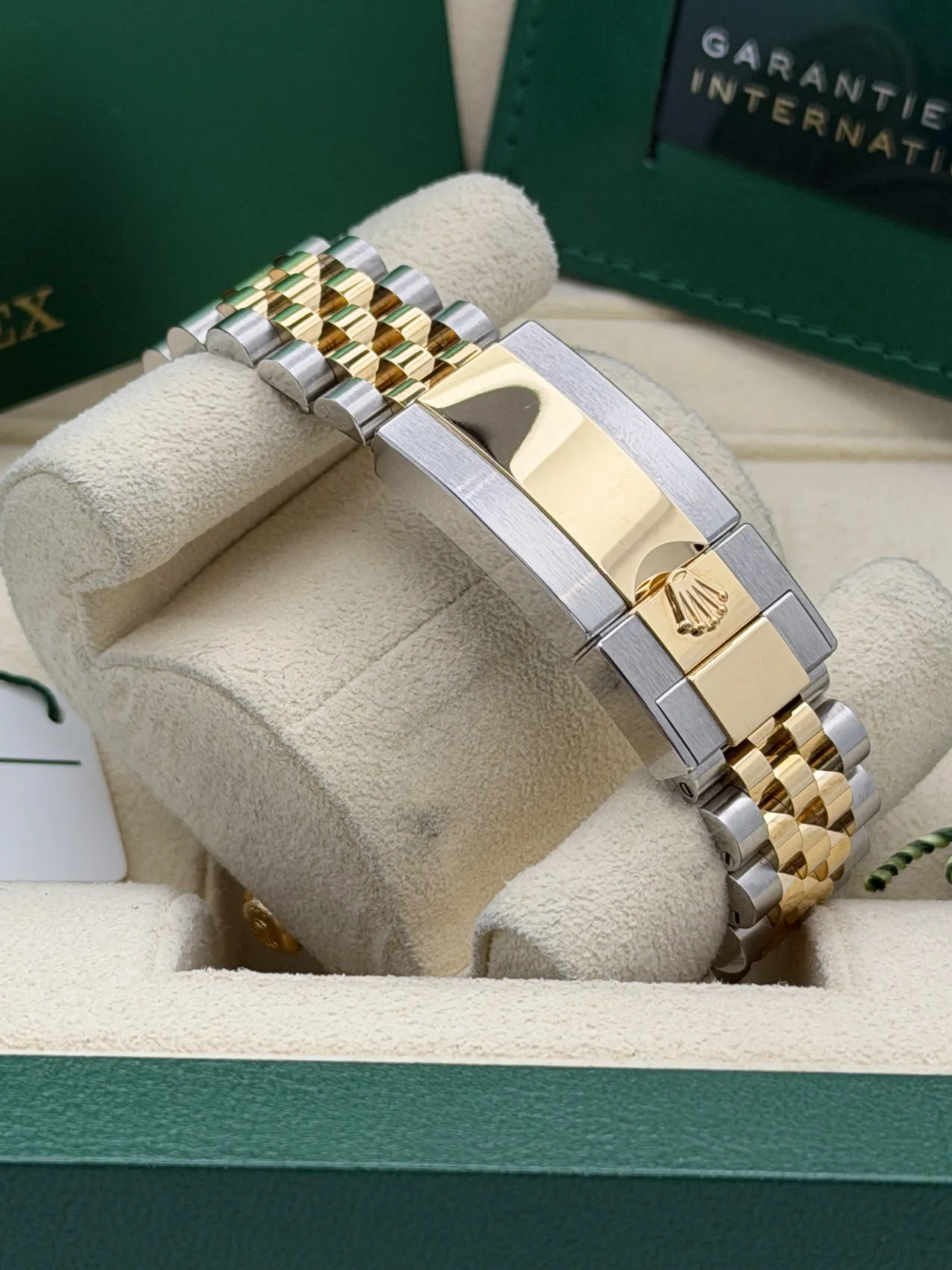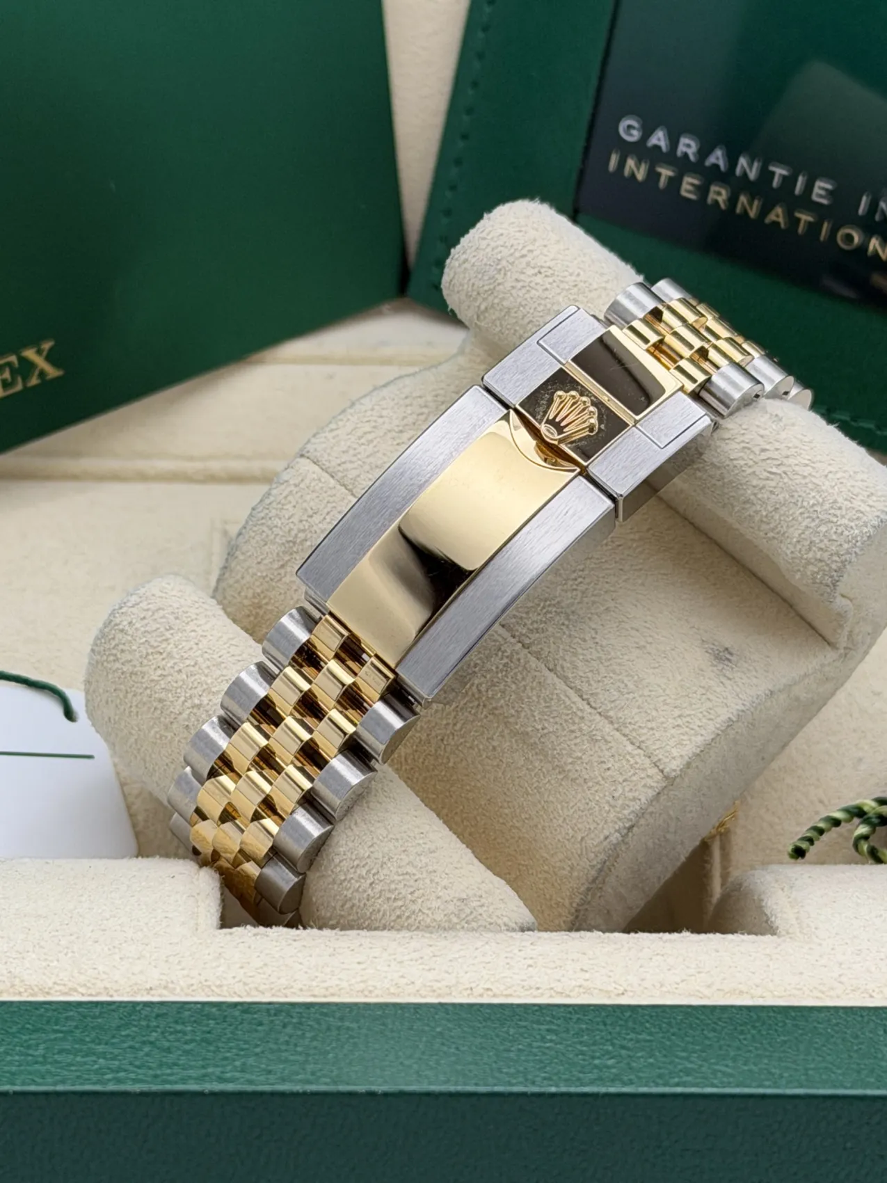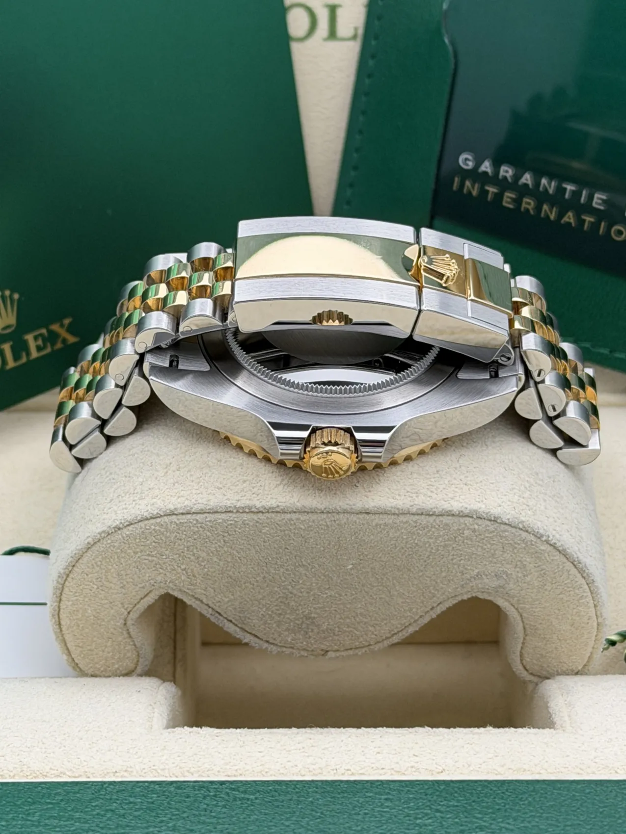 This Rolex GMT-Master II 40mm reference 126713GRNR, nicknamed the “Zombie,” features a stainless steel and 18ct yellow gold case paired with the striking black and grey Cerachrom bezel insert. Fitted to the elegant yet sporty Jubilee bracelet in yellow Rolesor, this configuration blends contemporary design with classic GMT heritage.The black dial is complemented by luminous hour markers and hands, along with the signature GMT hand allowing the tracking of a second time zone via the bidirectional 24-hour bezel. Powered by the Rolex calibre 3285 automatic movement, it offers Chronergy escapement technology and approximately 70 hours of power reserve, ensuring precision and reliability.The contrast between the monochrome bezel and the warmth of yellow gold gives the 126713GRNR a bold and modern presence, making it one of the most desirable current-production GMT-Master II models.