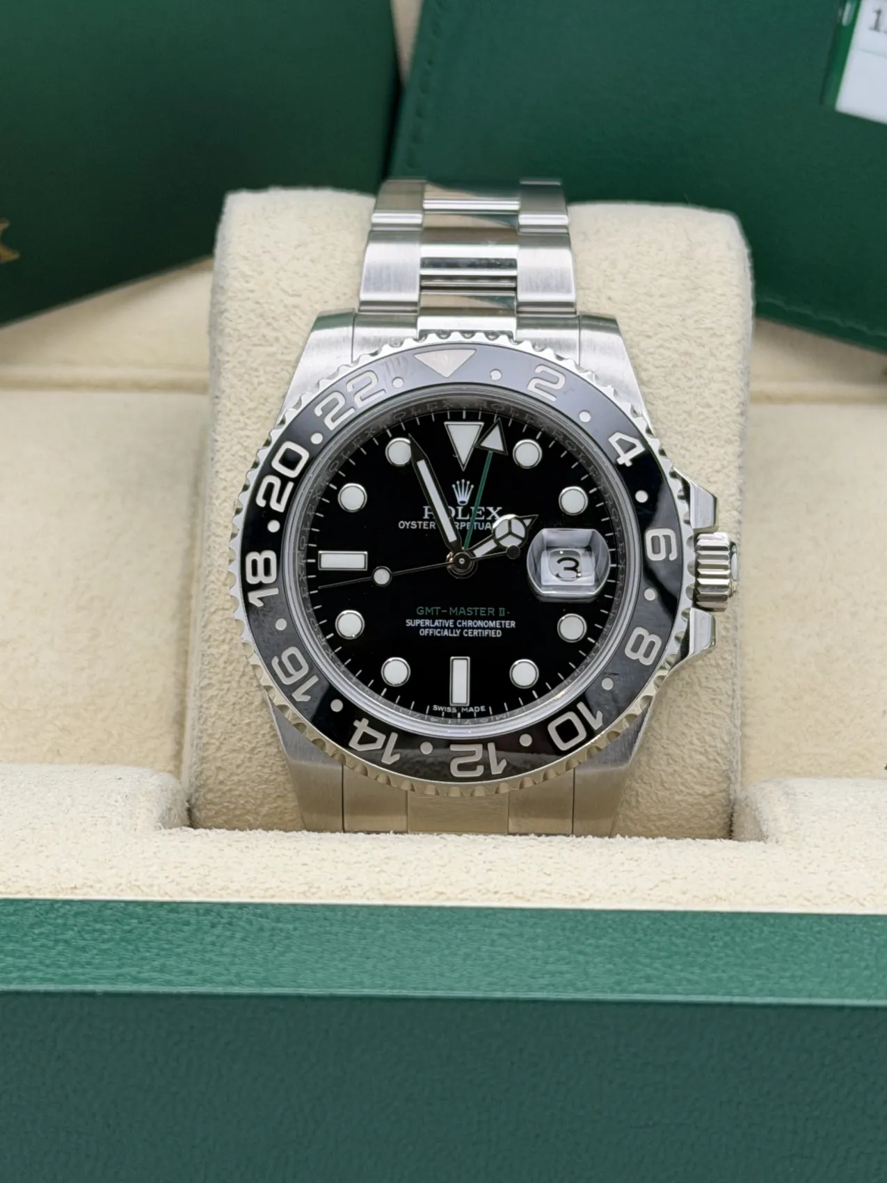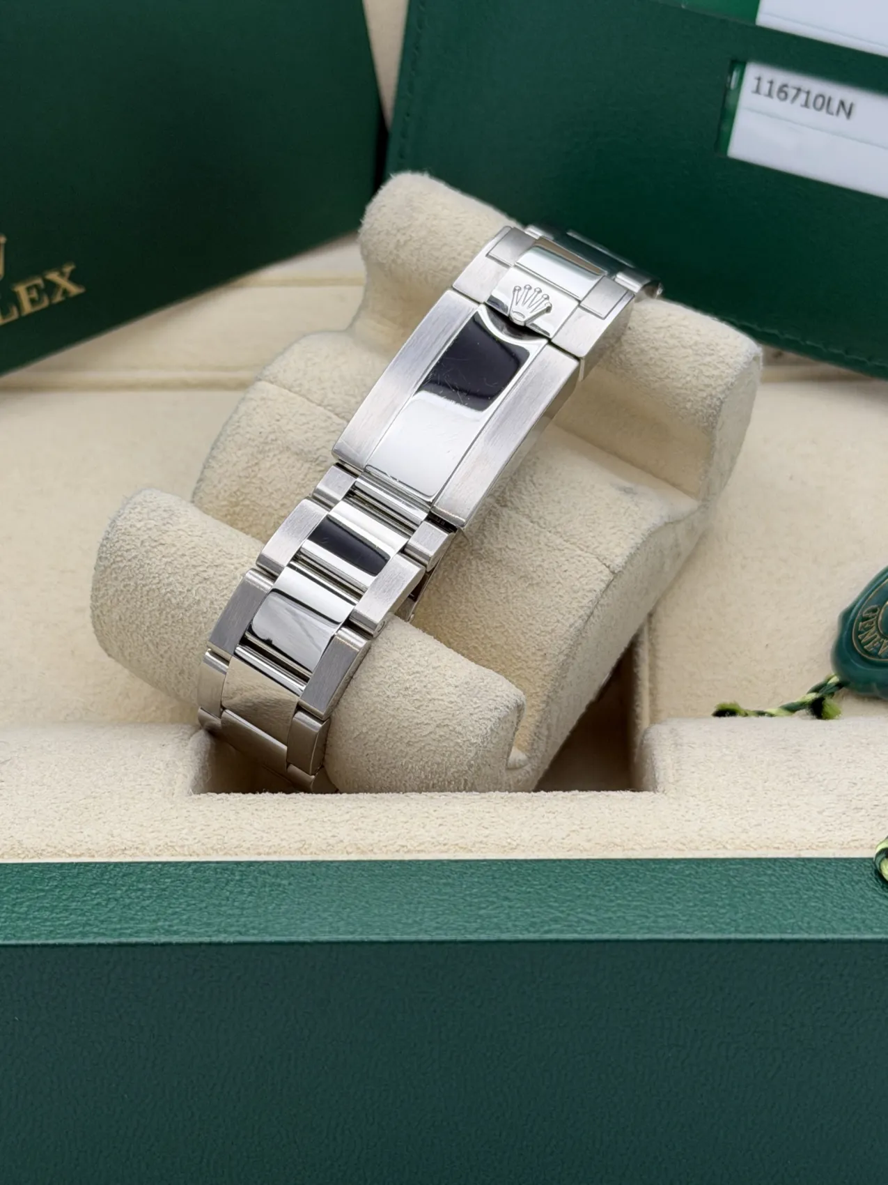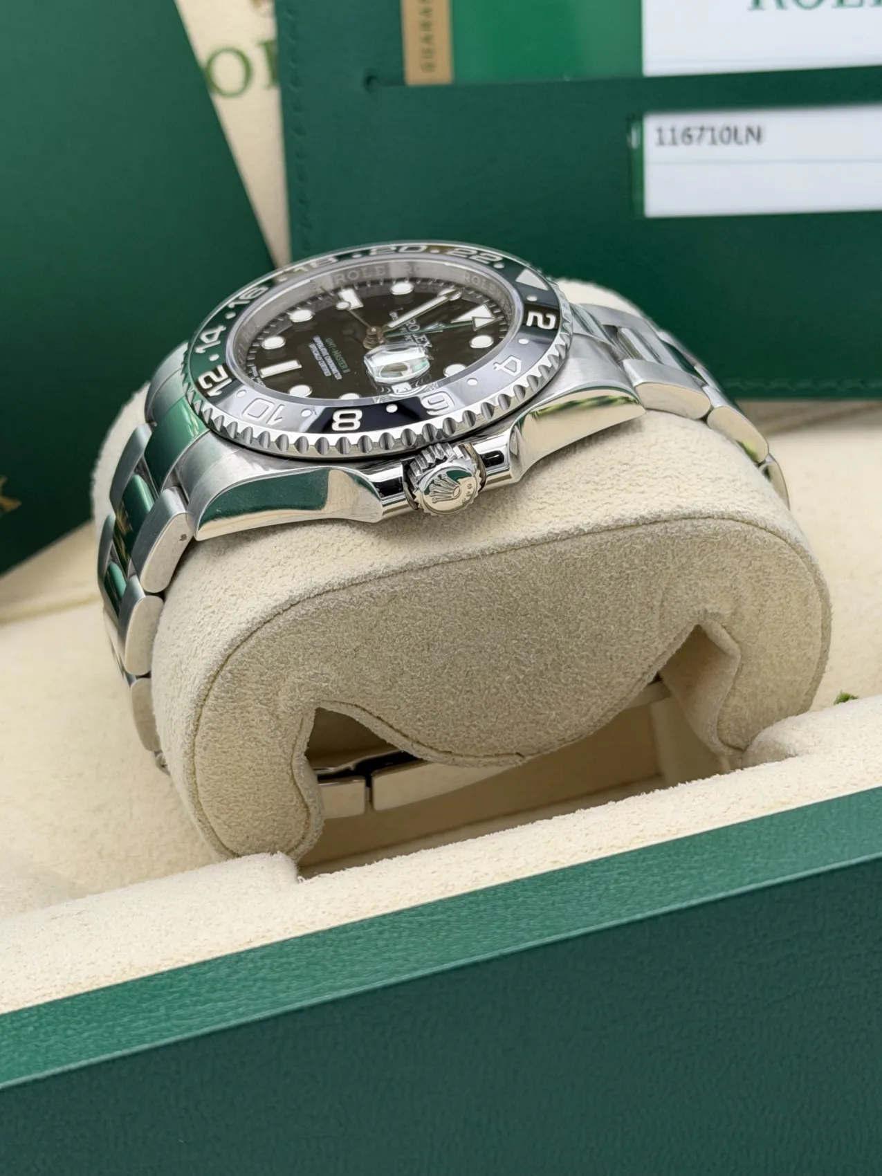 This Rolex GMT-Master II 40mm reference 116710LN features a stainless steel case paired with a sleek black Cerachrom bezel insert and matching black dial. Fitted to the classic Oyster bracelet with Oysterlock safety clasp and Easylink extension, this model offers a clean, versatile aesthetic within the GMT-Master II range.The 24-hour graduated ceramic bezel works in conjunction with the independently adjustable green GMT hand, allowing the wearer to track a second time zone with ease. Powered by the Rolex calibre 3186 automatic movement, the watch delivers proven reliability and precision, making it a practical companion for travel and everyday wear.Discontinued and increasingly sought after, the 116710LN represents the final all-black bezel GMT-Master II of its generation. Presented in excellent 2017 condition, it remains a highly collectible modern Rolex sports model.