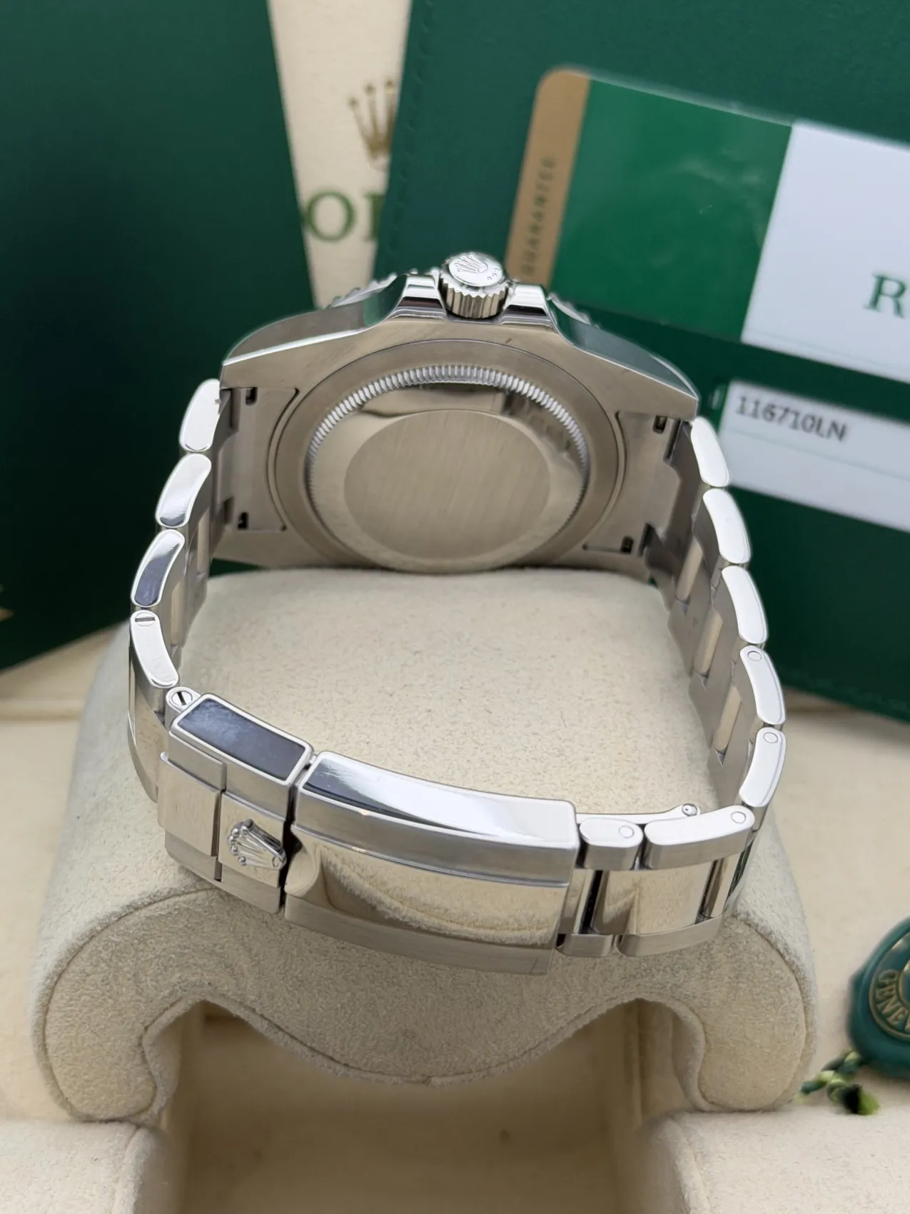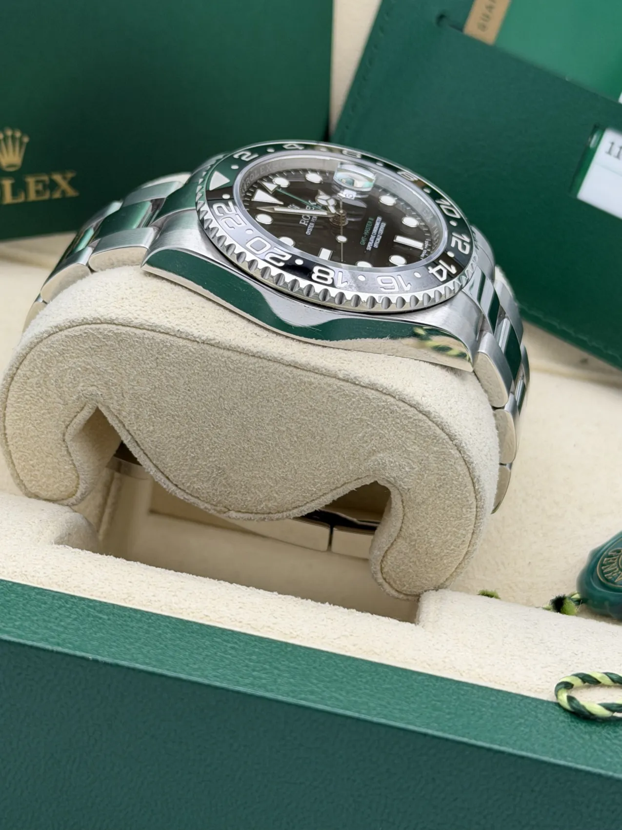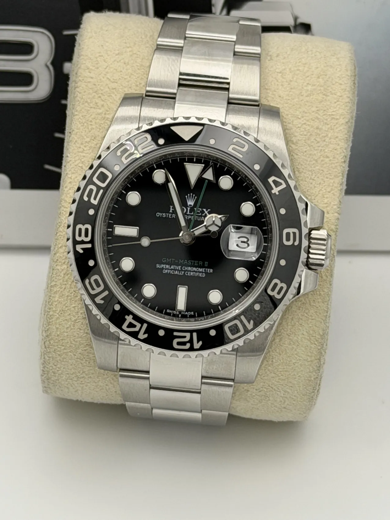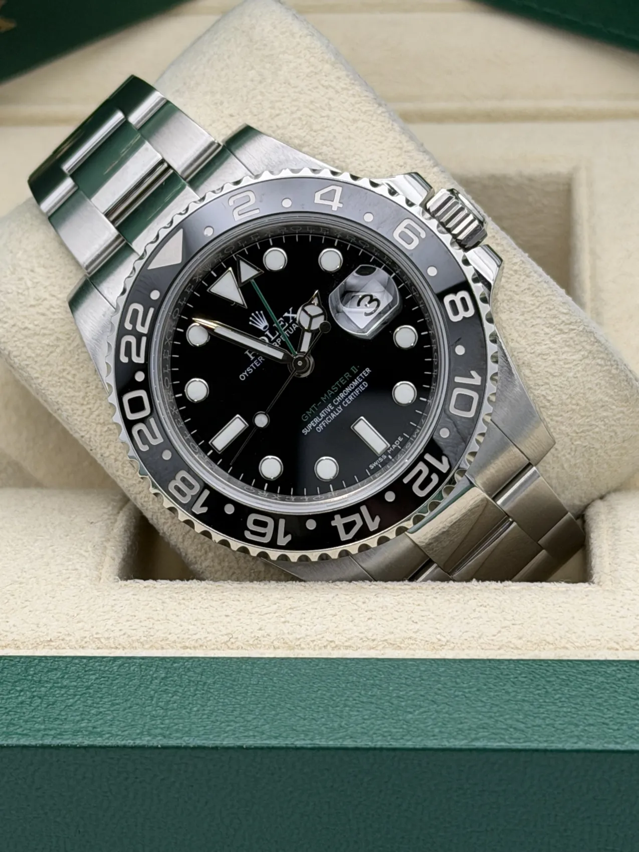 This Rolex GMT-Master II 40mm reference 116710LN features a stainless steel case paired with a sleek black Cerachrom bezel insert and matching black dial. Fitted to the classic Oyster bracelet with Oysterlock safety clasp and Easylink extension, this model offers a clean, versatile aesthetic within the GMT-Master II range.The 24-hour graduated ceramic bezel works in conjunction with the independently adjustable green GMT hand, allowing the wearer to track a second time zone with ease. Powered by the Rolex calibre 3186 automatic movement, the watch delivers proven reliability and precision, making it a practical companion for travel and everyday wear.Discontinued and increasingly sought after, the 116710LN represents the final all-black bezel GMT-Master II of its generation. Presented in excellent 2017 condition, it remains a highly collectible modern Rolex sports model.