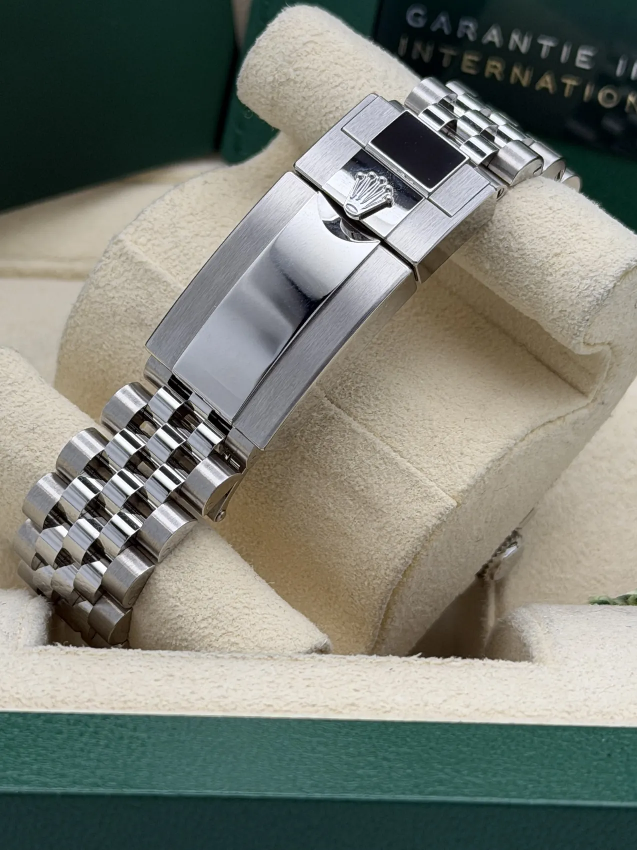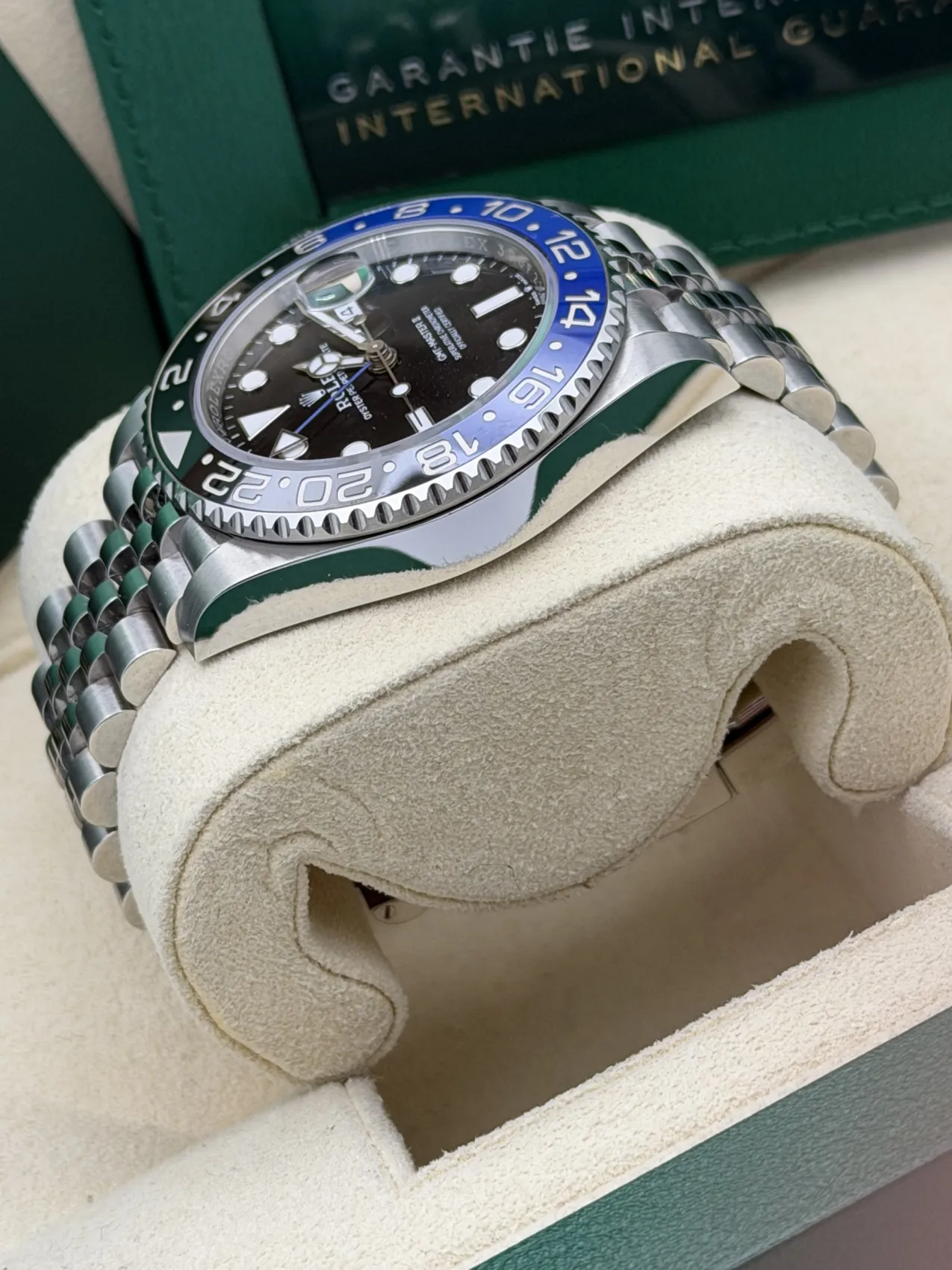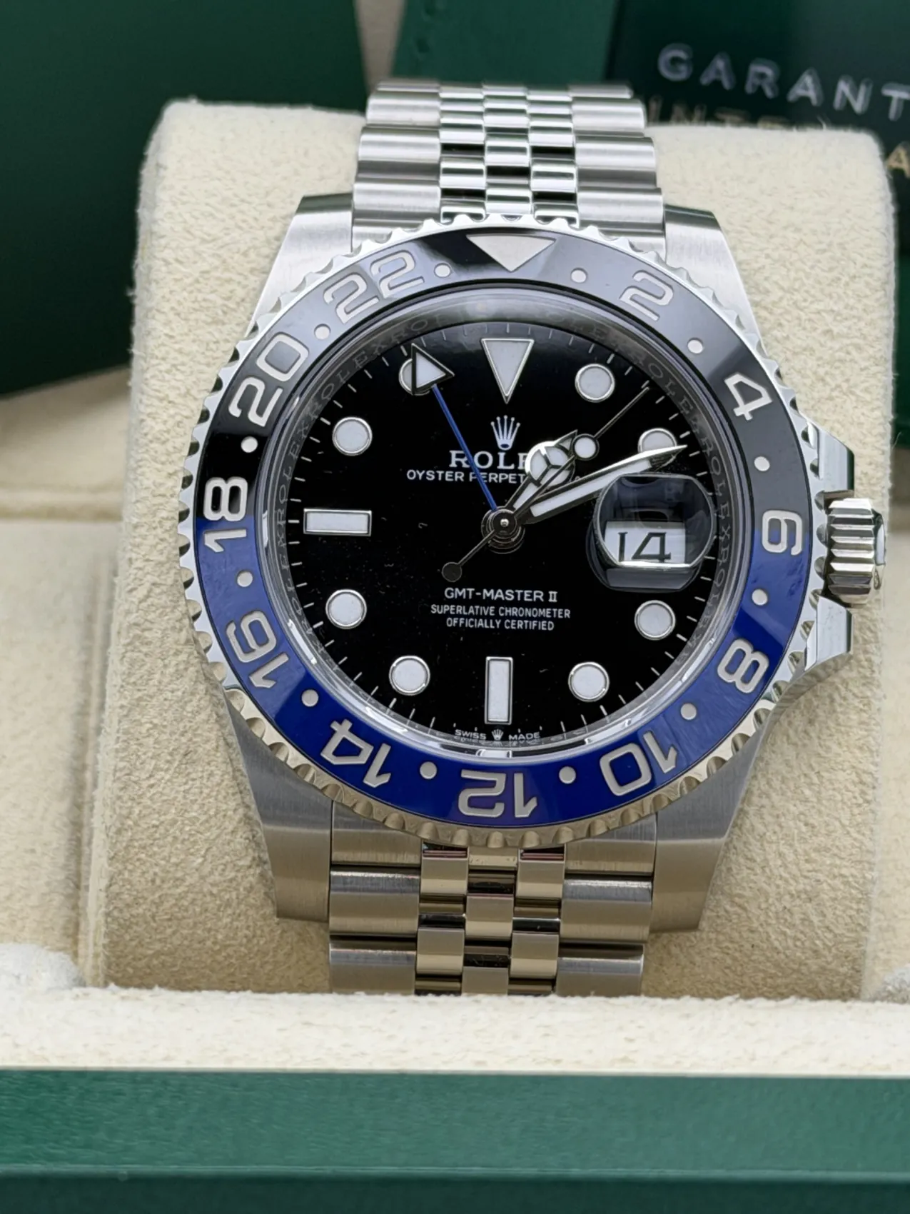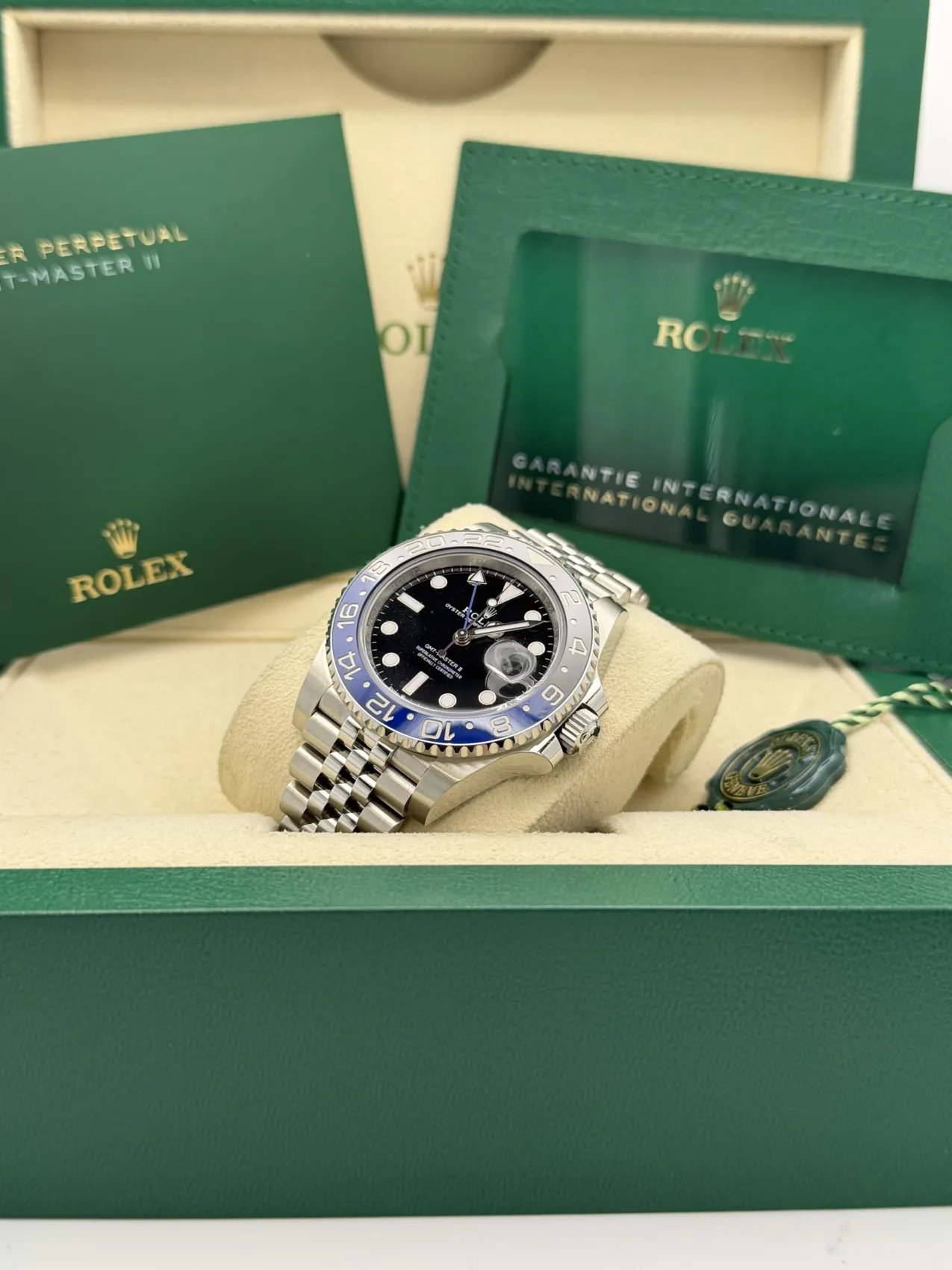 This Rolex GMT-Master II features a 40mm stainless steel case, black and blue Cerachrom “Batgirl” bezel, black dial, Jubilee bracelet, and the Calibre 3285 automatic GMT movement, offered in unworn condition.