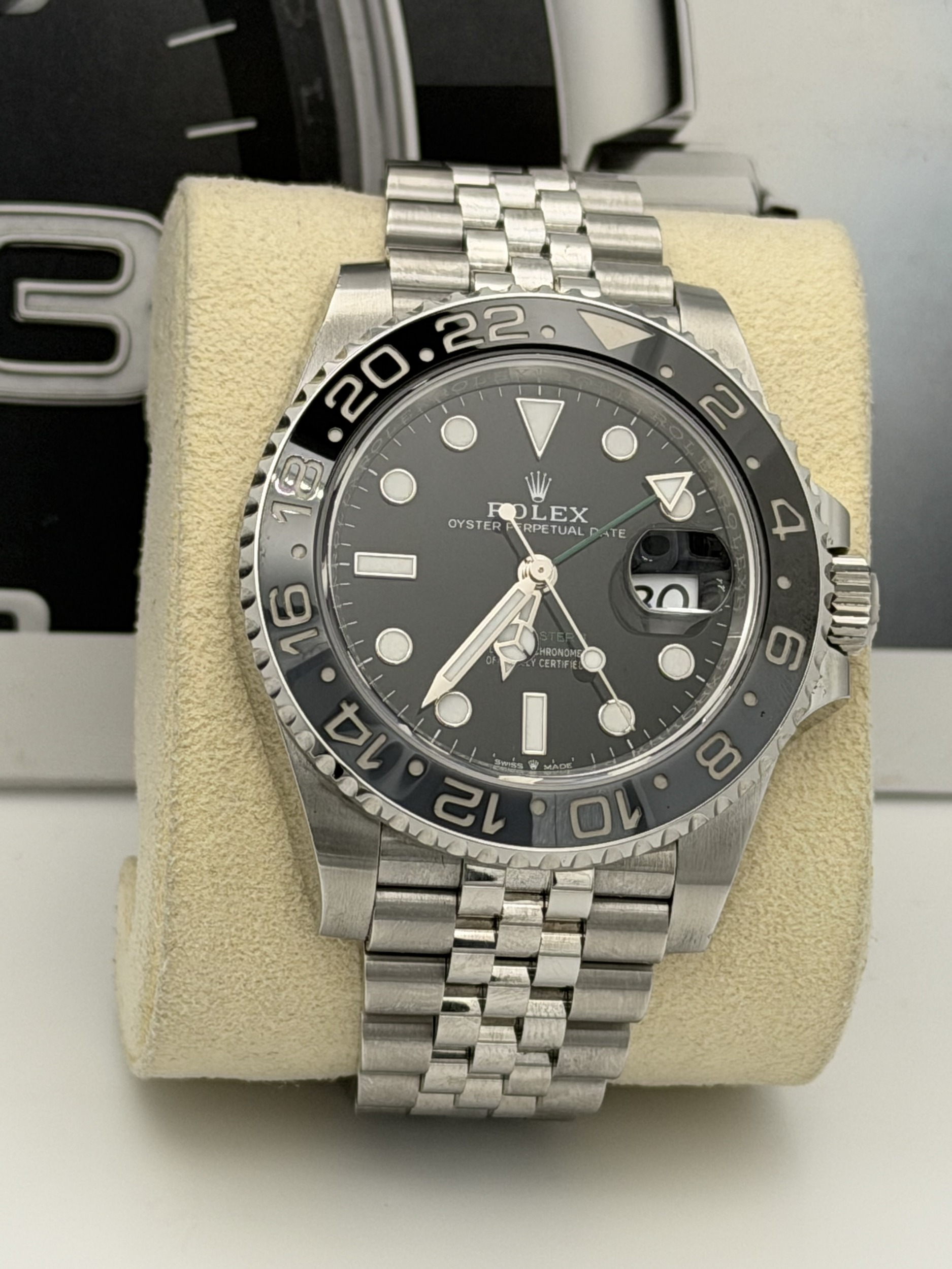 This Rolex GMT-Master II features a 40mm stainless steel case, black and grey Cerachrom “Bruce Wayne” bezel, black dial, Jubilee bracelet, and the Calibre 3285 automatic GMT movement, offered in excellent condition.