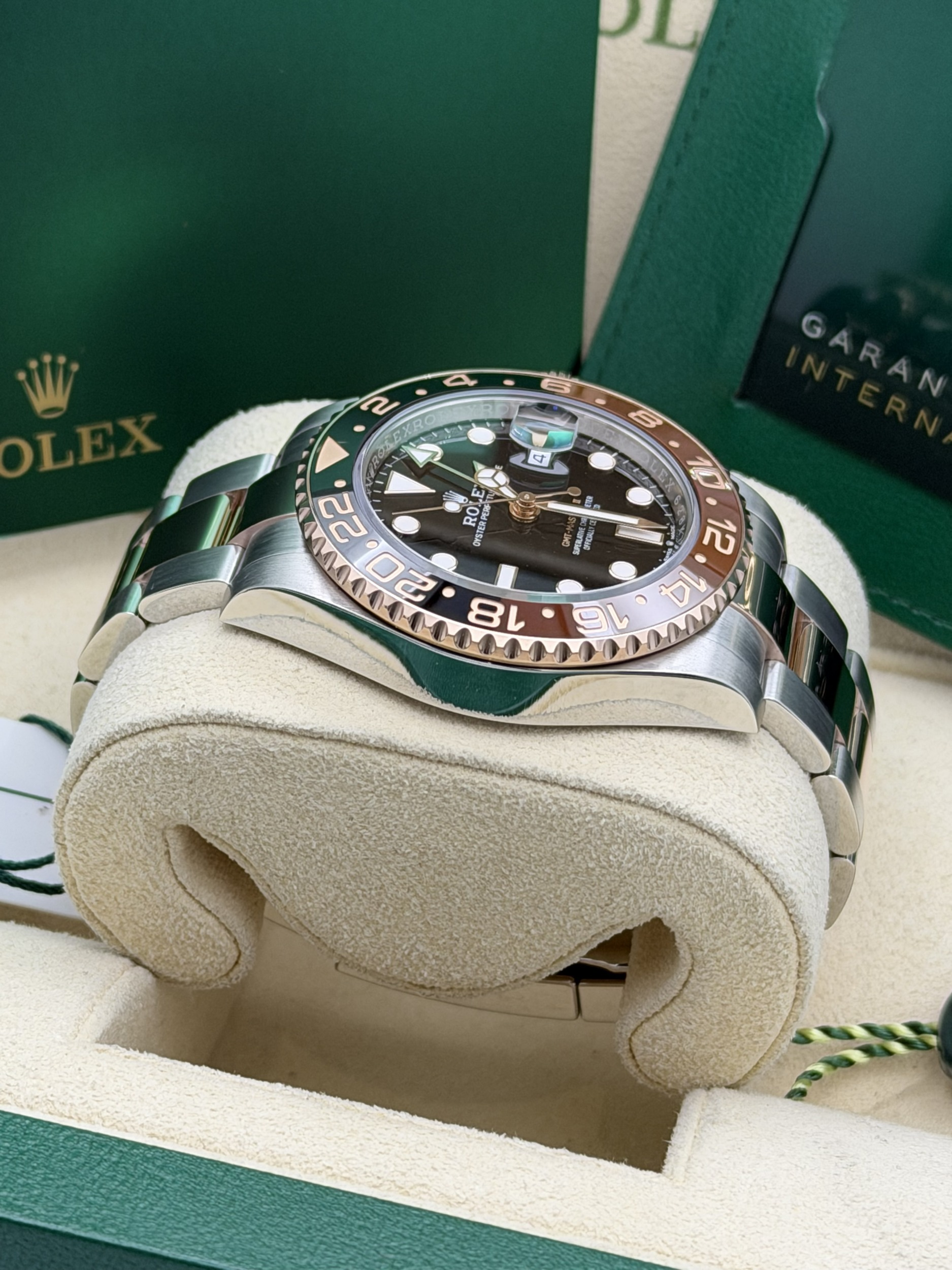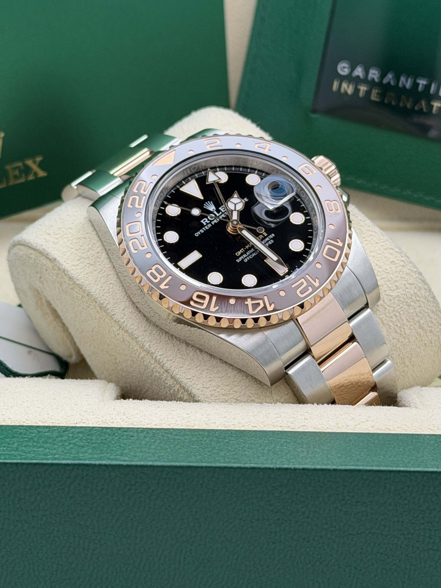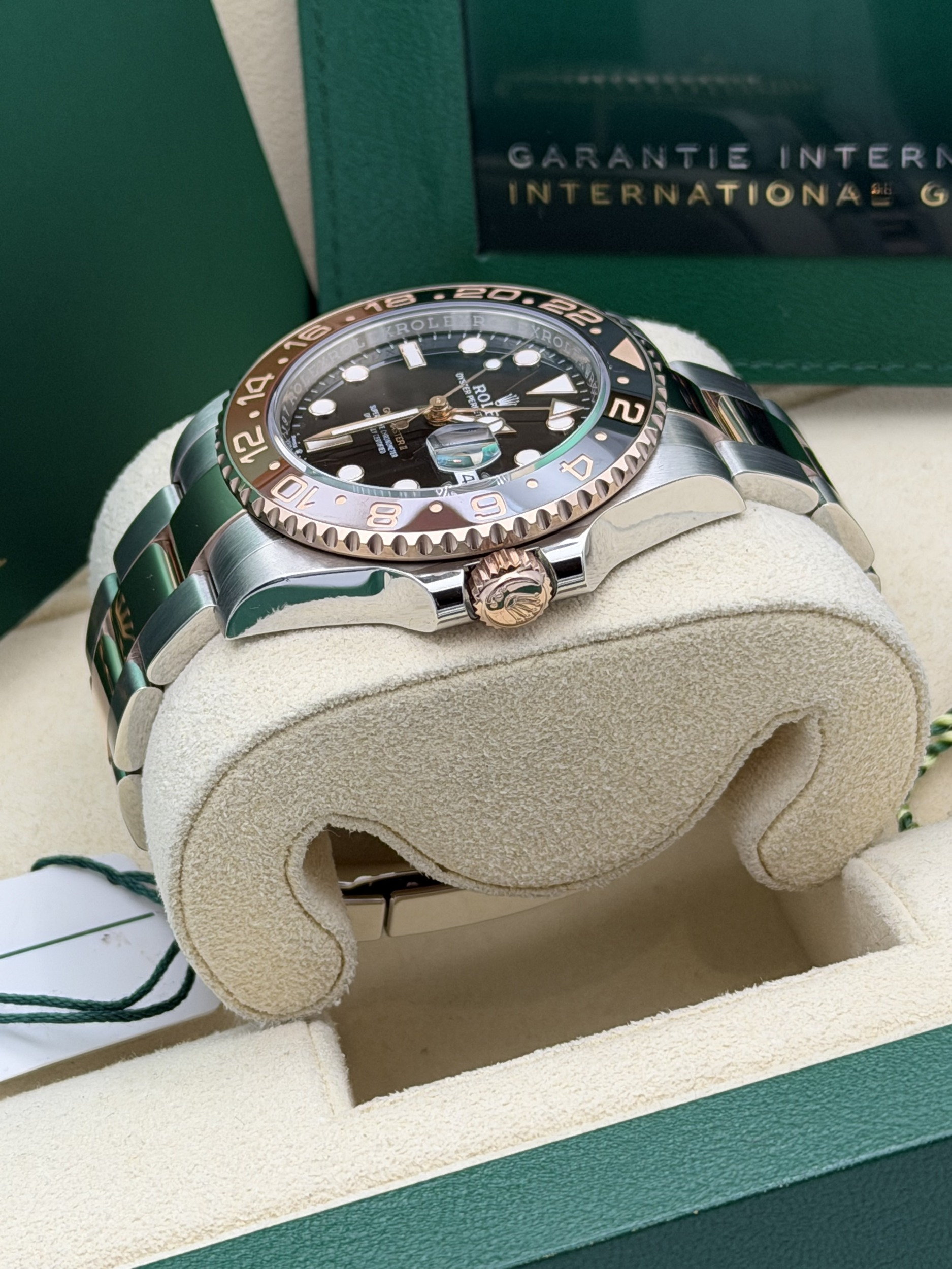 This Rolex GMT-Master II 40mm reference 126711CHNR features a stainless steel and 18ct Everose gold case, black dial, brown and black Cerachrom “Rootbeer” bezel, Oyster bracelet, and automatic GMT movement, presented in excellent 2024 condition.