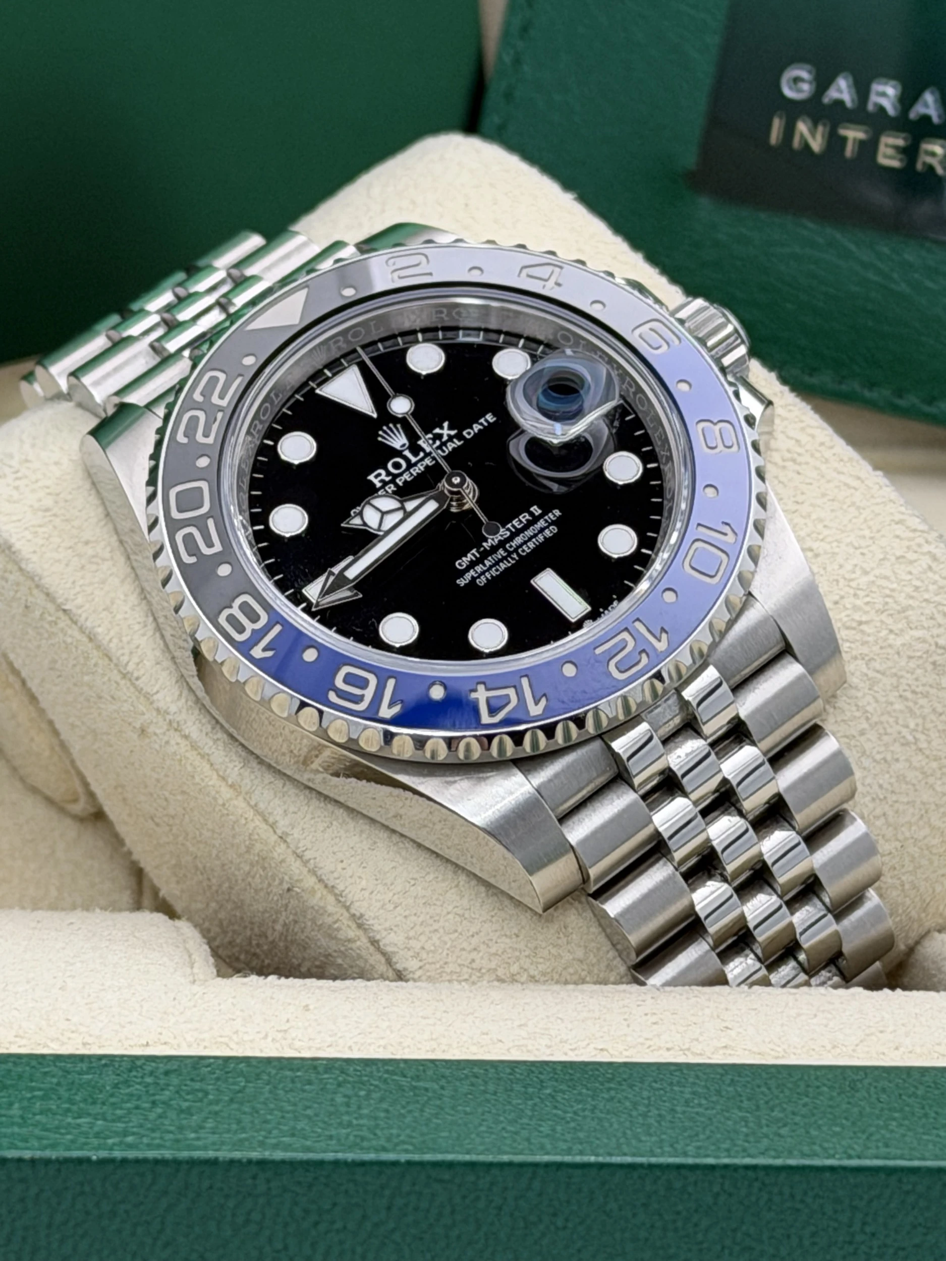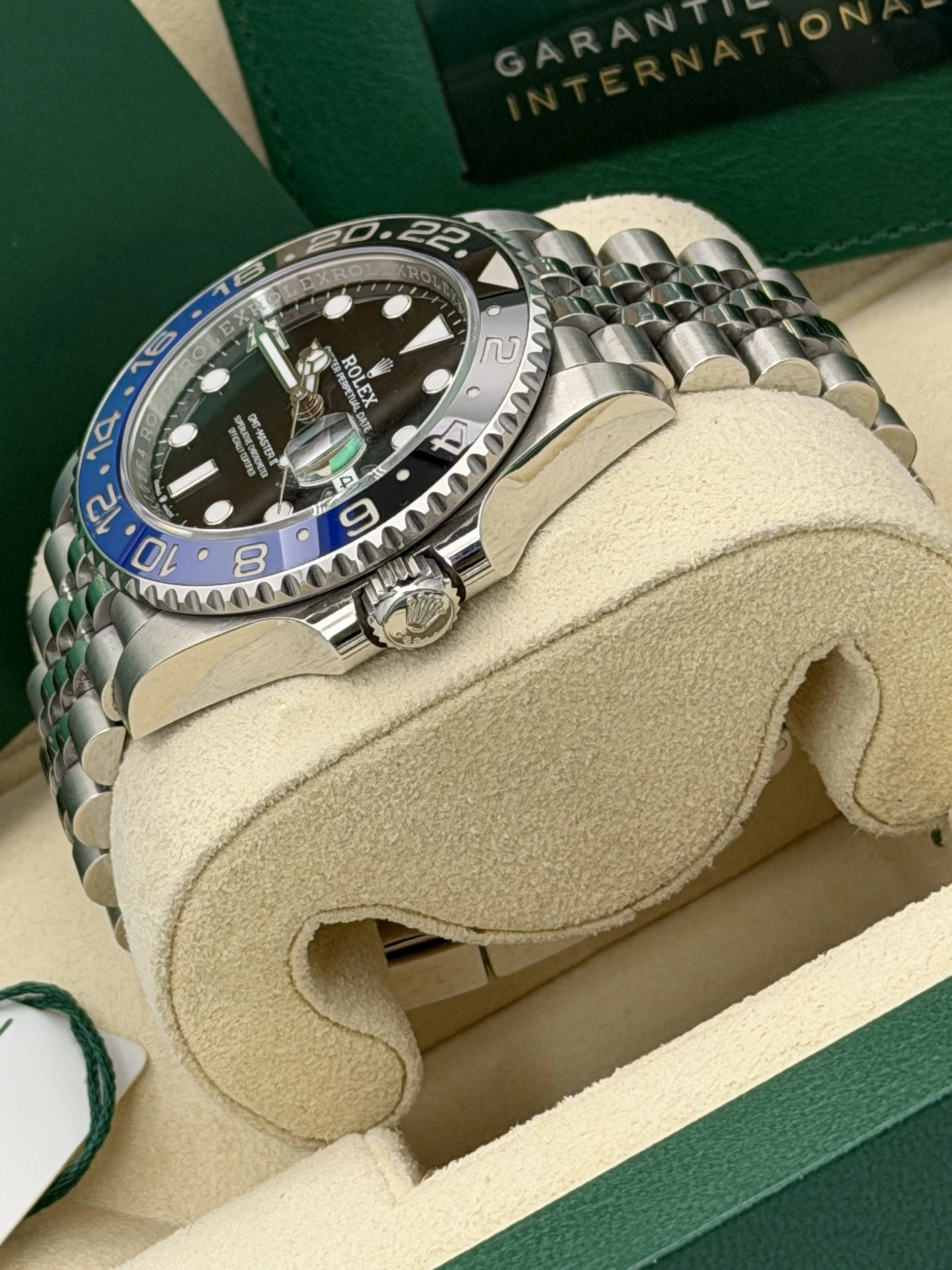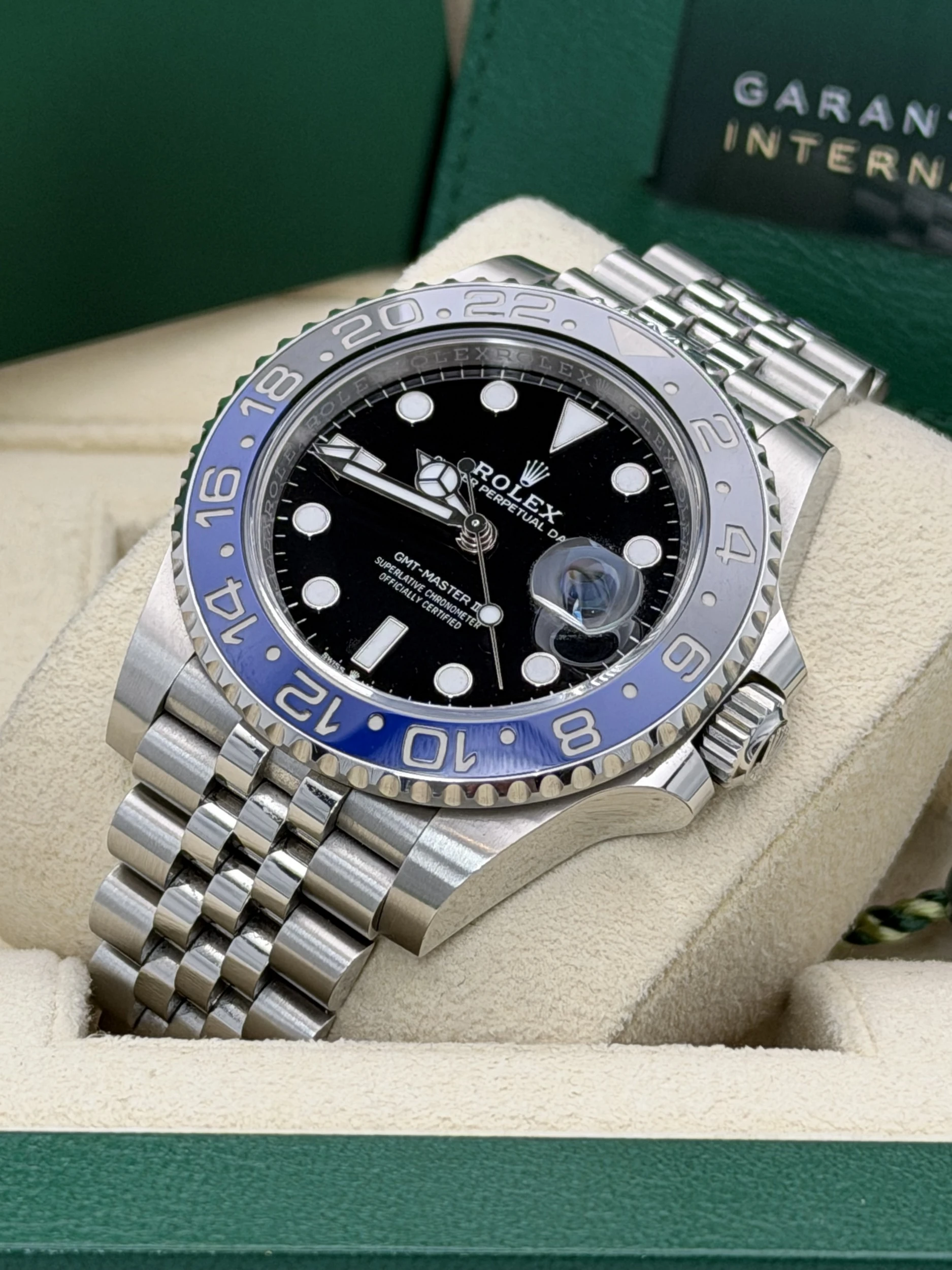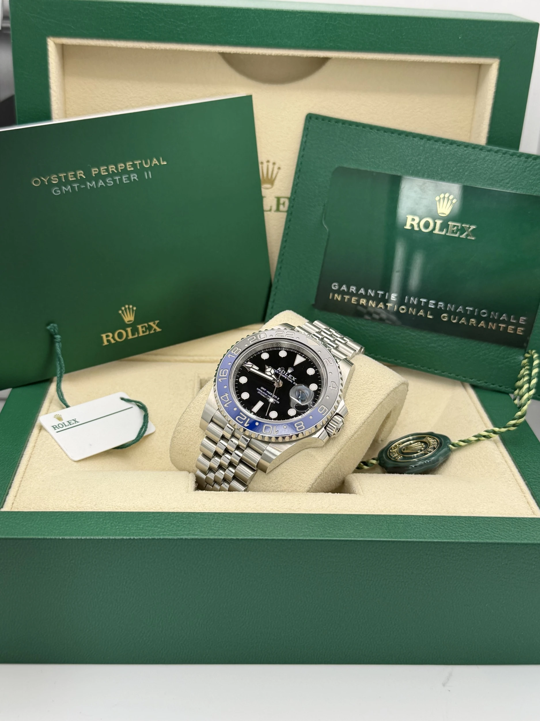 This Rolex GMT-Master II reference 126710BLNR features a 40mm stainless steel case, the iconic blue and black “Batman” Cerachrom ceramic bezel insert, and the highly refined stainless steel Jubilee bracelet. Powered by Rolex’s automatic calibre 3285 movement, this 2023 model offers exceptional accuracy, a 70-hour power reserve, and dual-time functionality—making it one of the most sought-after travel watches in the Rolex lineup.We offer a 12-month warranty on all watches with less than one year of remaining manufacturer or service warranty.