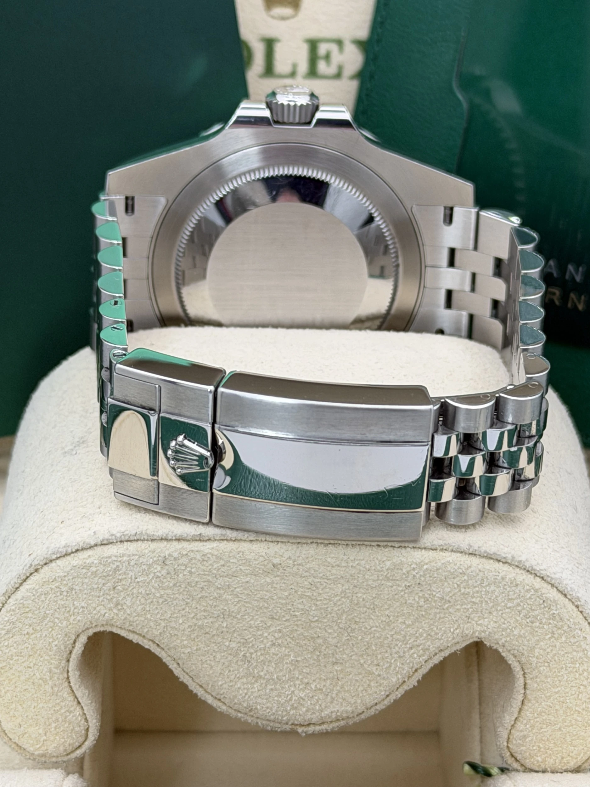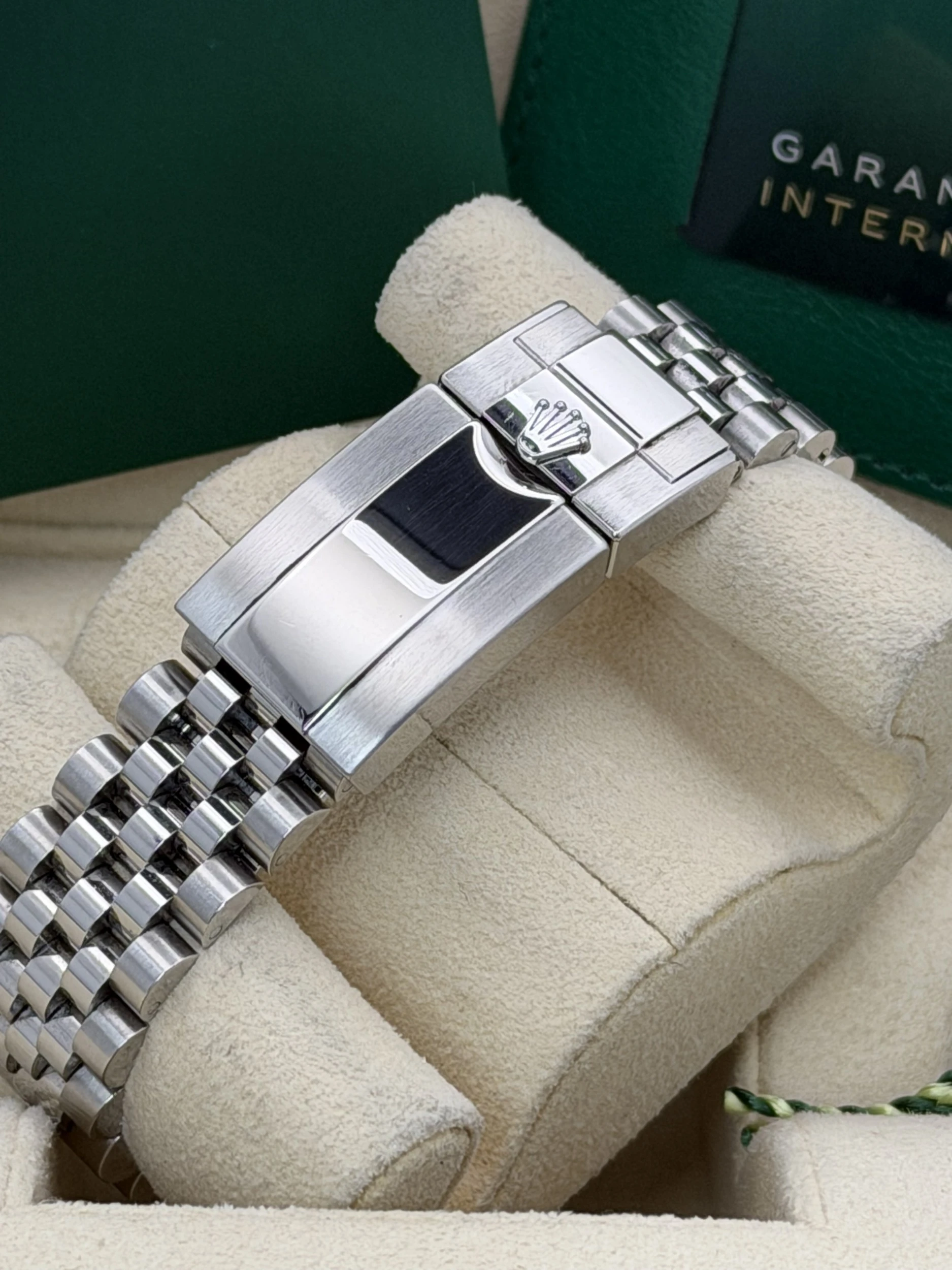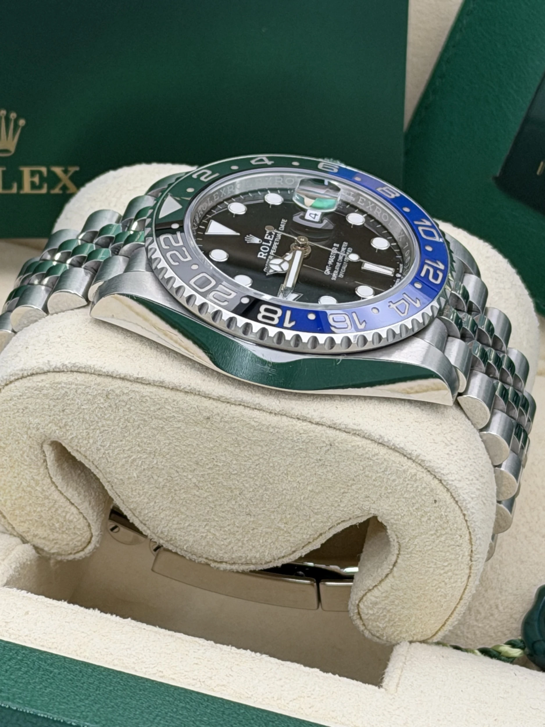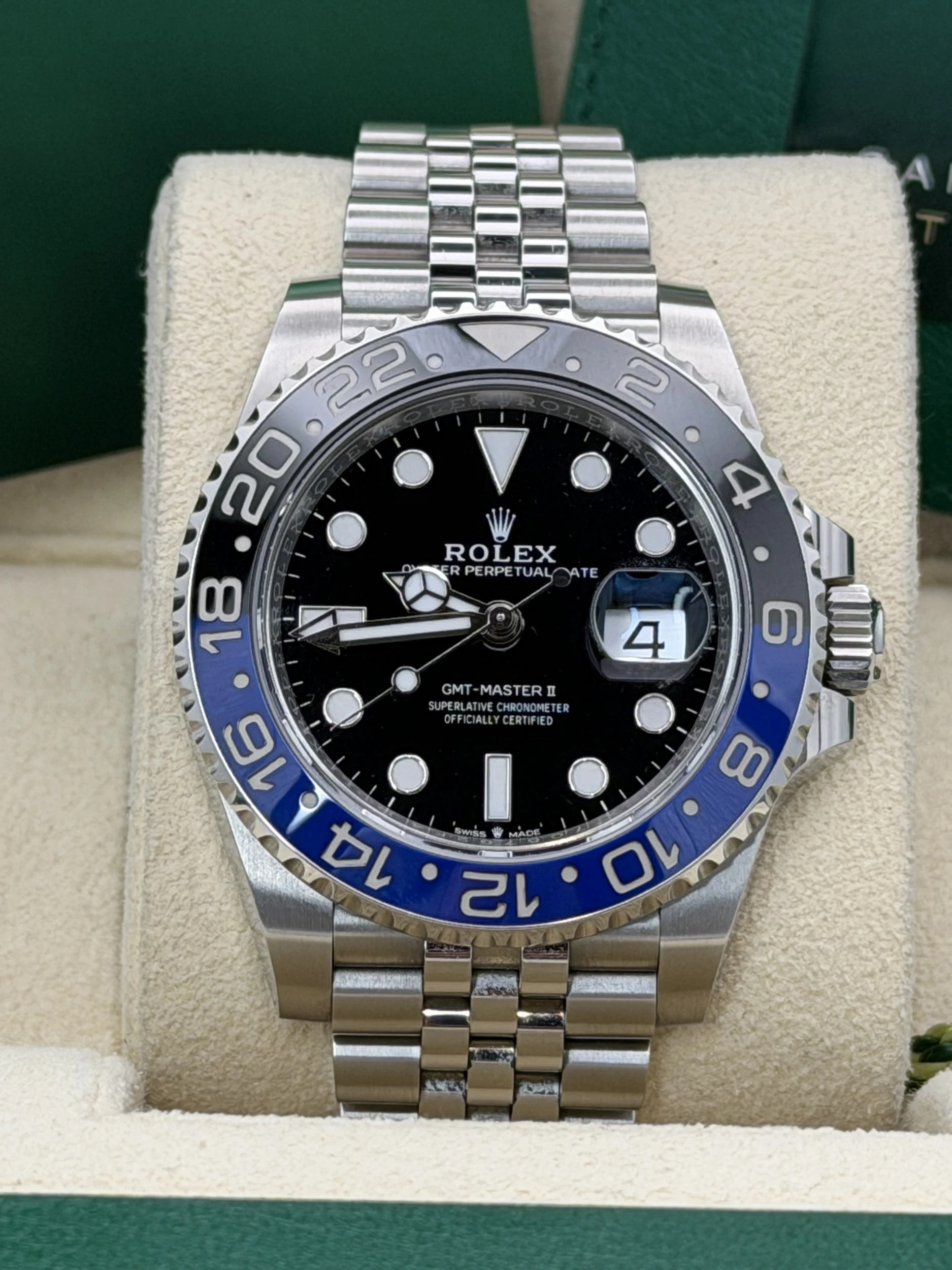 This Rolex GMT-Master II reference 126710BLNR features a 40mm stainless steel case, the iconic blue and black “Batman” Cerachrom ceramic bezel insert, and the highly refined stainless steel Jubilee bracelet. Powered by Rolex’s automatic calibre 3285 movement, this 2023 model offers exceptional accuracy, a 70-hour power reserve, and dual-time functionality—making it one of the most sought-after travel watches in the Rolex lineup.We offer a 12-month warranty on all watches with less than one year of remaining manufacturer or service warranty.