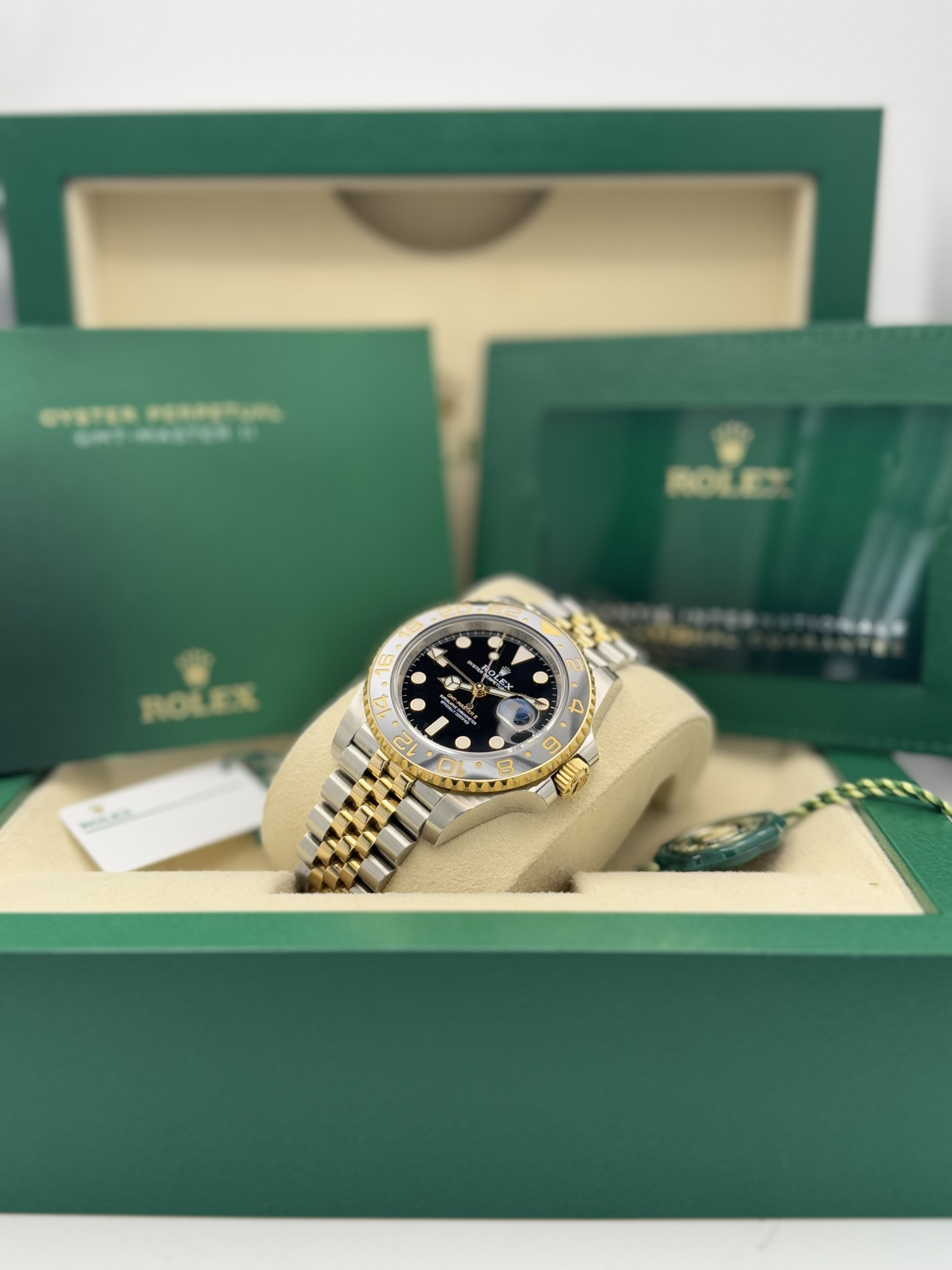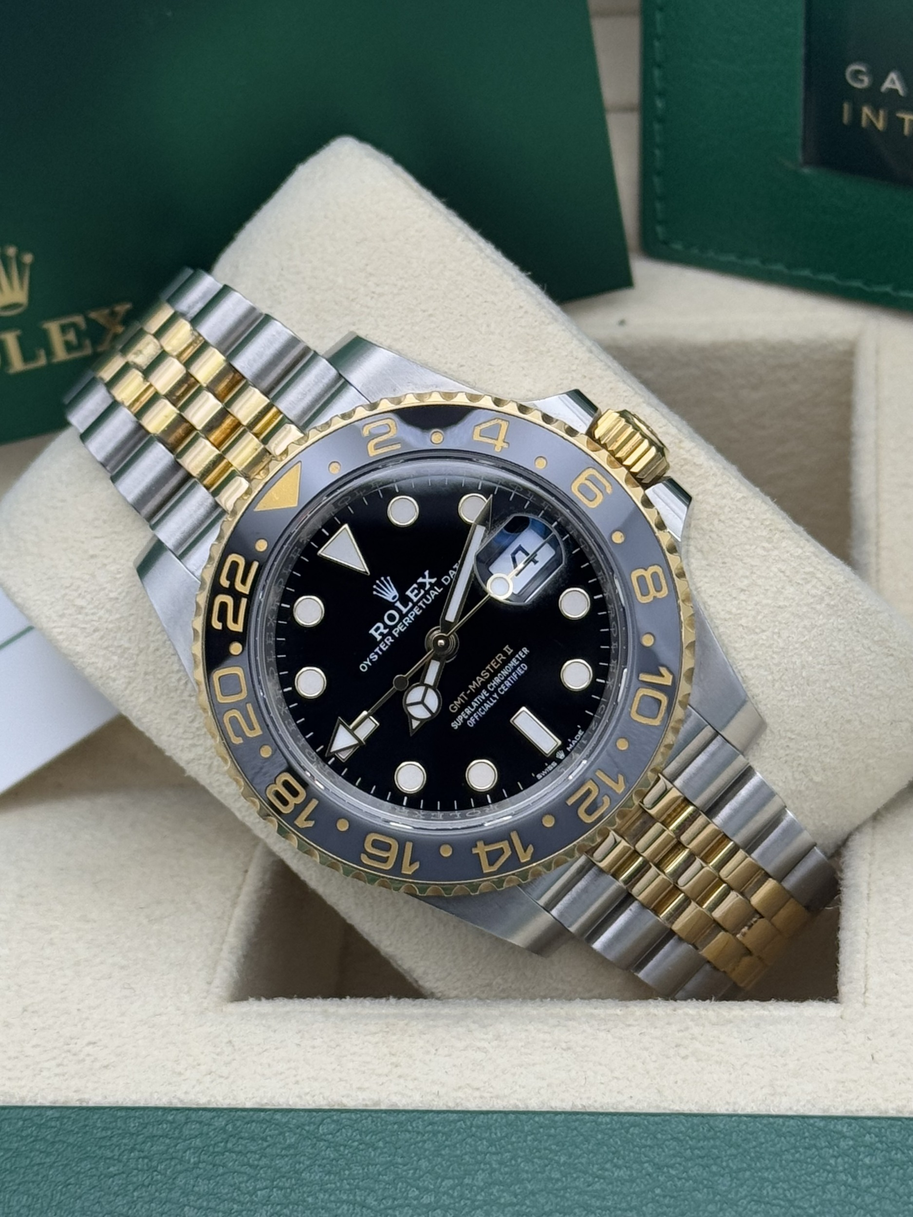 This Rolex GMT-Master II 40mm reference 126713GRNR features a stainless steel case, black dial, bi-colour grey and black Cerachrom bezel known as the “Zombie”, yellow gold and stainless steel jubilee bracelet, and automatic GMT movement, presented in excellent 2023 condition.