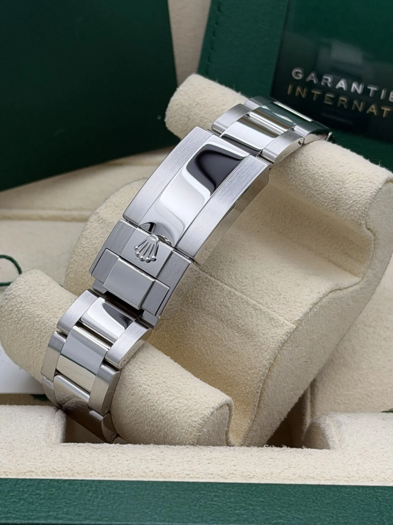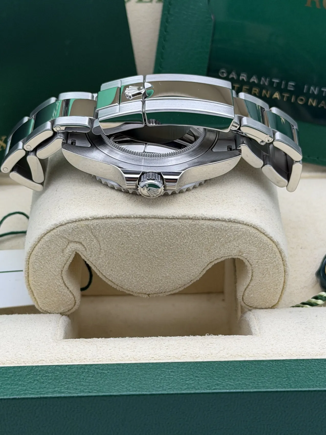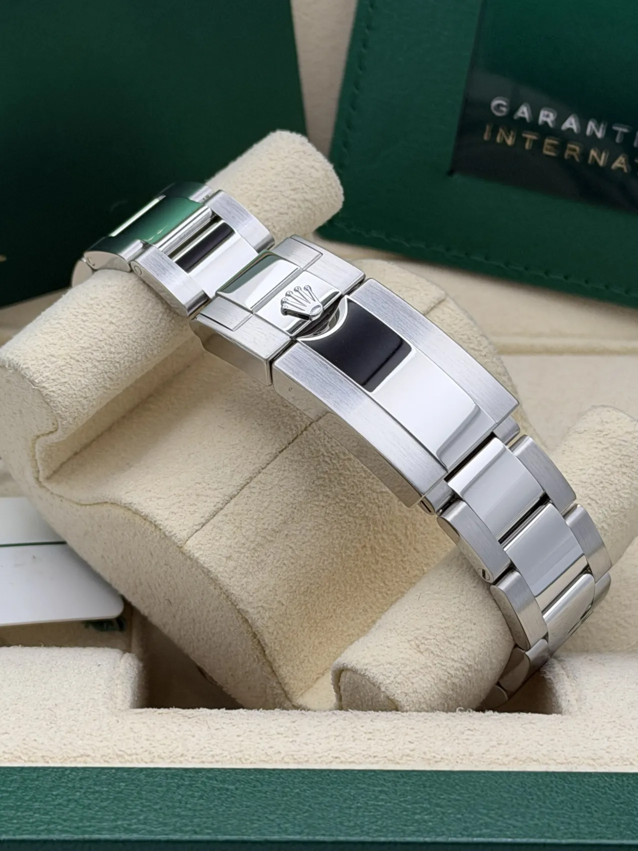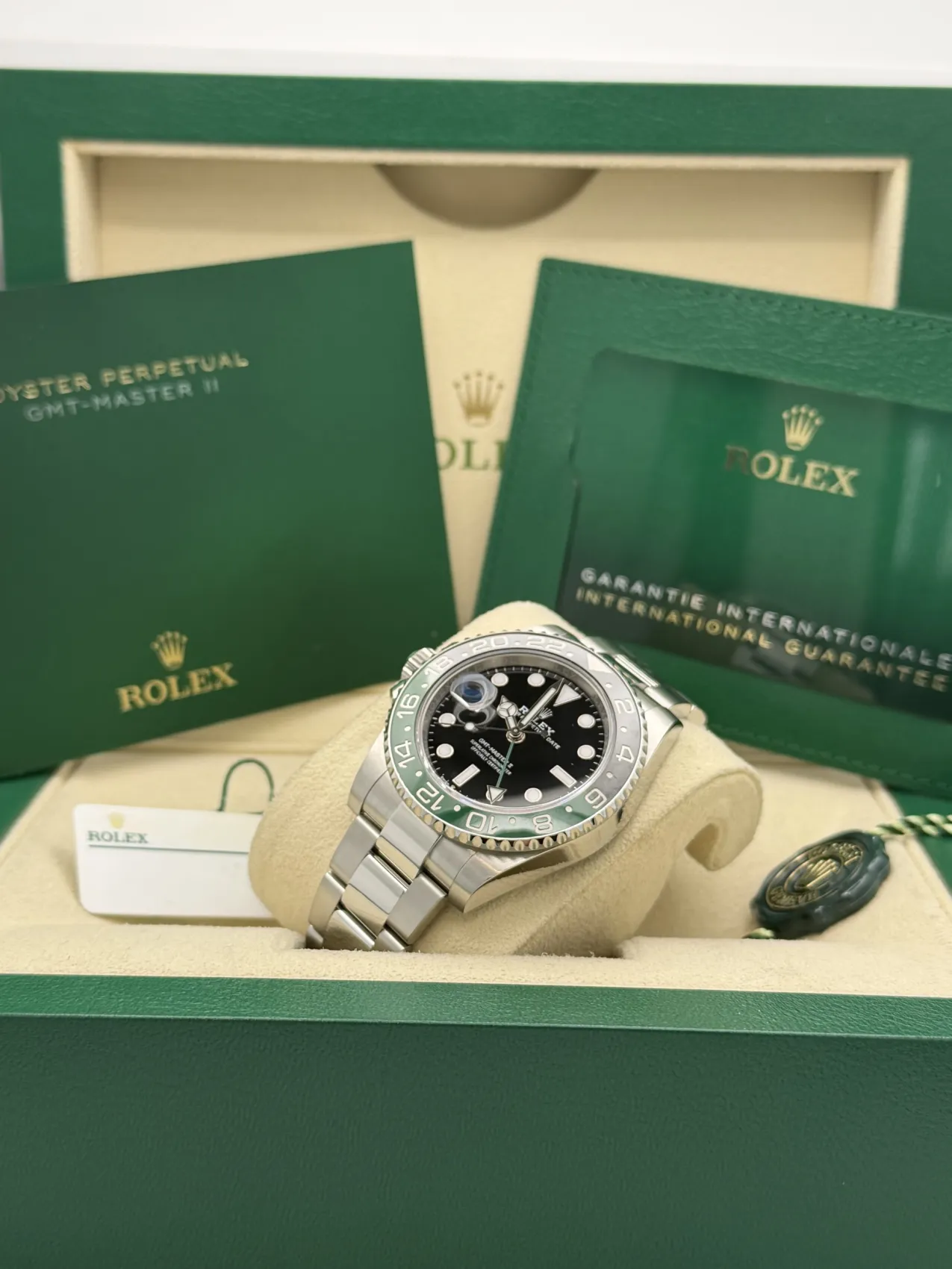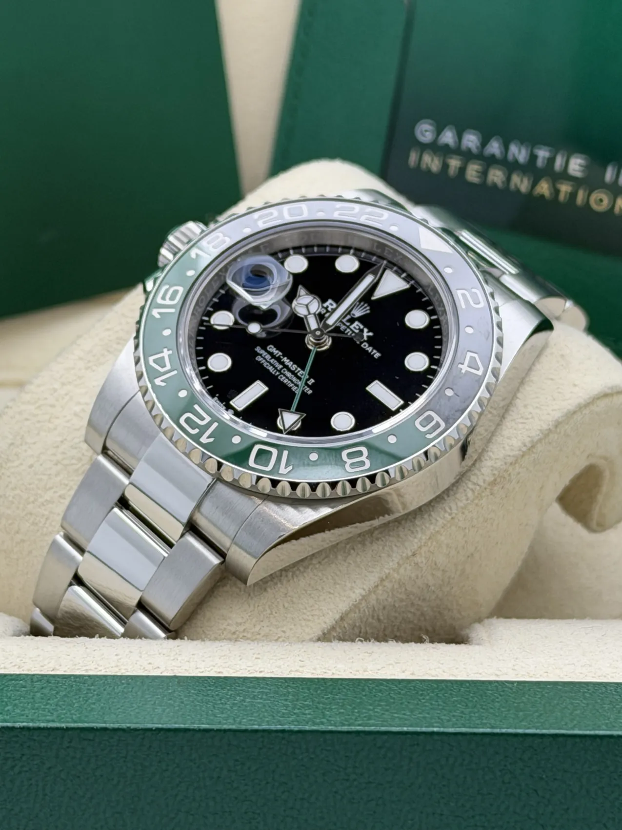 This Rolex GMT-Master II reference 126720VTNR, widely nicknamed the “Sprite,” features a stainless steel case with the distinctive black and green Cerachrom bezel insert. Unique within the GMT-Master II range, this model is configured for left-handed wear, with the crown and date window positioned on the left side of the case.The black dial is complemented by Chromalight luminous hour markers and the signature green GMT hand, allowing the wearer to track a second time zone via the bidirectional 24-hour bezel. Fitted to the robust Oyster bracelet with Oysterlock safety clasp and Easylink extension, the watch offers both durability and everyday comfort.Powered by the Rolex calibre 3285 automatic movement, the 126720VTNR benefits from Chronergy escapement technology and approximately 70 hours of power reserve, ensuring outstanding precision and reliability.Presented in excellent 2023 condition, the “Sprite” GMT-Master II has quickly become one of the most talked-about modern Rolex sports models, combining distinctive design with exceptional functionality.