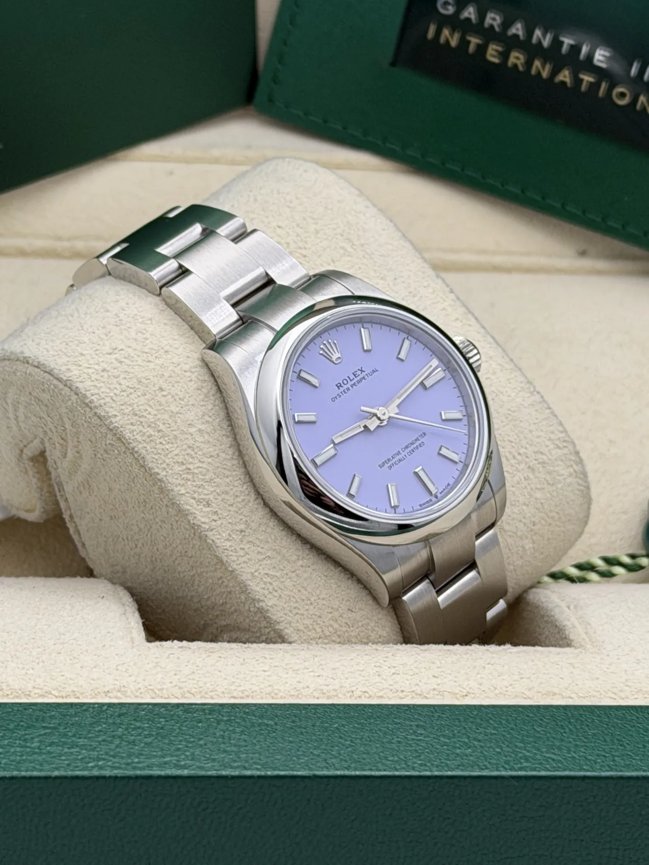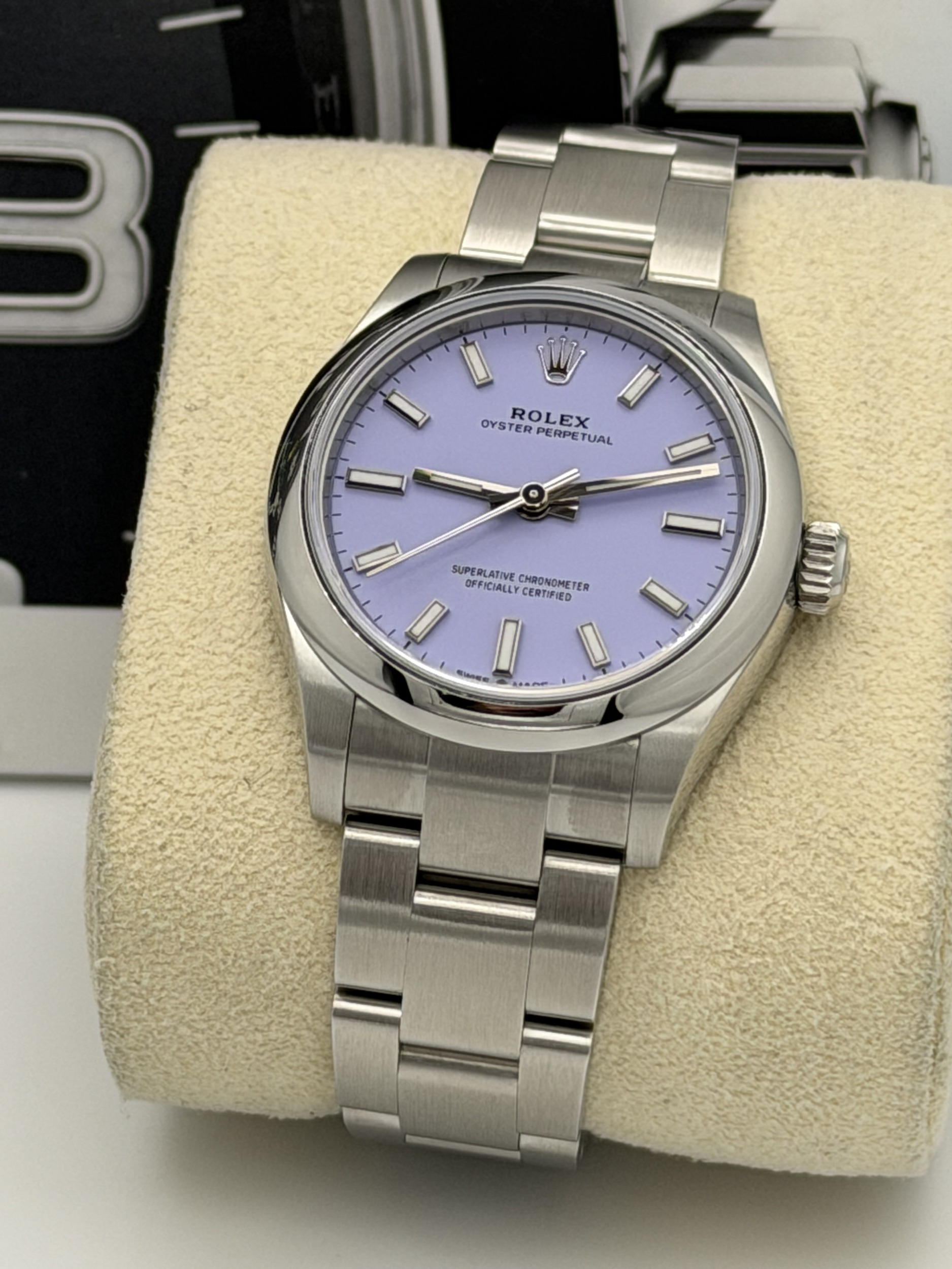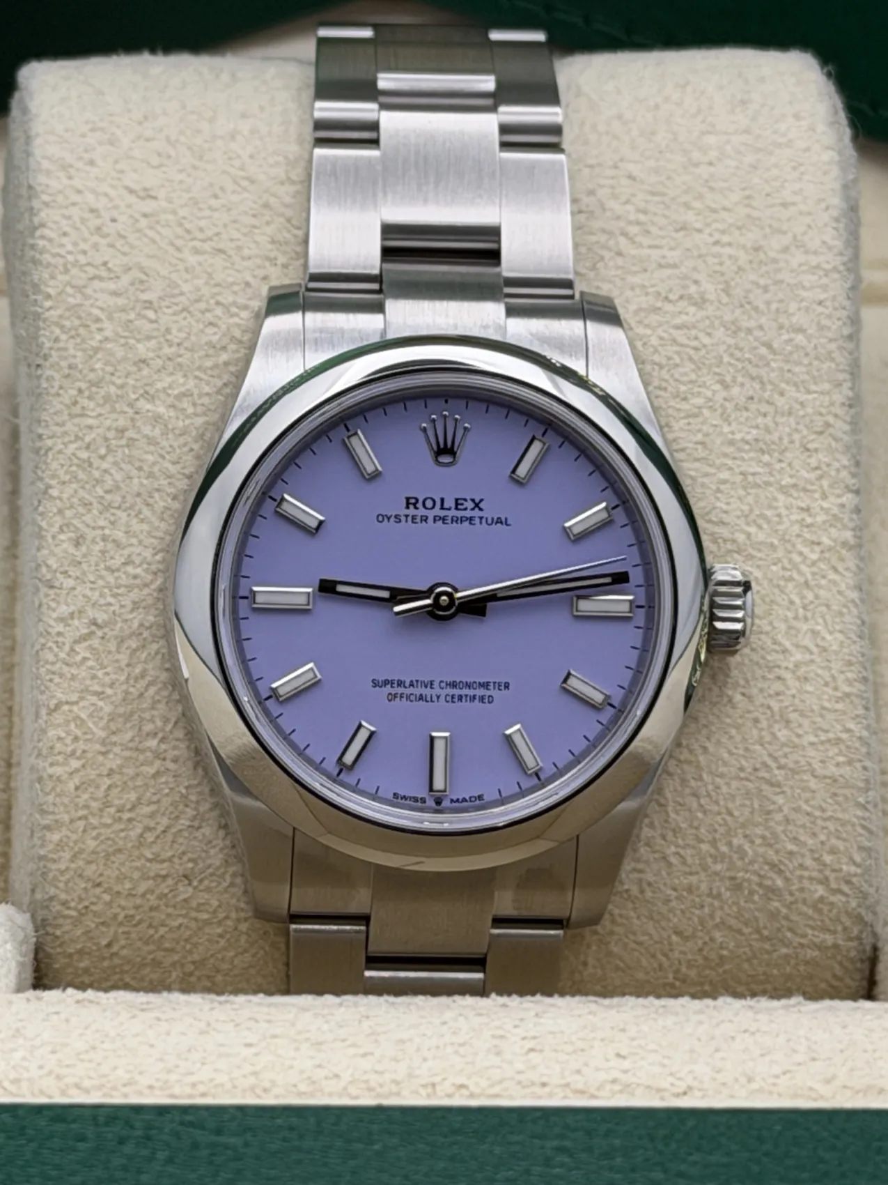 This Rolex Oyster Perpetual 31mm features a stainless steel Oystersteel case, striking lavender dial with baton hour markers, smooth polished bezel, and Oyster bracelet. Powered by the Rolex Calibre 2232 automatic movement, it offers exceptional precision and reliability within a refined and versatile case size. Offered here in unworn 2026 condition, this vibrant lavender dial configuration is one of the most sought-after modern Oyster Perpetual variations.