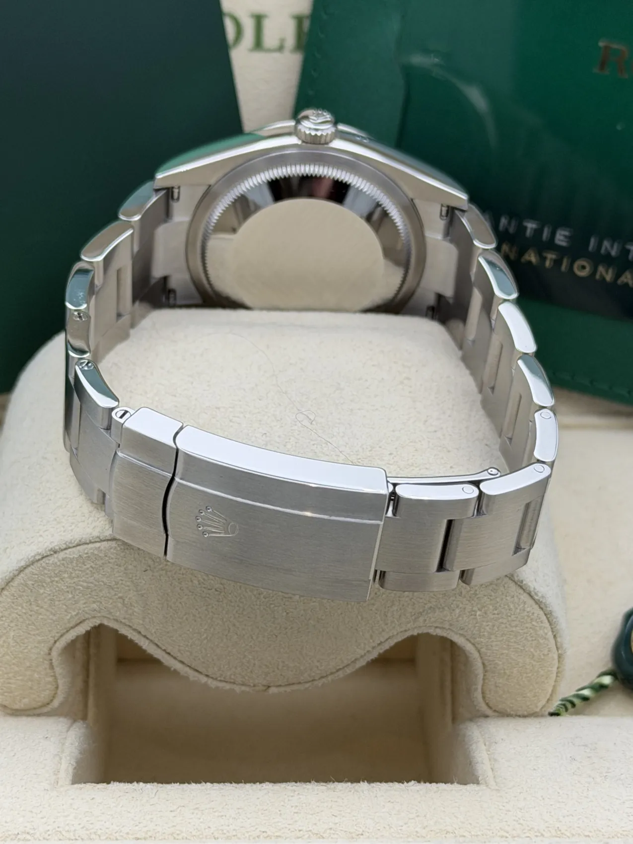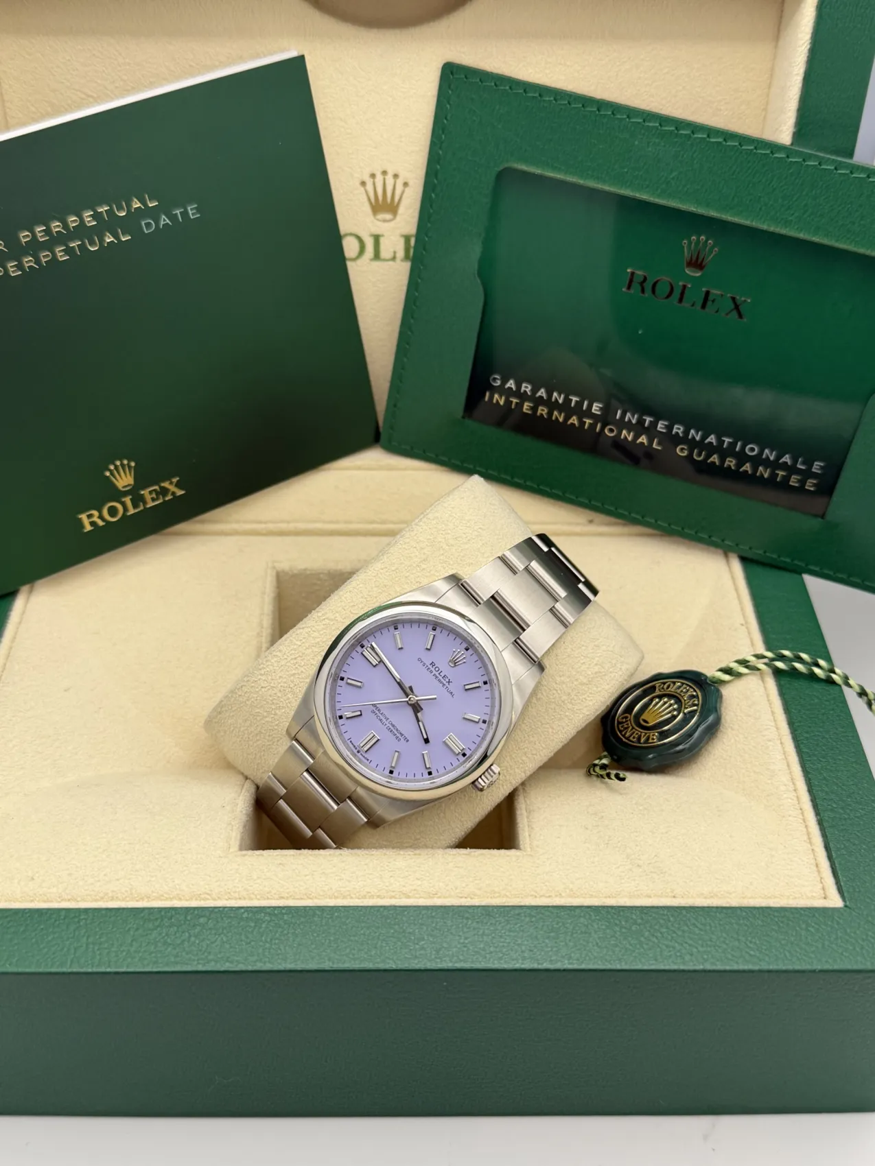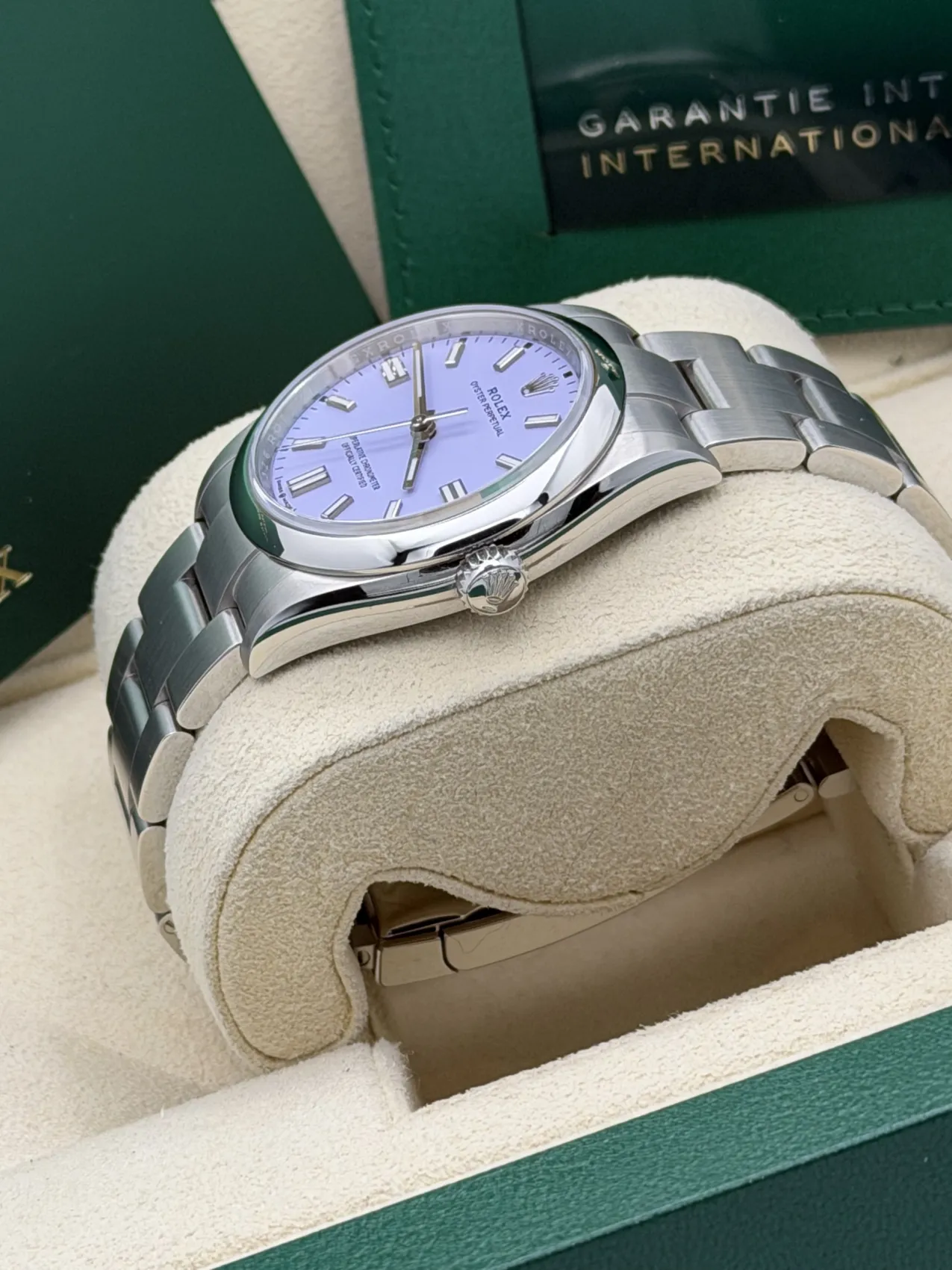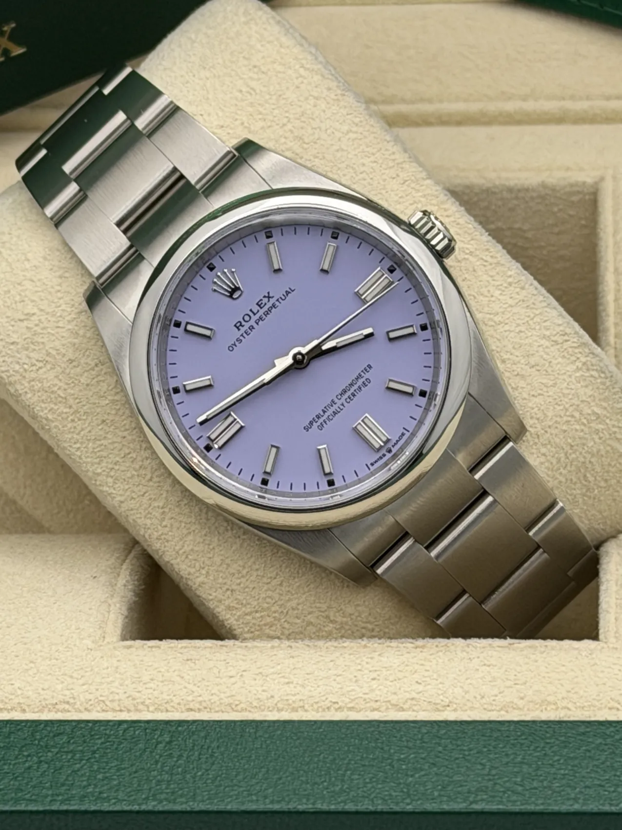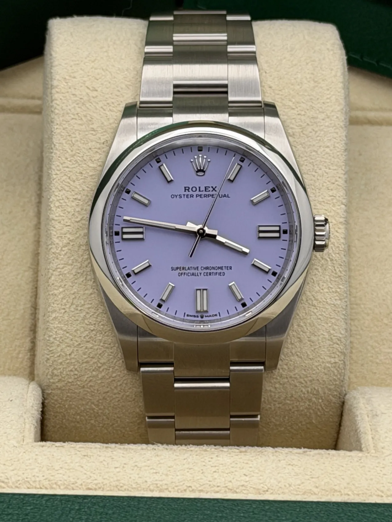 This Rolex Oyster Perpetual 36mm reference 126000 features a stainless steel Oystersteel case, striking lavender dial with baton hour markers, smooth polished bezel, Oyster bracelet, and the Rolex Calibre 3230 automatic movement. Offered here in unworn 2025 condition, this vibrant and highly sought-after dial configuration combines contemporary colour with Rolex’s timeless design and everyday versatility.