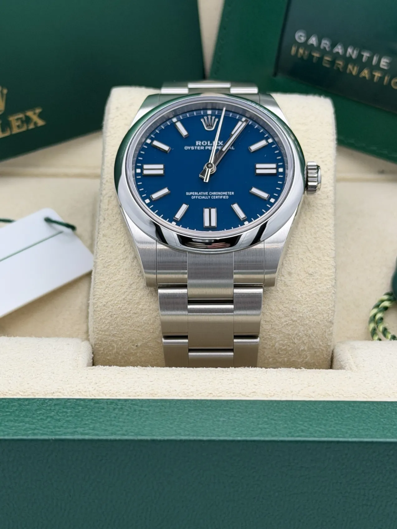 This Rolex Oyster Perpetual 41mm reference 134300 features an Oystersteel stainless steel case, vibrant med blue dial, smooth bezel, Oyster bracelet, and the Rolex Calibre 3230 automatic movement, offered in unworn 2025 condition.