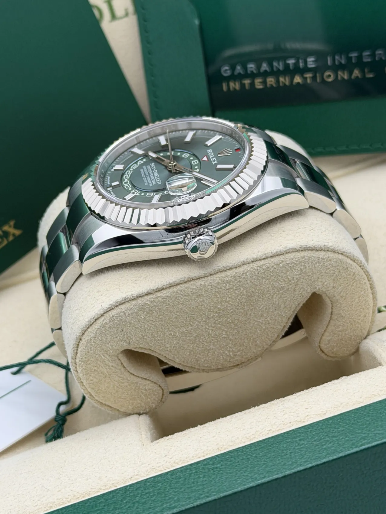 This Rolex Sky-Dweller 336934 features a 42mm stainless steel case paired with a white gold fluted bezel, the highly desirable mint green dial, and the robust stainless steel Oyster bracelet. Powered by Rolex’s automatic calibre 9002 movement, this unworn 2025 model offers exceptional precision, a 72-hour power reserve, and Rolex’s sophisticated annual calendar and dual-time functionality, making it one of the most advanced and sought-after modern Rolex watches.