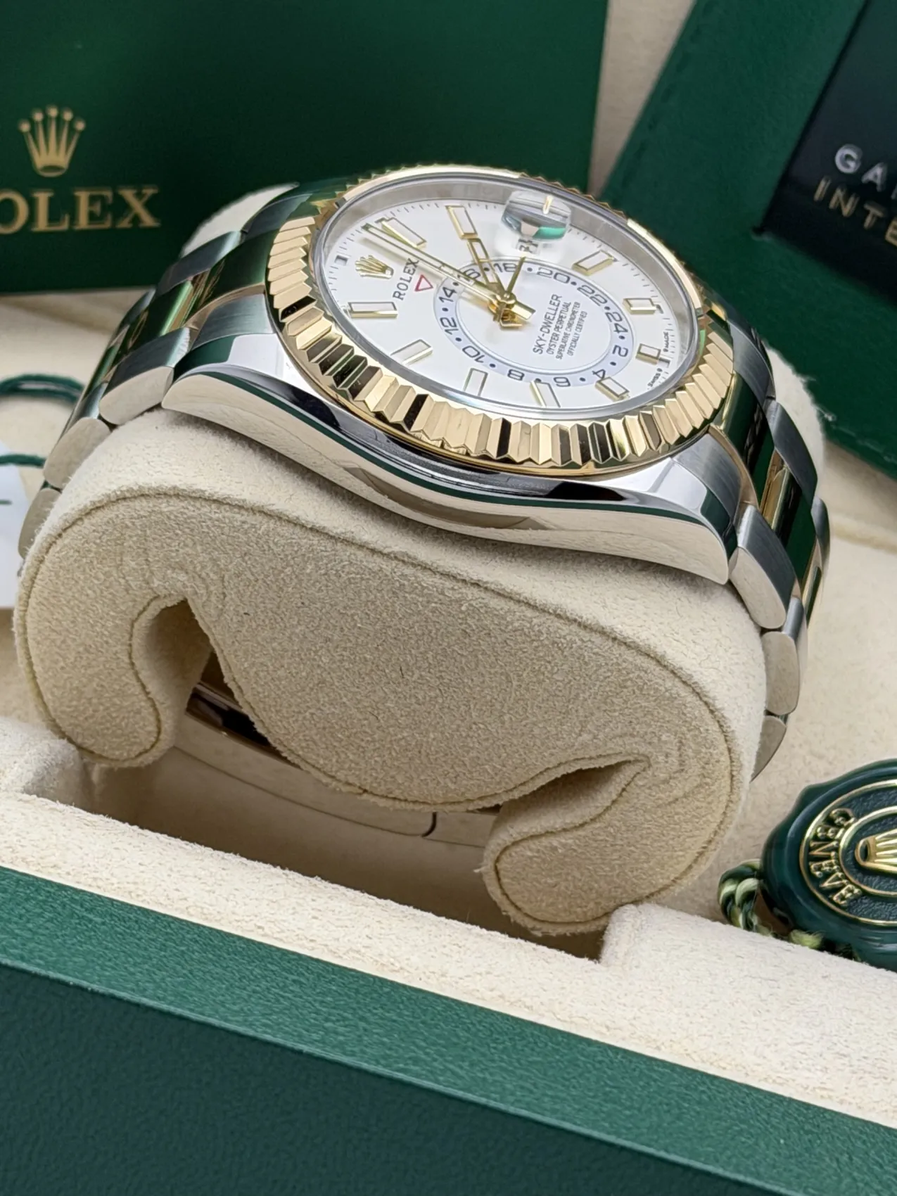 This Rolex Sky-Dweller features a 42mm stainless steel and 18ct yellow gold case, white dial with dual time and annual calendar display, fluted yellow gold bezel, Oyster bracelet, and the Calibre 9001 automatic movement, presented in excellent condition.
