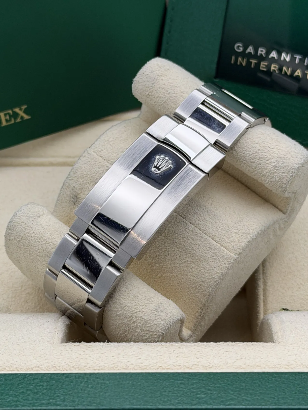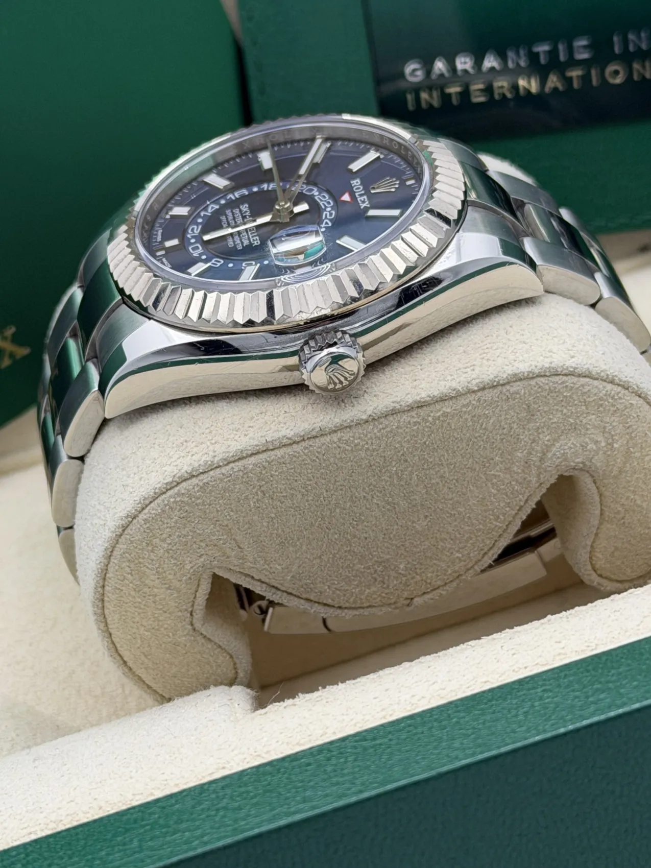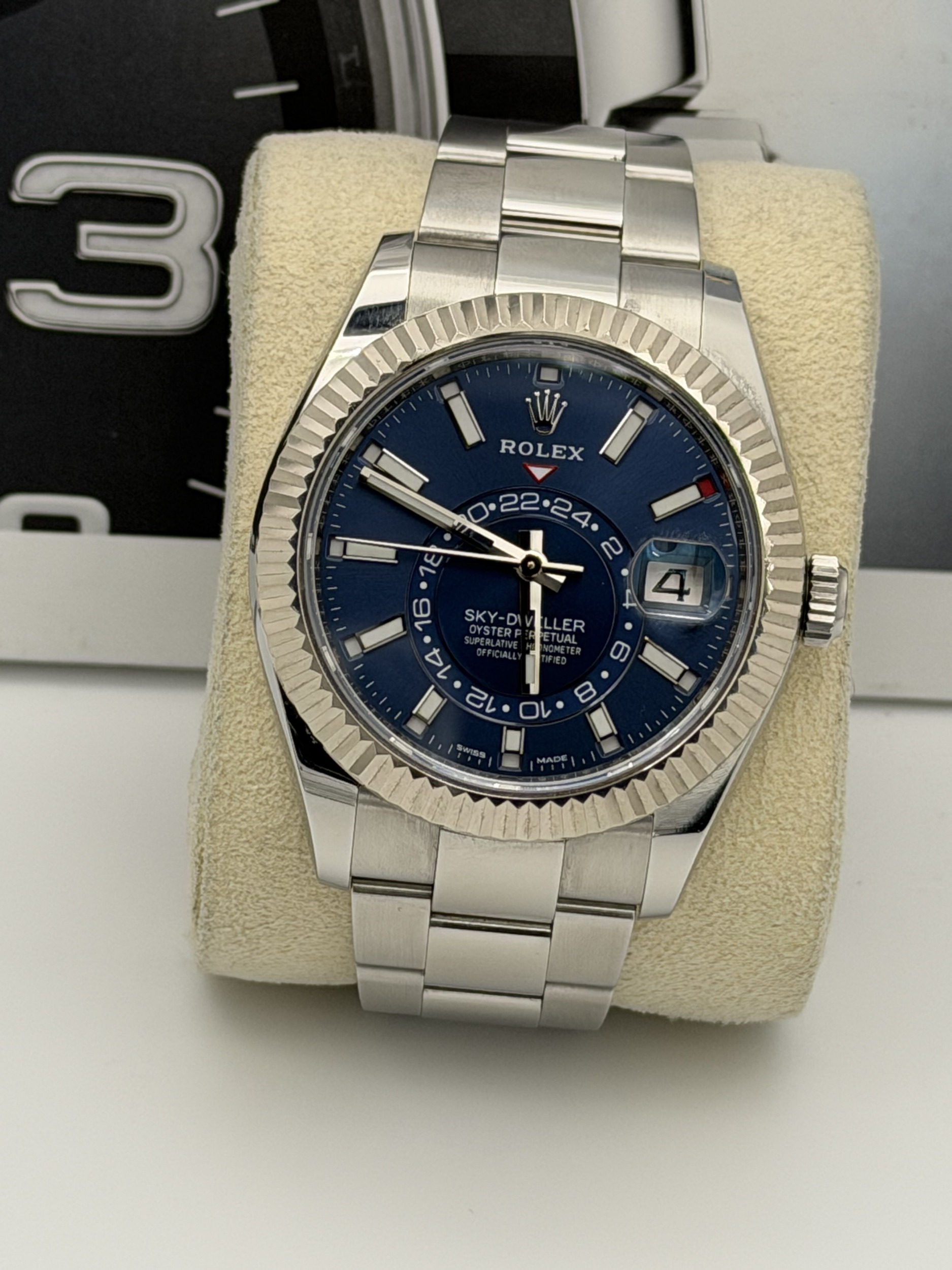This Rolex Sky-Dweller 42mm reference 326934 features a stainless steel case complemented by an 18ct white gold fluted bezel, paired with the highly sought-after sunburst blue dial. Fitted to the robust Oyster bracelet with Oysterclasp and Easylink extension, this configuration perfectly balances sport, prestige, and everyday wearability.The Sky-Dweller is Rolex’s most technically advanced classic model, offering an annual calendar and dual time zone display. The innovative Ring Command bezel allows intuitive setting of functions, while the off-centre 24-hour disc enables clear tracking of a second time zone. Powered by the Rolex calibre 9001 automatic movement, it delivers exceptional precision and reliability with approximately 72 hours of power reserve.Presented in excellent 2020 condition, this blue dial example remains one of the most desirable modern Sky-Dweller references, combining complication, presence, and iconic Rolex design.