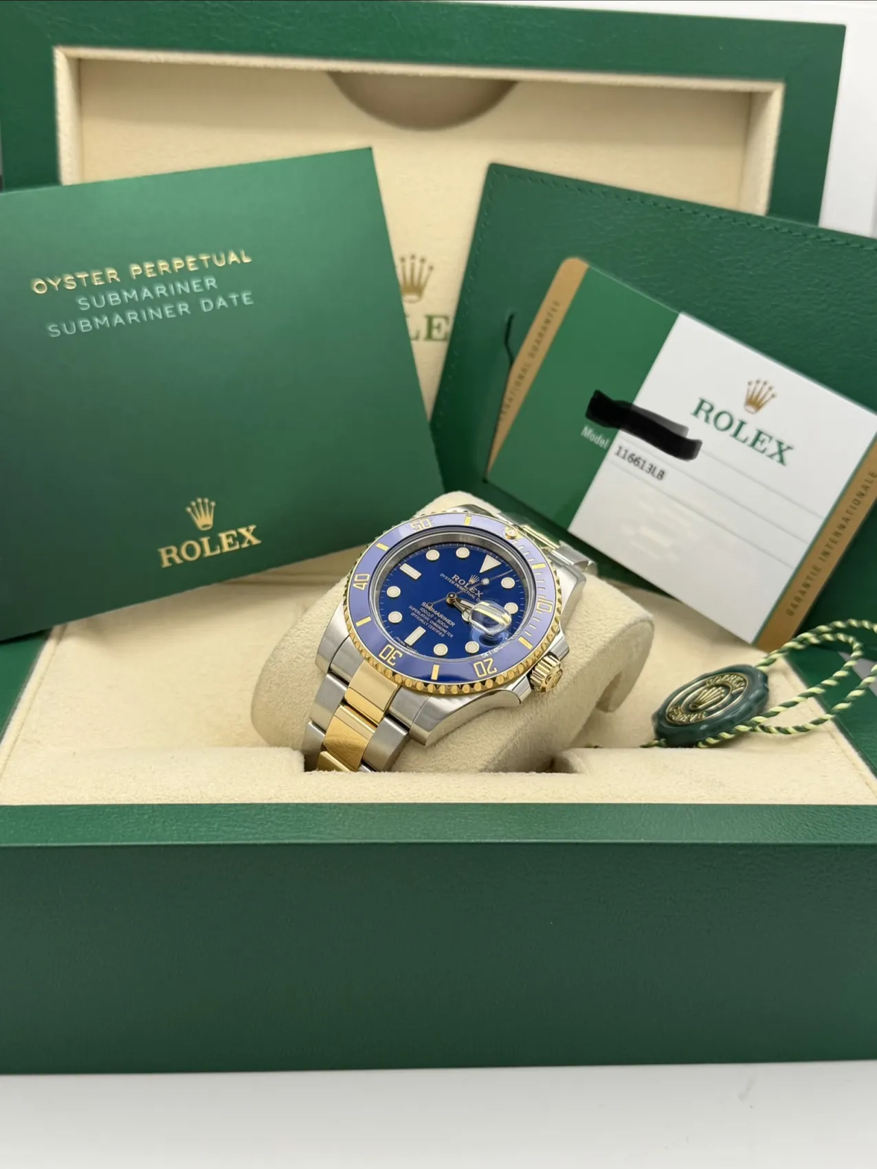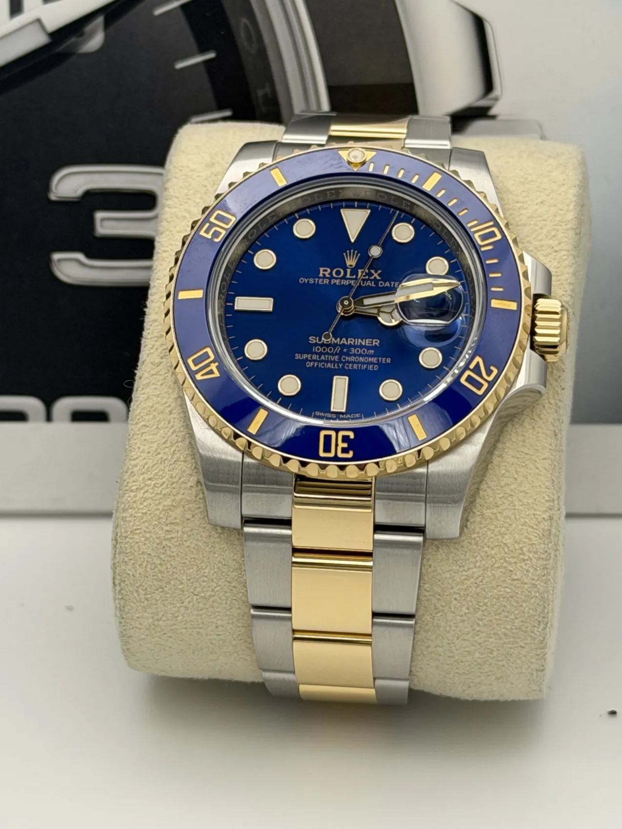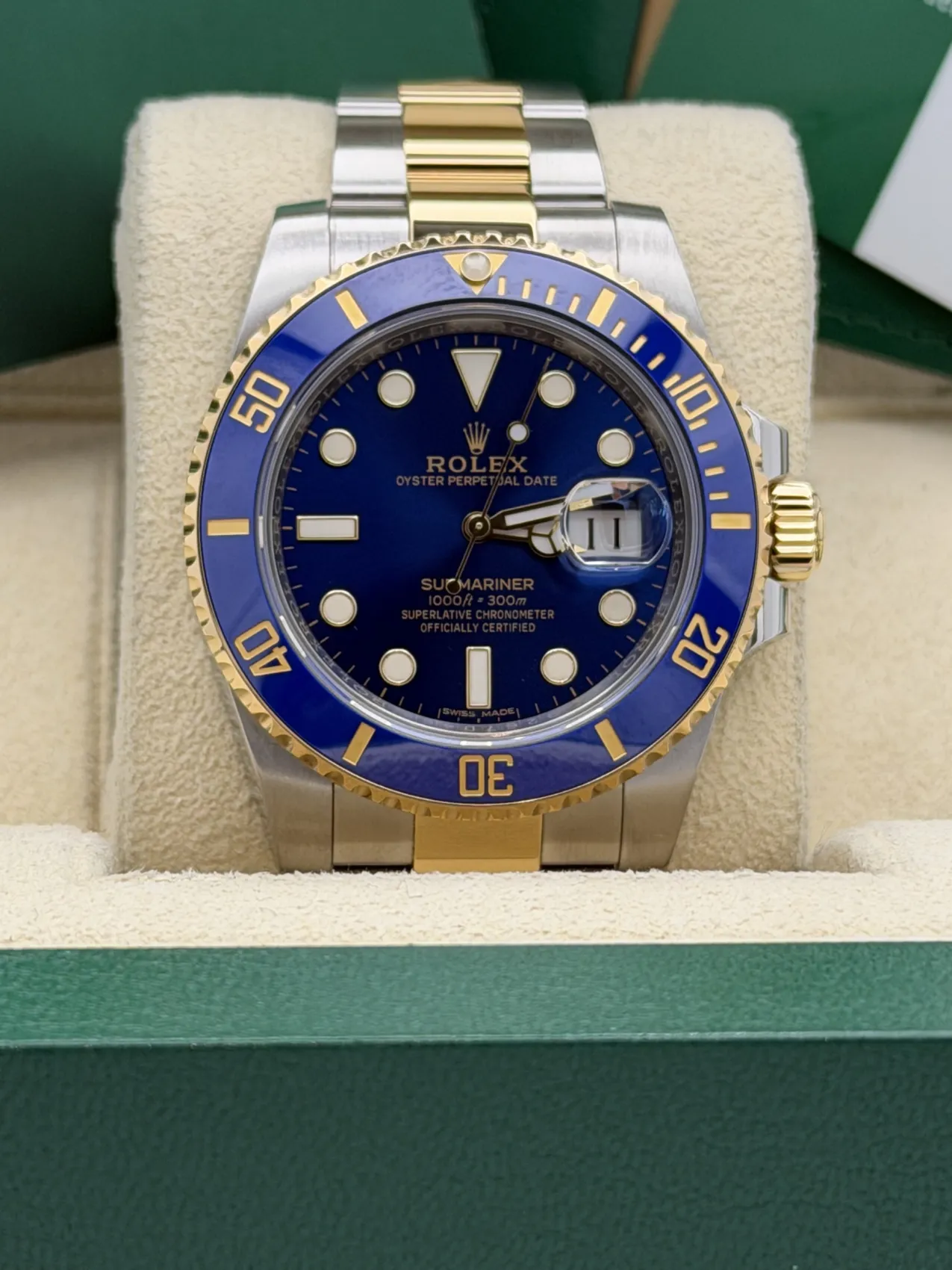 This Rolex Submariner Date features a stainless steel and yellow gold (Rolesor) case with a blue ceramic bezel, a matching blue dial, and the iconic Oyster bracelet, powered by Rolex’s automatic movement, offered in excellent condition.