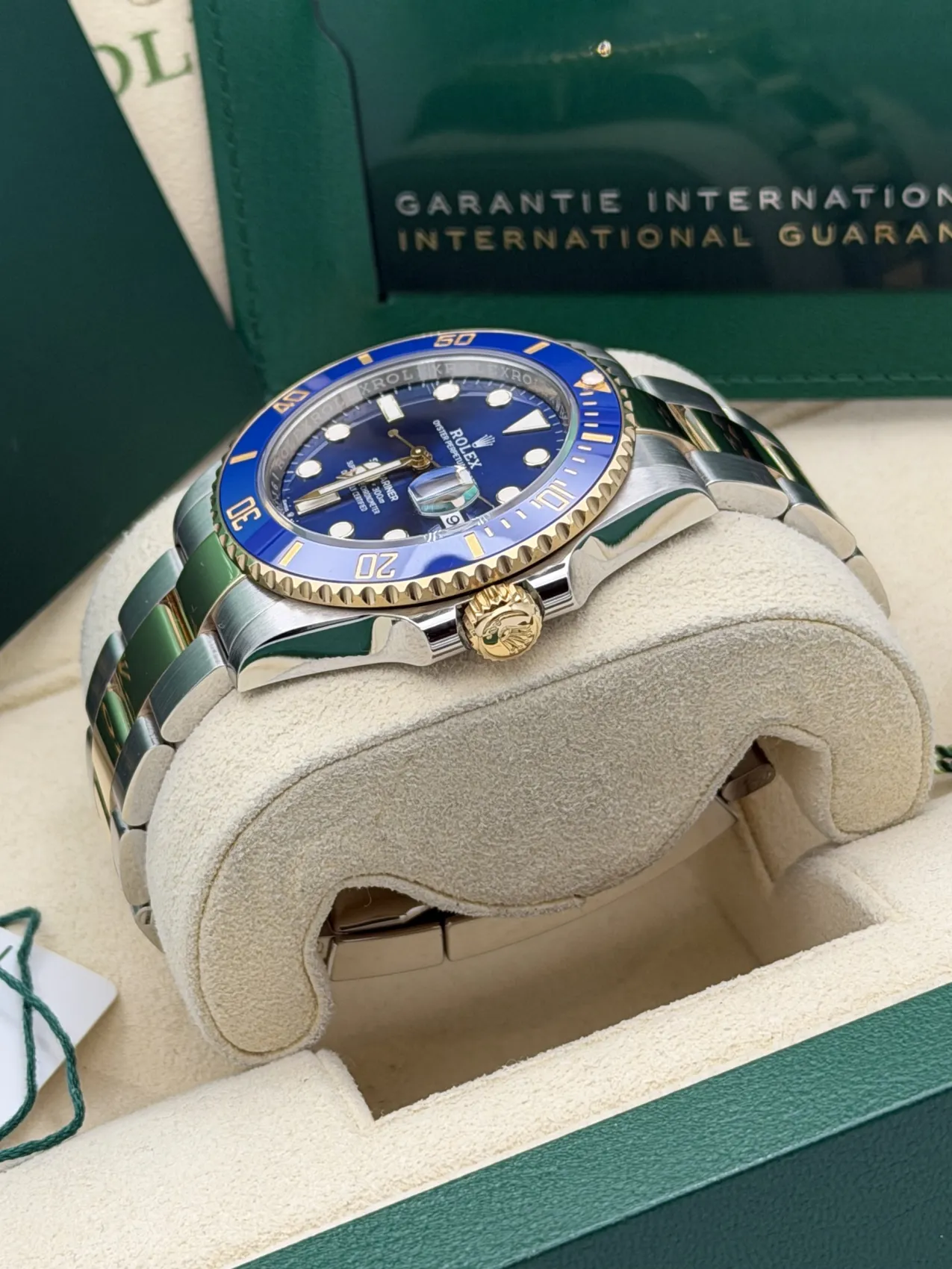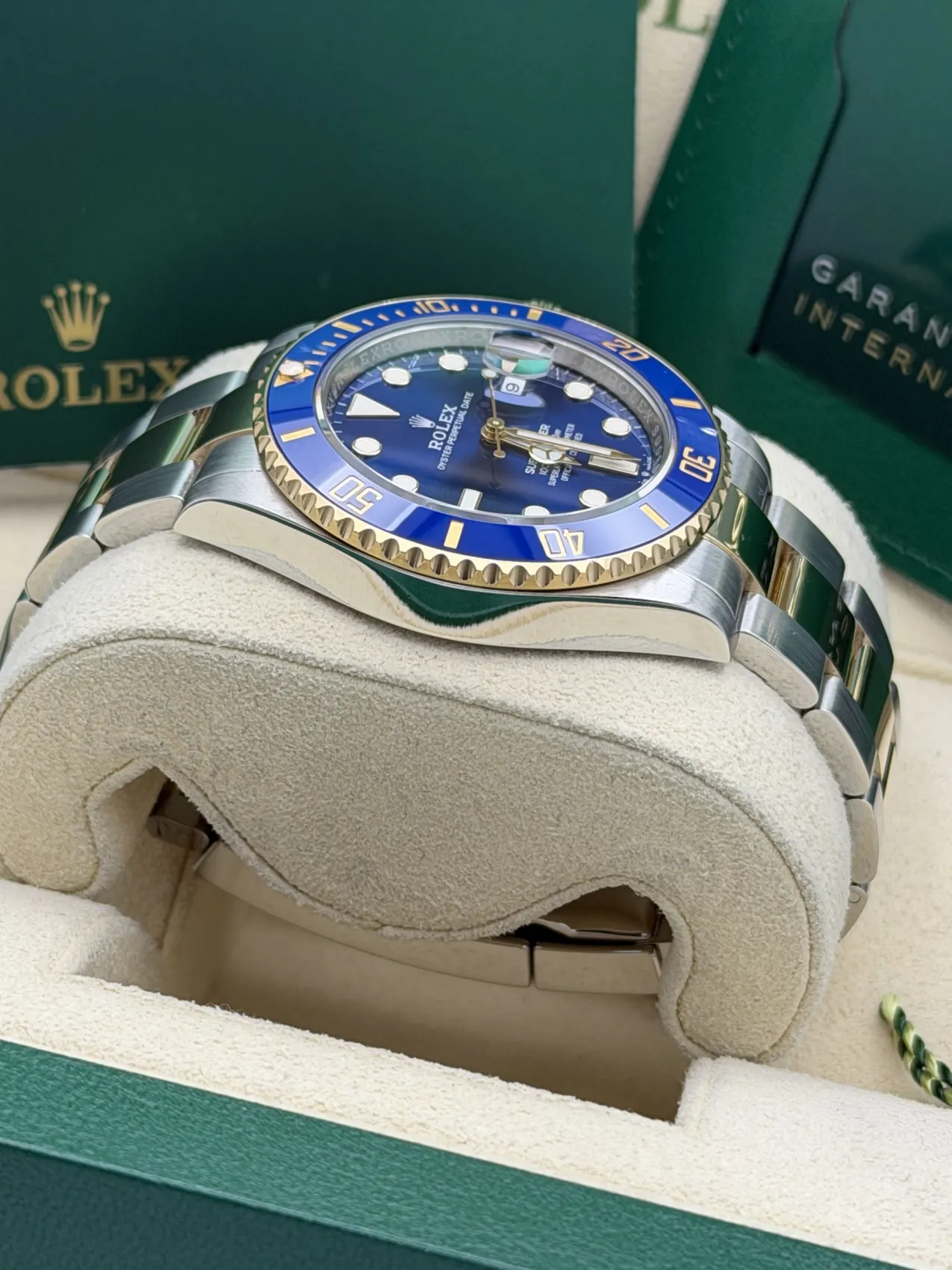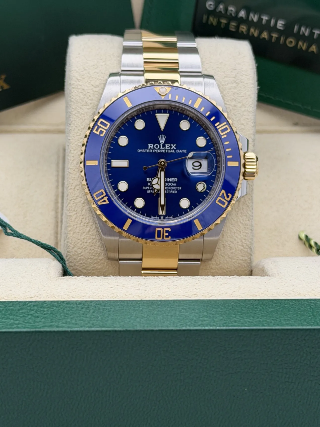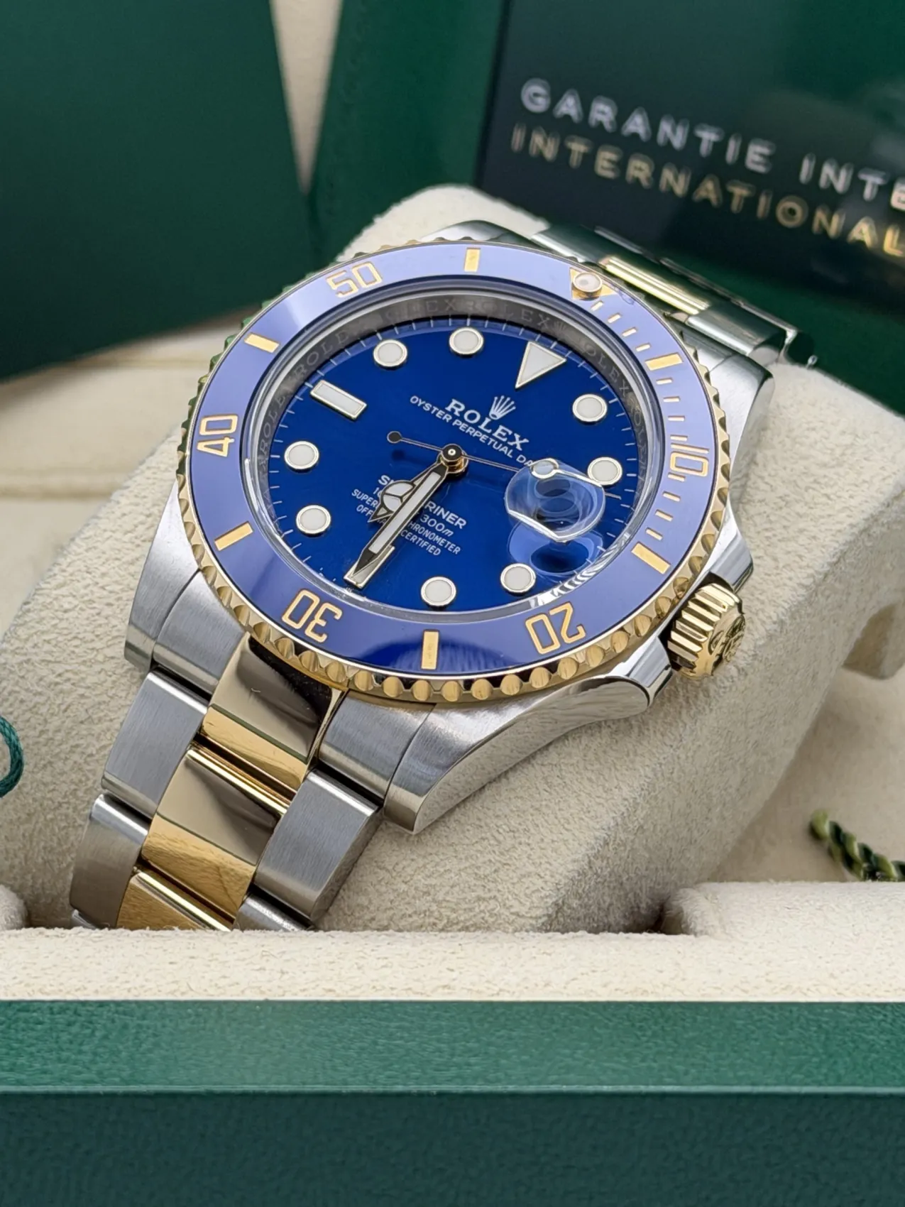 This Rolex Submariner Date 41mm reference 126613LB features a stainless steel case, vibrant blue dial, blue Cerachrom ceramic bezel known as the “Bluesy”, Oyster bracelet, and the Rolex Calibre 3235 automatic movement, presented in excellent 2022 condition.