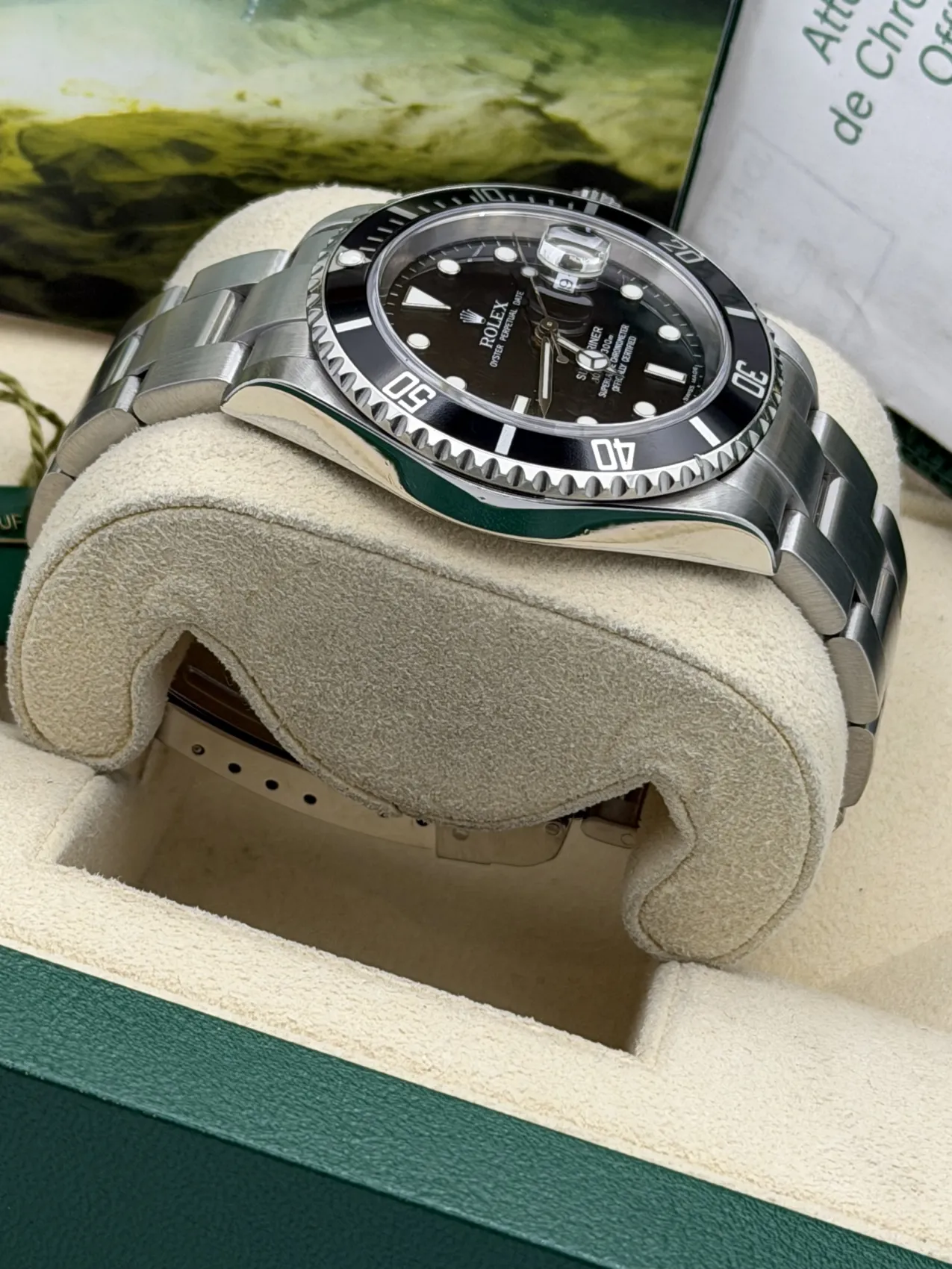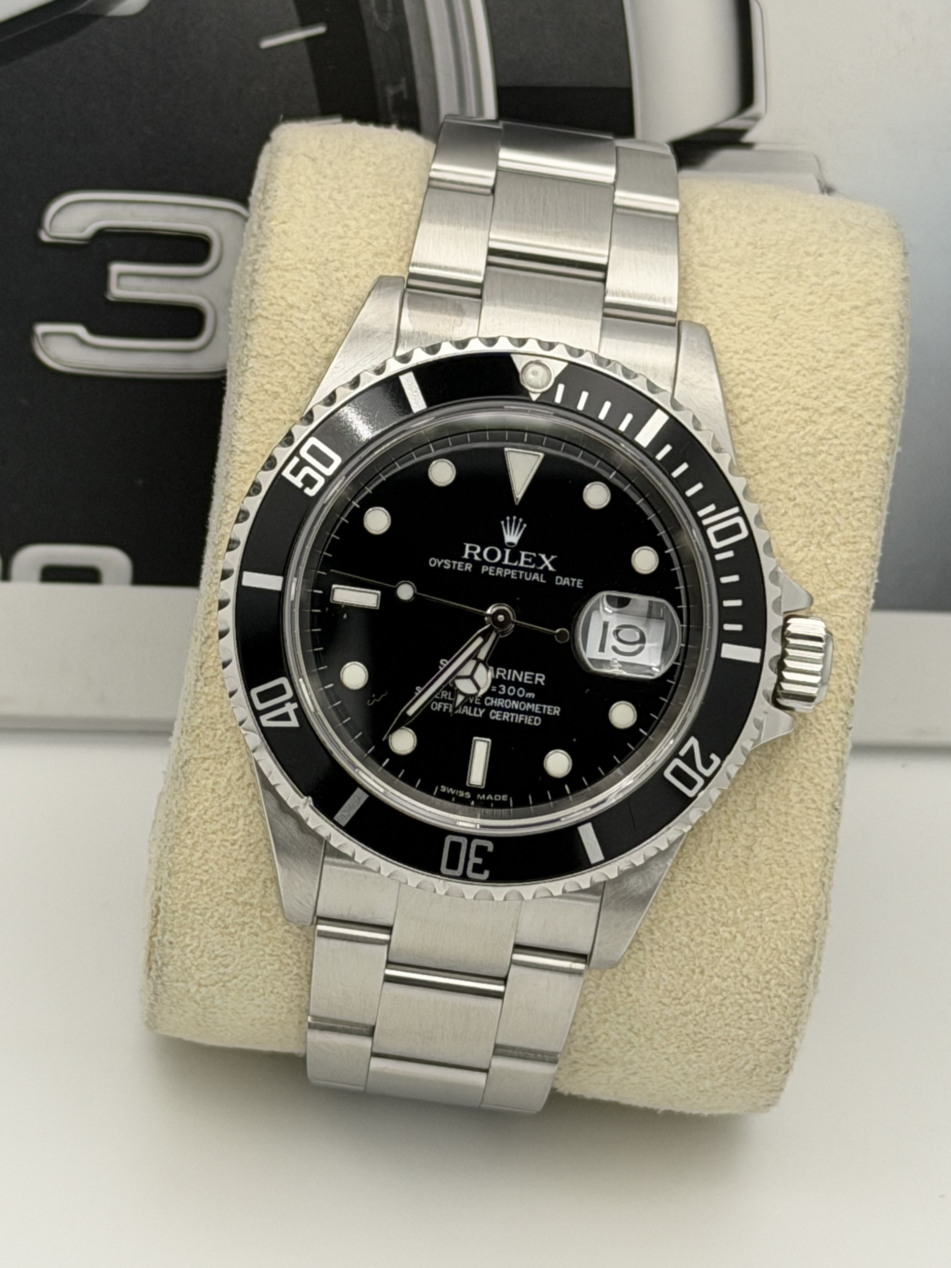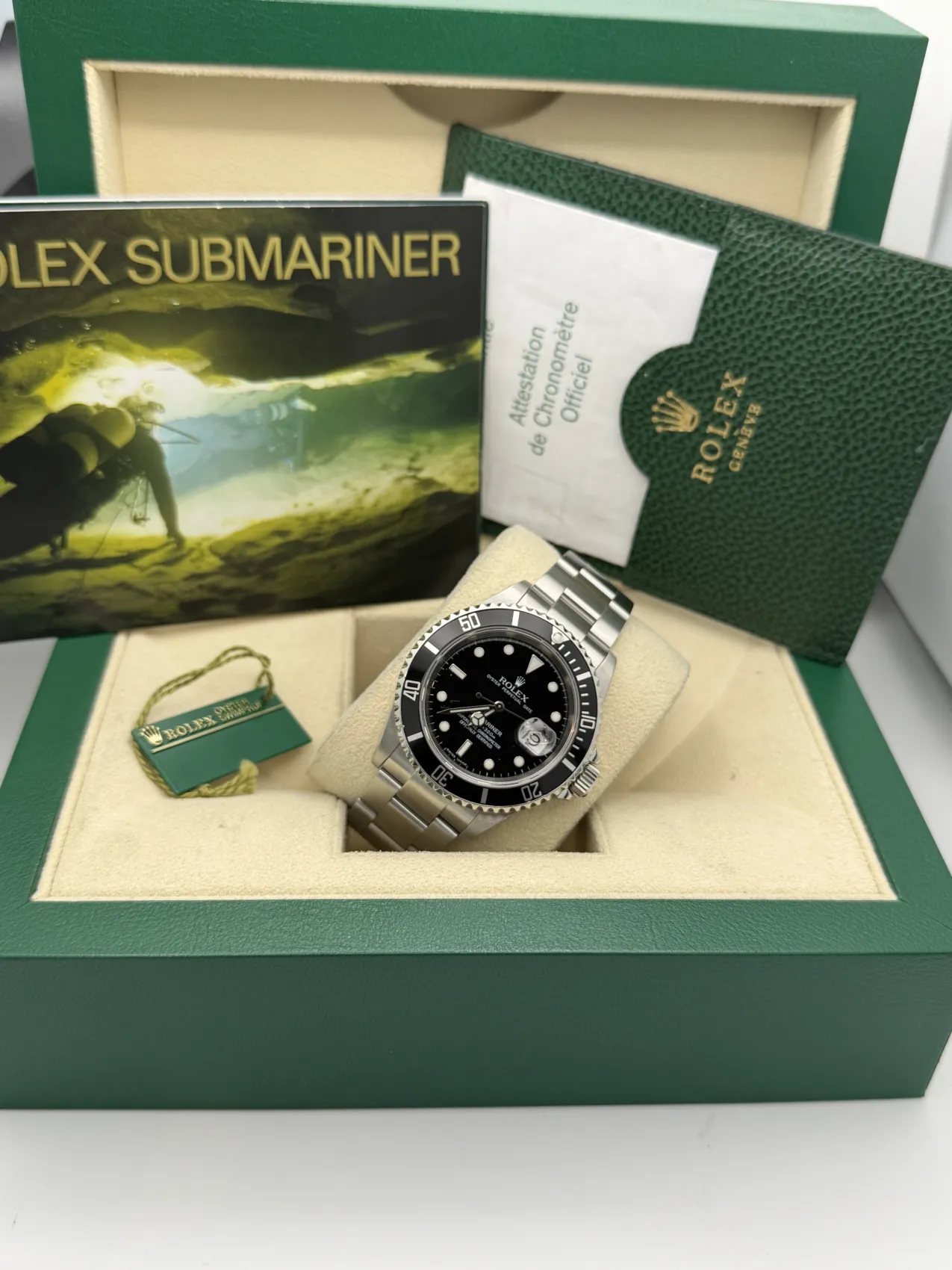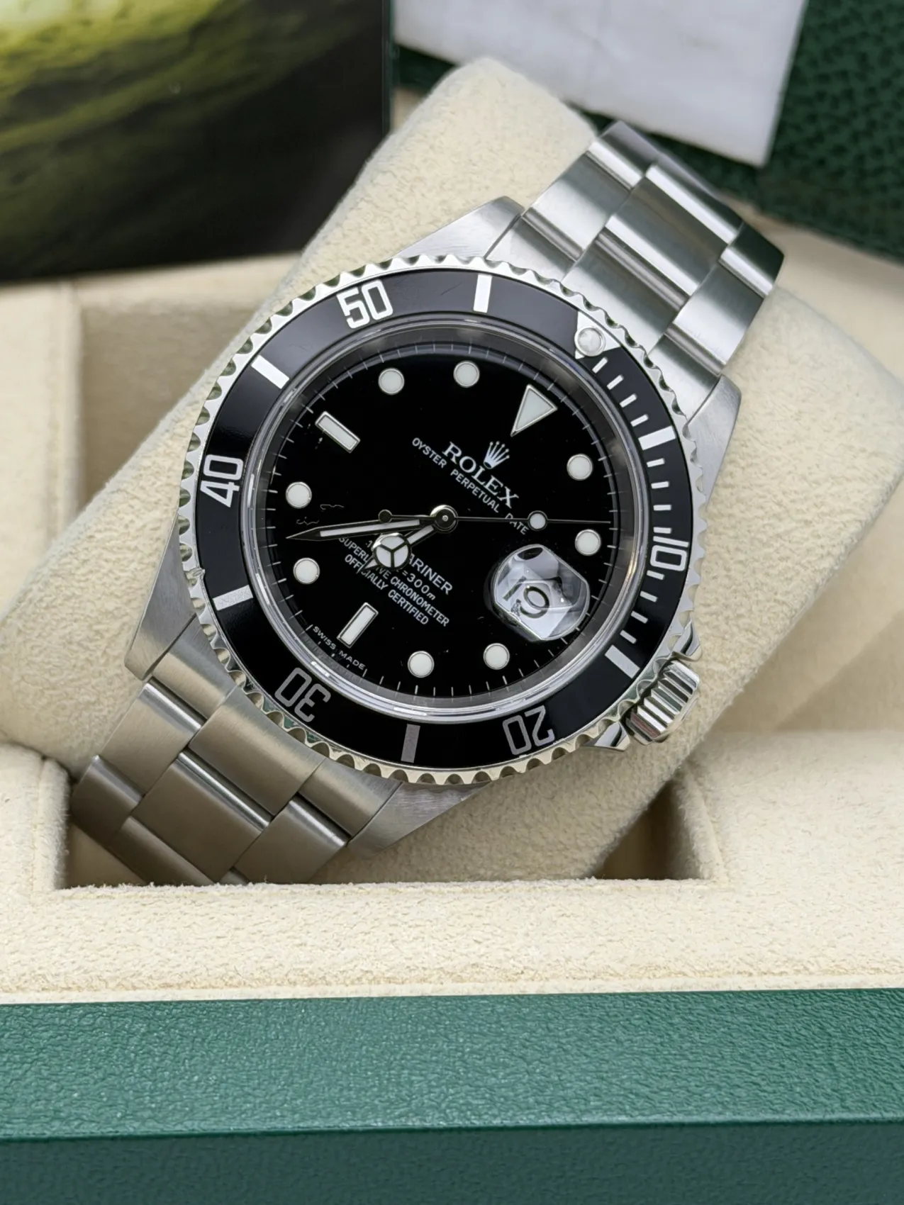 This Rolex Submariner Date 40mm reference 16610 features an Oystersteel stainless steel case, black dial, black aluminium bezel insert, Oyster bracelet, and automatic movement, presented in excellent 2006 condition.