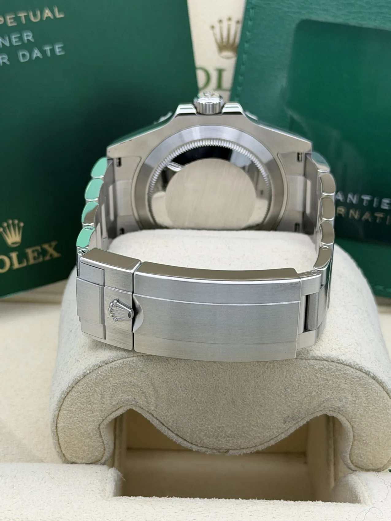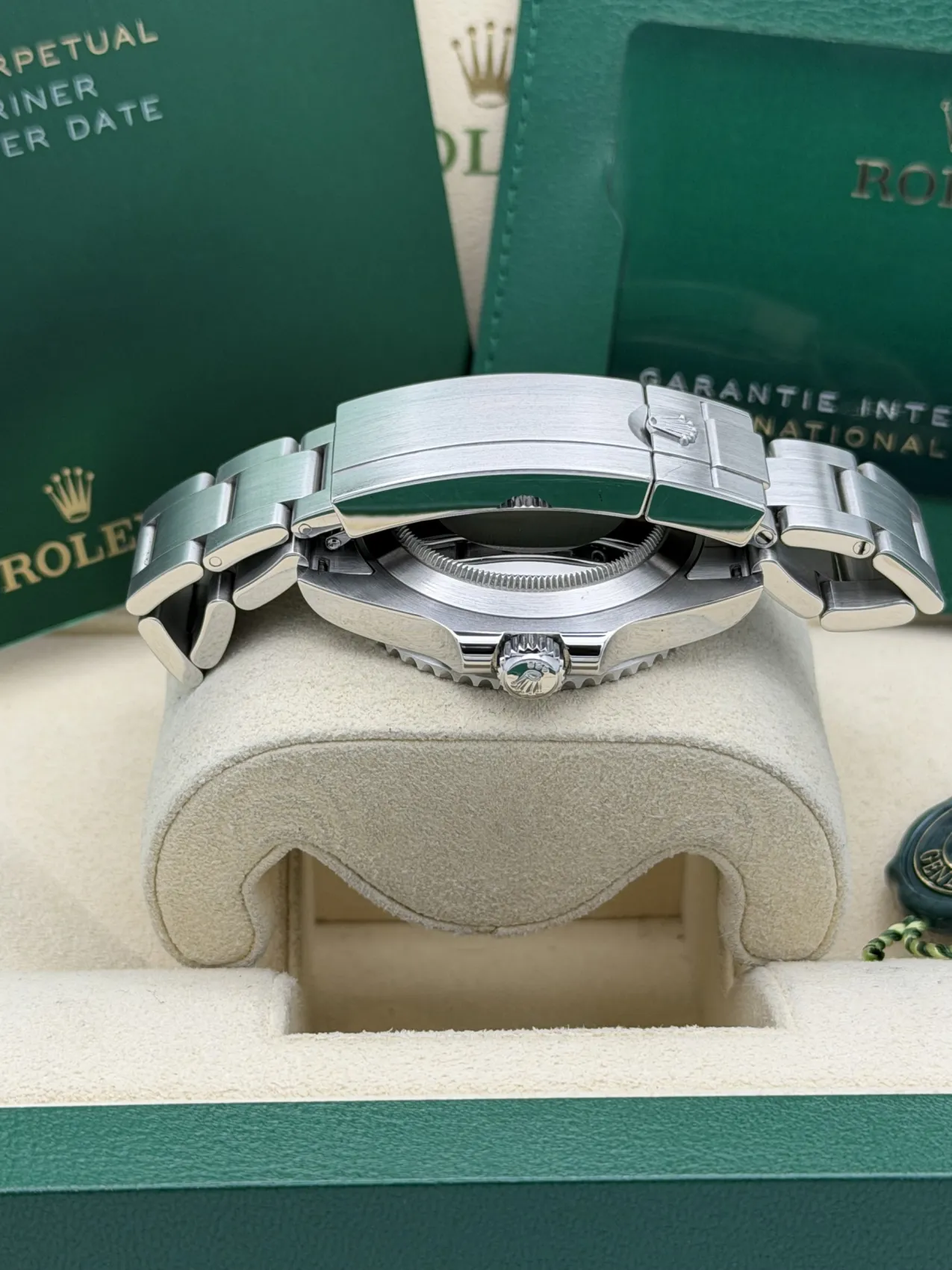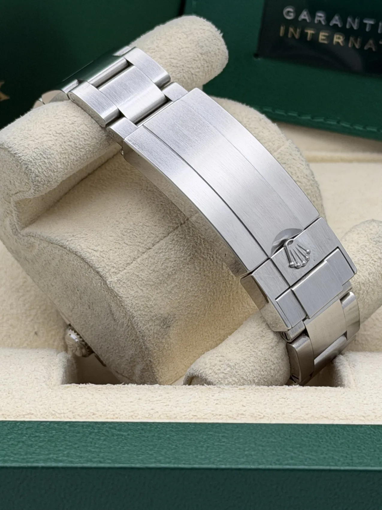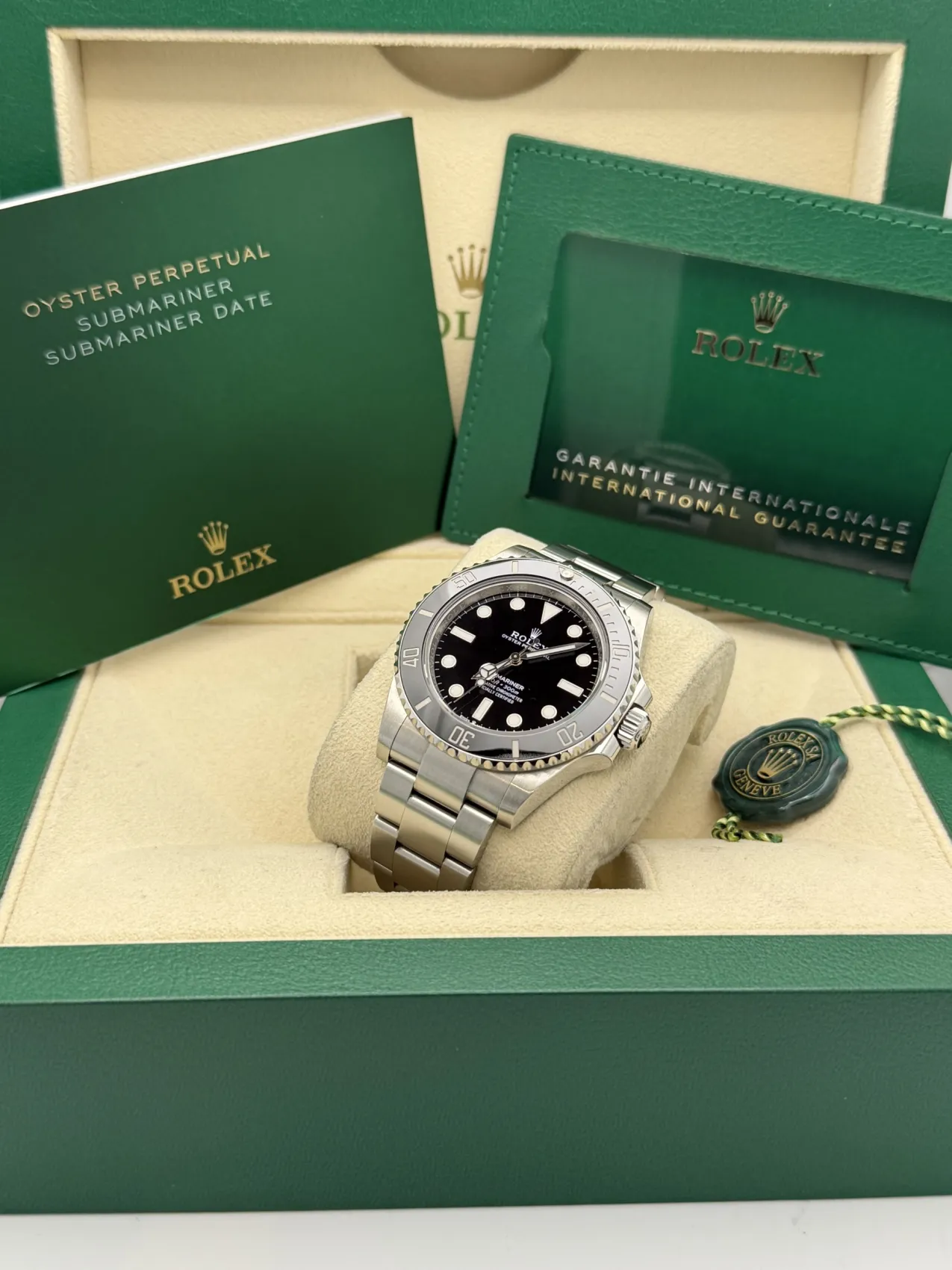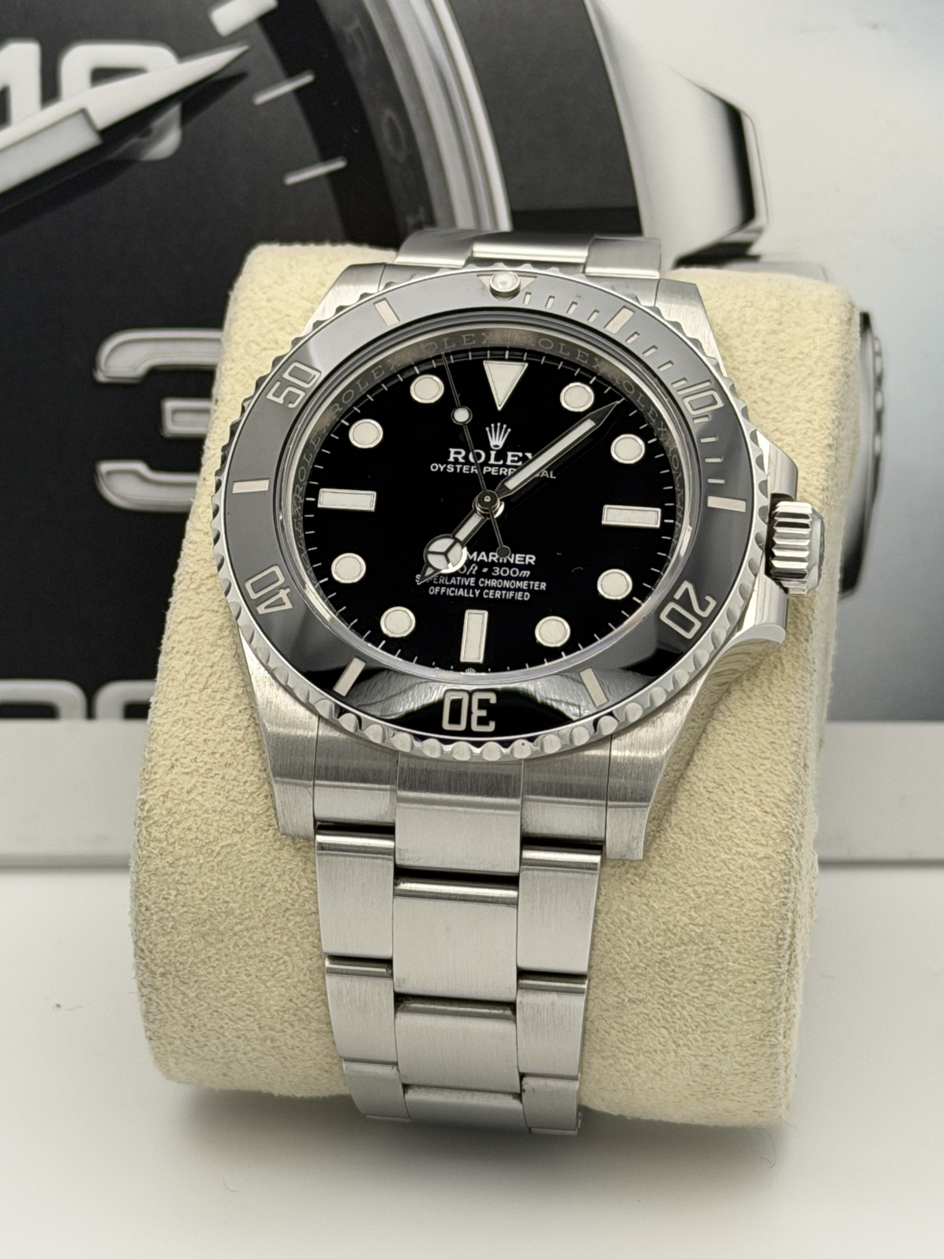 This Rolex Submariner No Date 41mm reference 124060 features a stainless steel case paired with a black dial and matching black Cerachrom bezel insert. Clean, symmetrical, and instantly recognisable, the no-date Submariner is considered by many to be the purest expression of Rolex’s legendary dive watch.Fitted to the robust Oyster bracelet with Oysterlock safety clasp and Glidelock extension system, it provides exceptional comfort and practical micro-adjustability. Powered by the Rolex calibre 3230 automatic movement, it benefits from Chronergy escapement technology and approximately 70 hours of power reserve, delivering outstanding precision and durability.Presented in excellent 2023 condition, this current-generation 41mm Submariner No Date combines modern proportions with timeless appeal, making it one of the most versatile and sought-after Rolex sports watch.